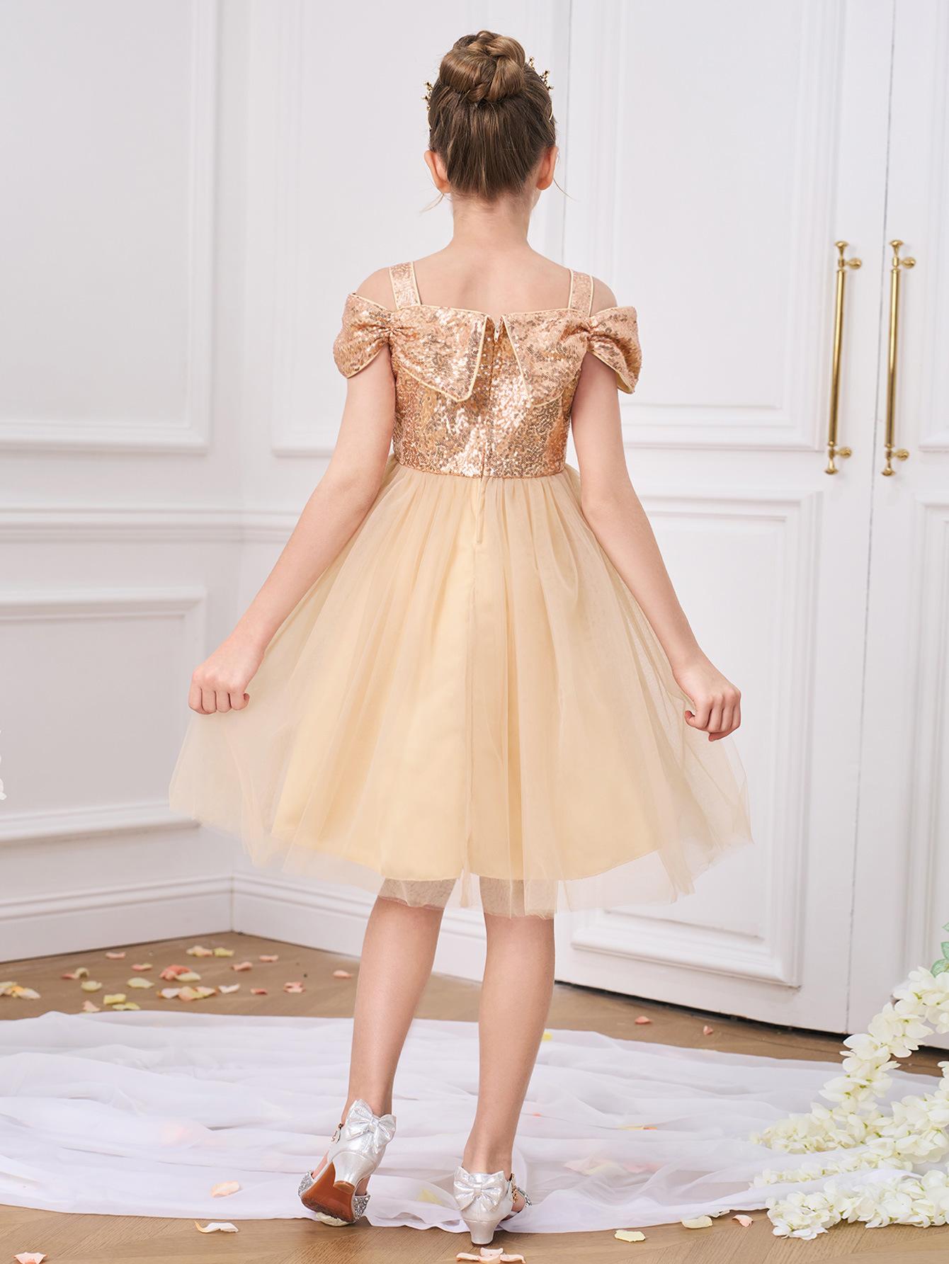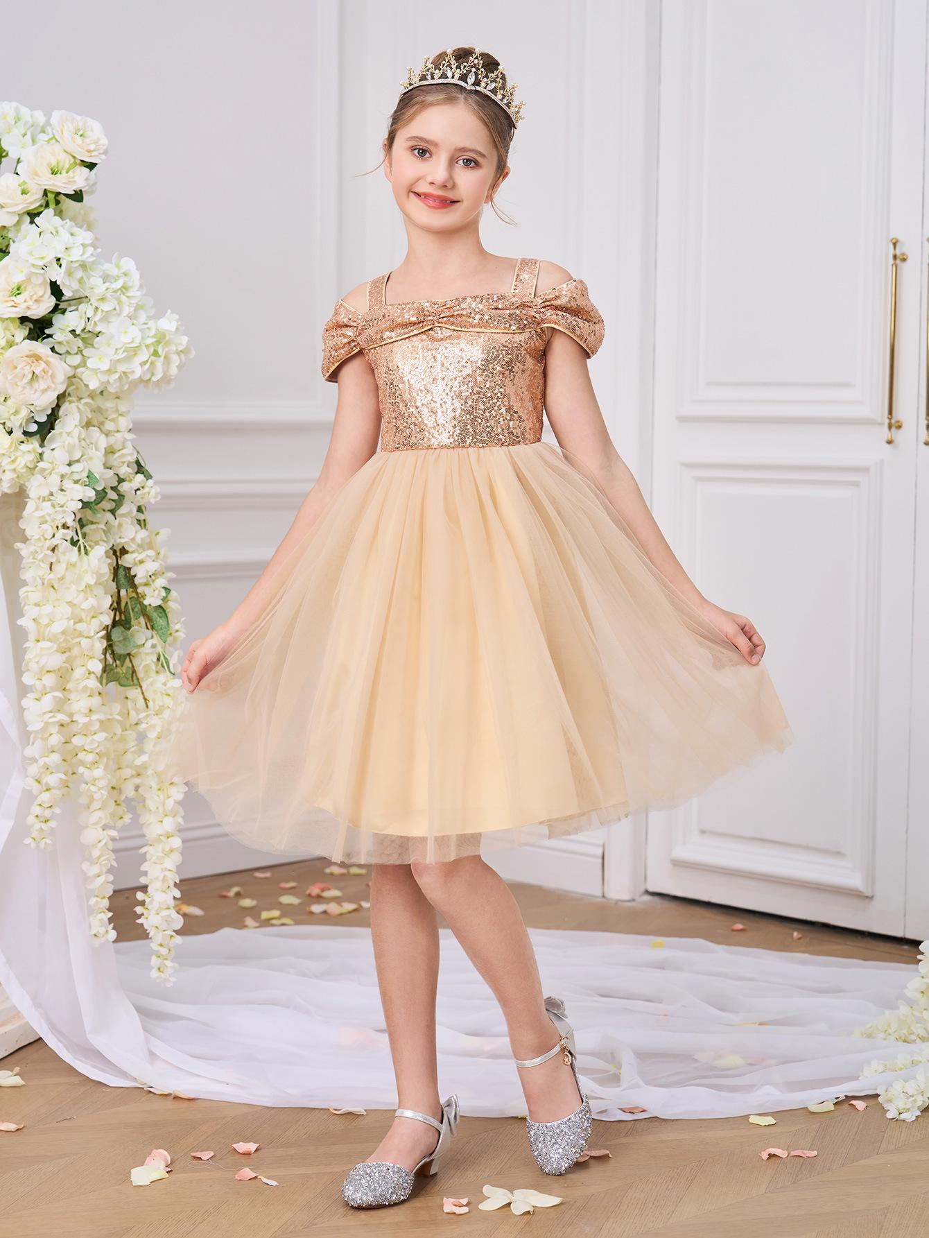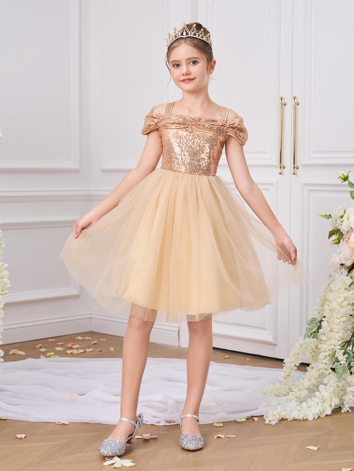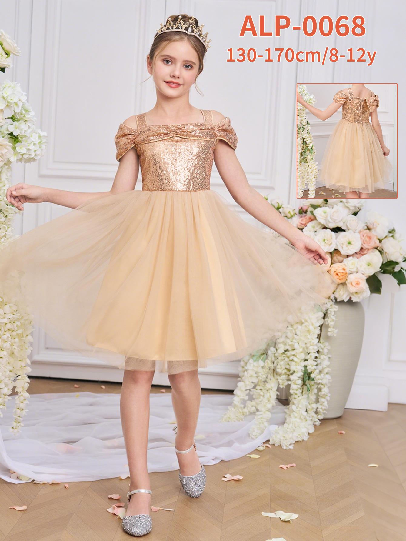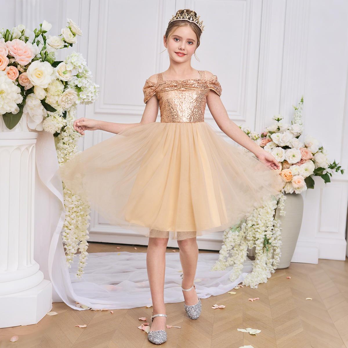 Nuevo Vestido de Princesa para Niñas Europeas y Americanas Vestido de Niña de las Flores Bordado con Lentejuelas y Lazo para Niñas Pequeñas Vestido de Noche Elegante