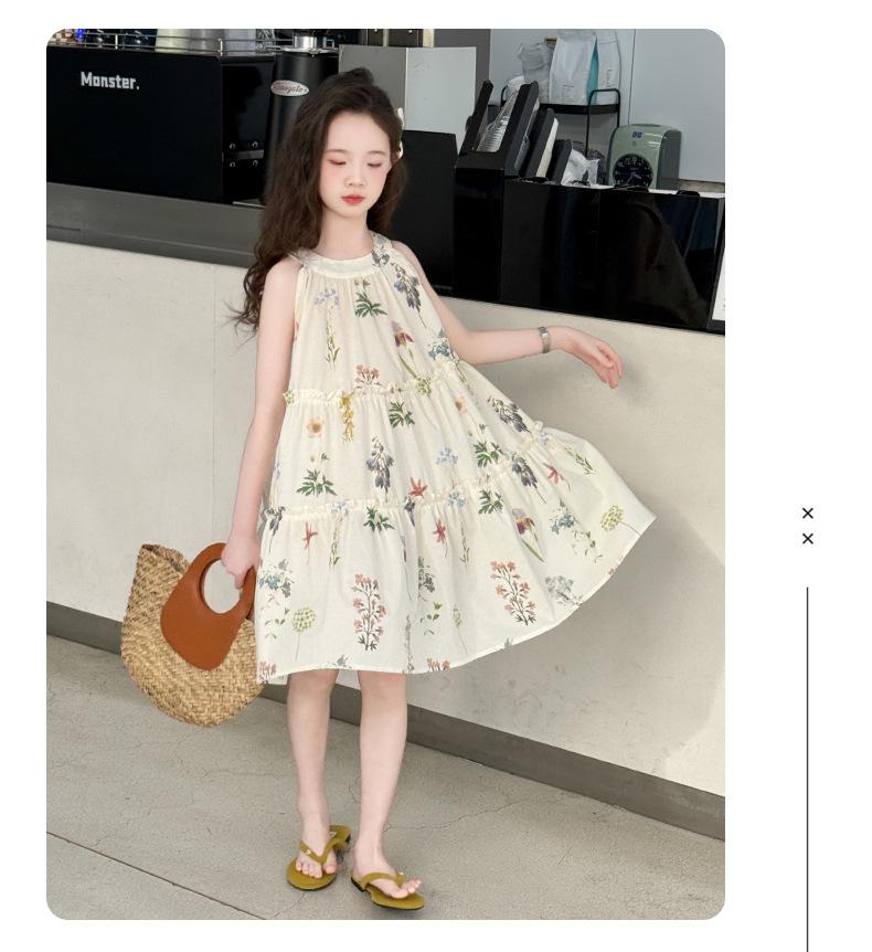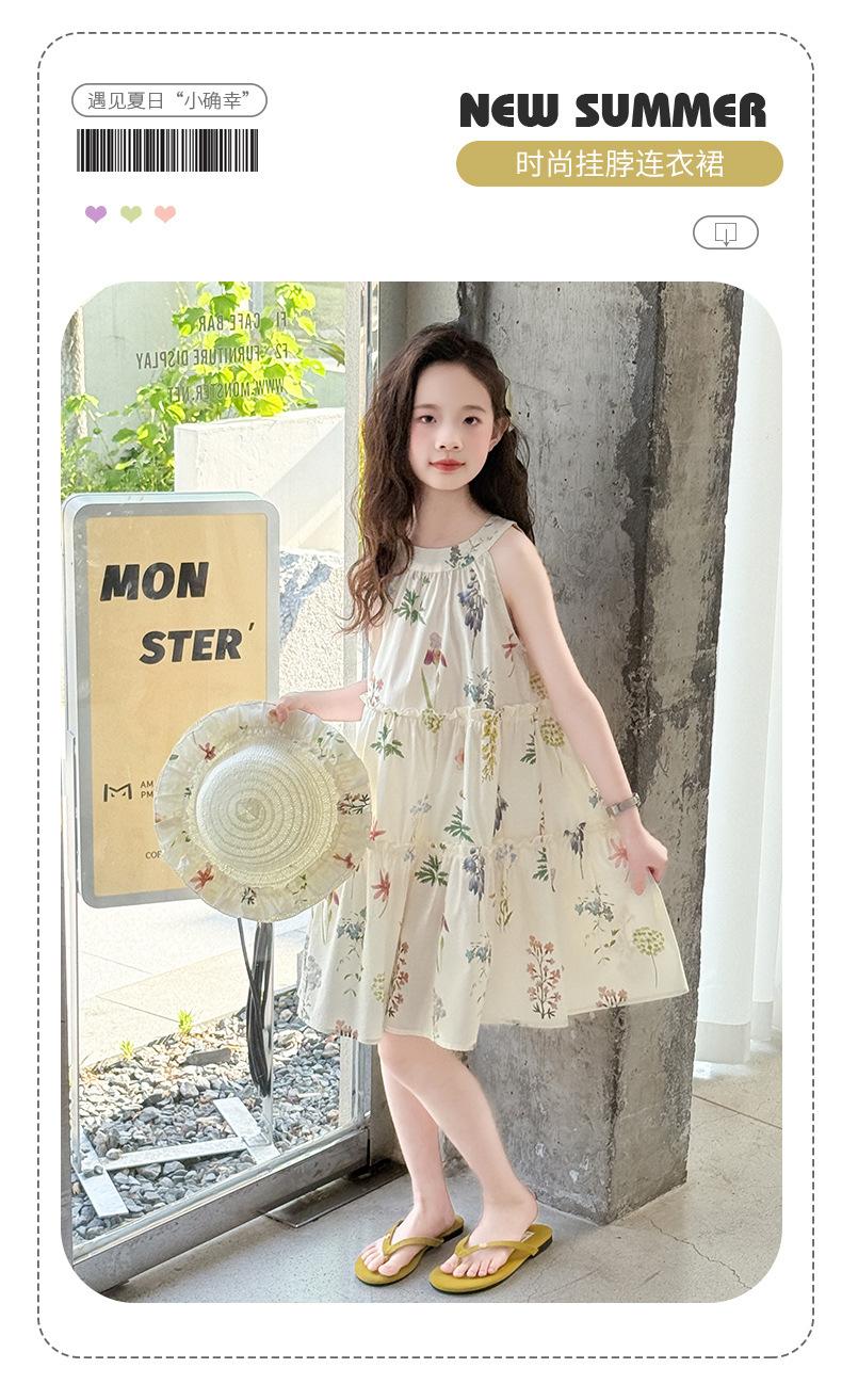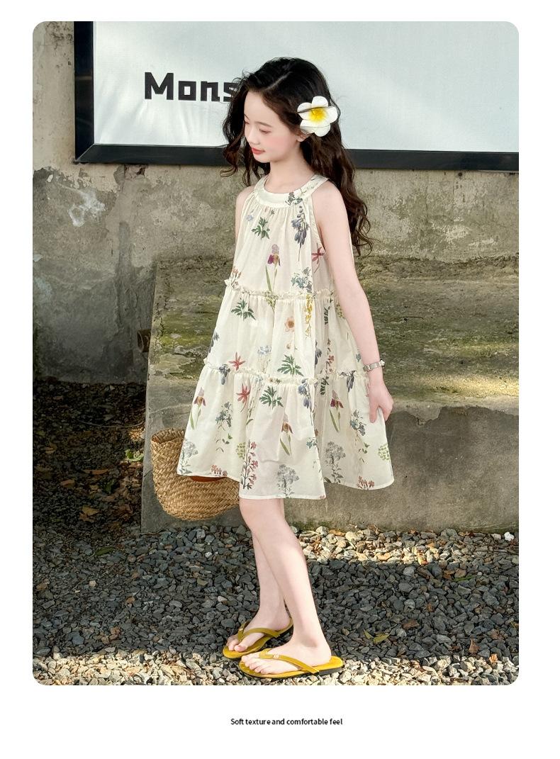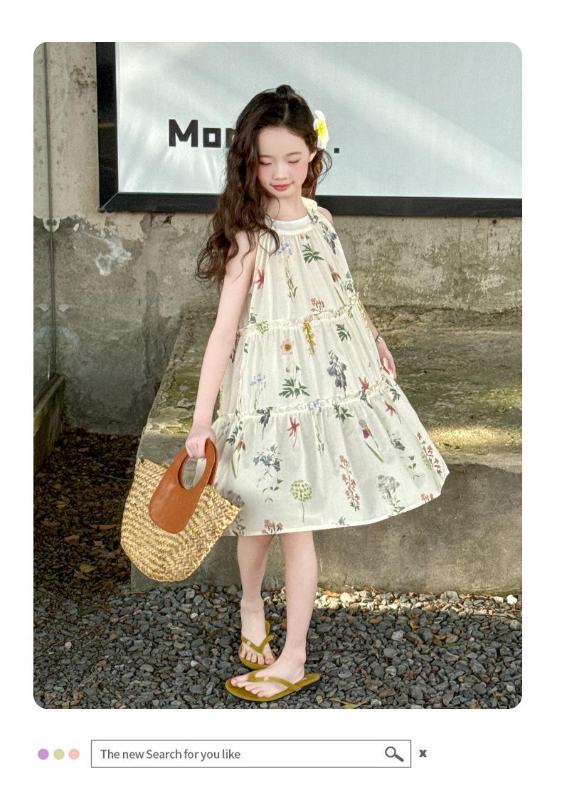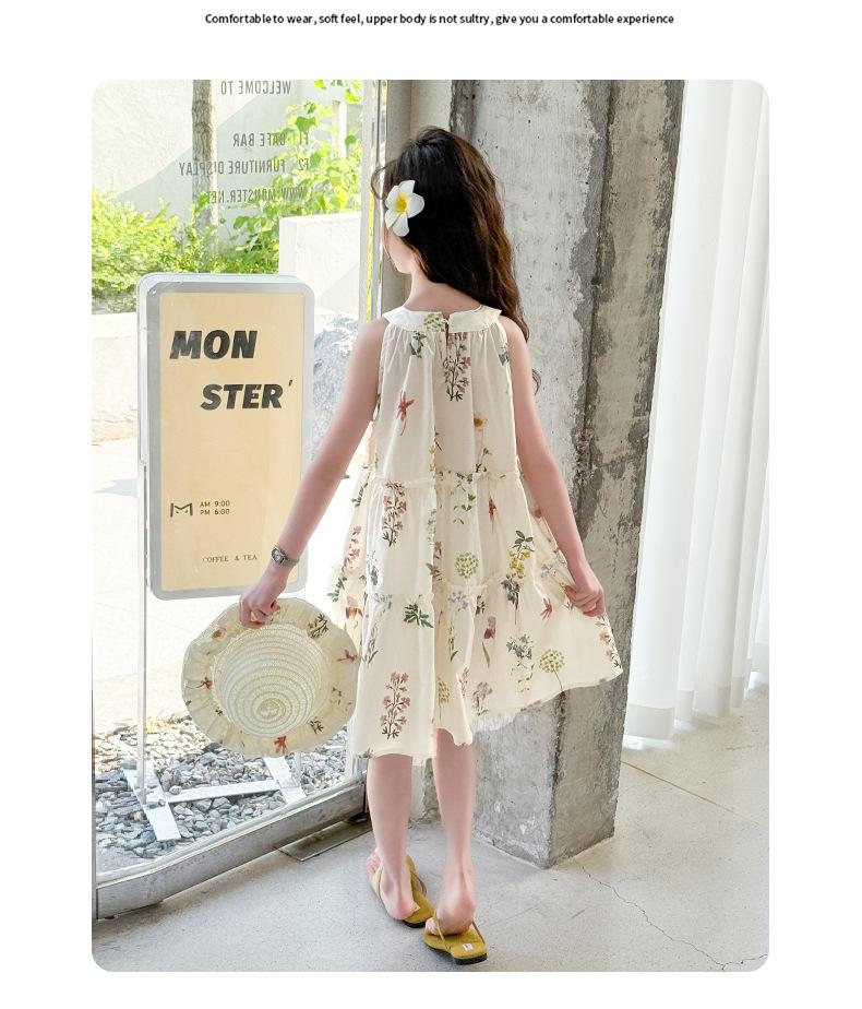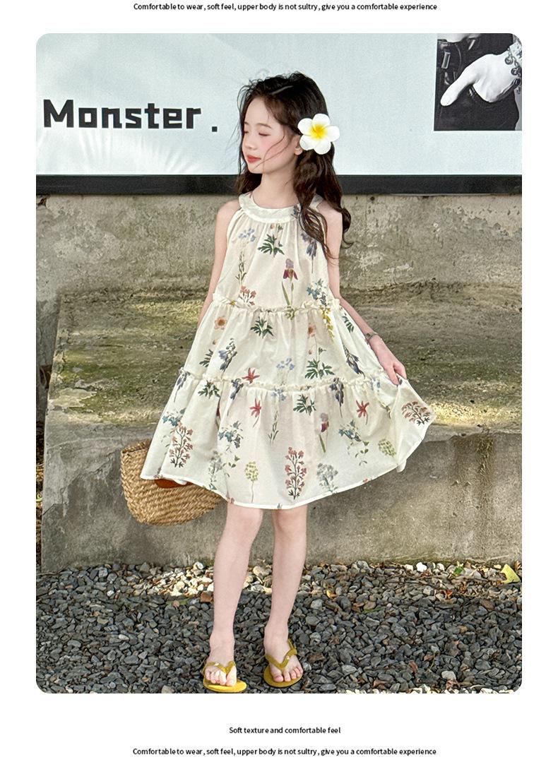 Vestido de Verano para Niñas 2025 Nuevo Estilo Halterneck Falda Floral Mediana y Grande Elegante Falda de Princesa Falda Midi Falda para Niñas