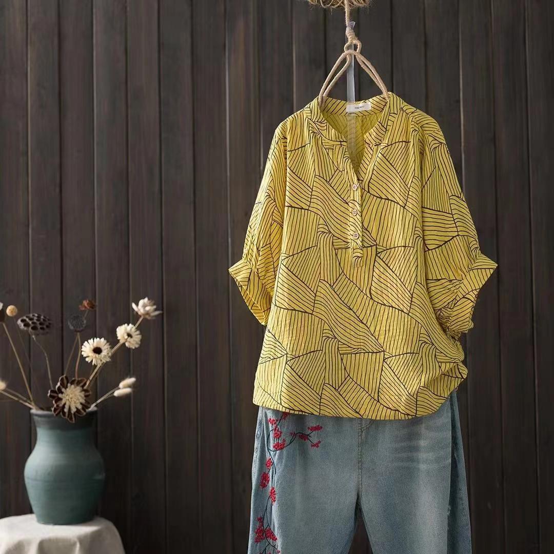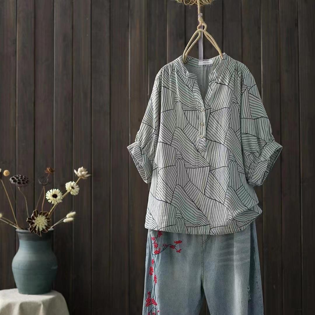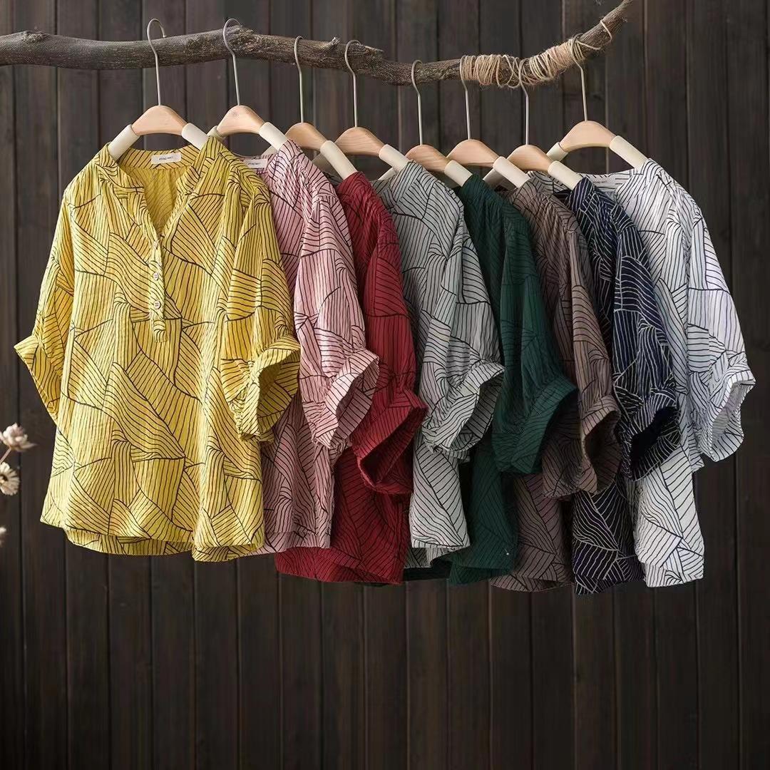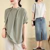 Camiseta Vintage Adelgazante de Cuello en V de Doble Capa de Hilo de Algodón de Manga Corta para Mujer Verano Nuevo Patchwork de Rayas Irregulares Top Holgado