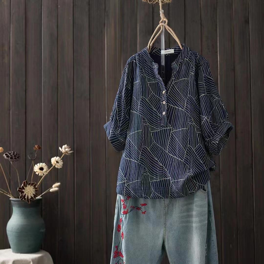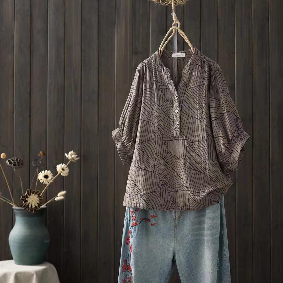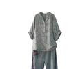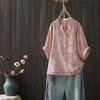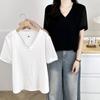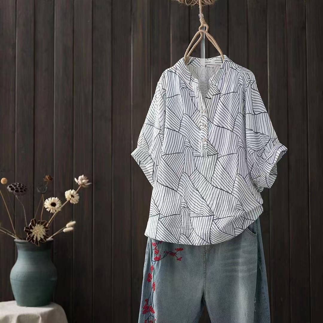 Camiseta Vintage Adelgazante de Cuello en V de Doble Capa de Hilo de Algodón de Manga Corta para Mujer Verano Nuevo Patchwork de Rayas Irregulares Top Holgado