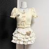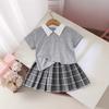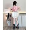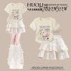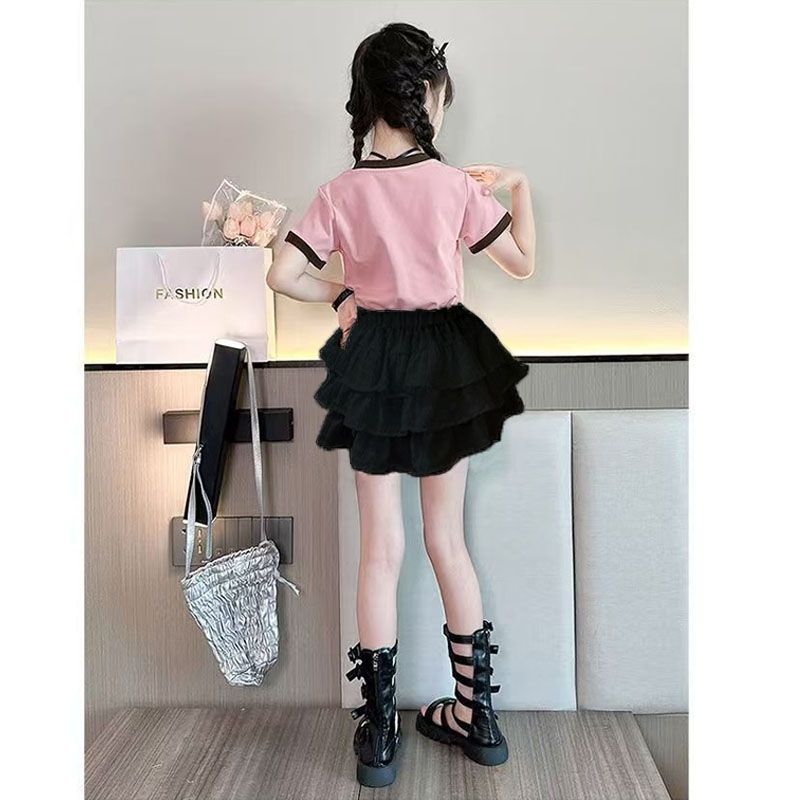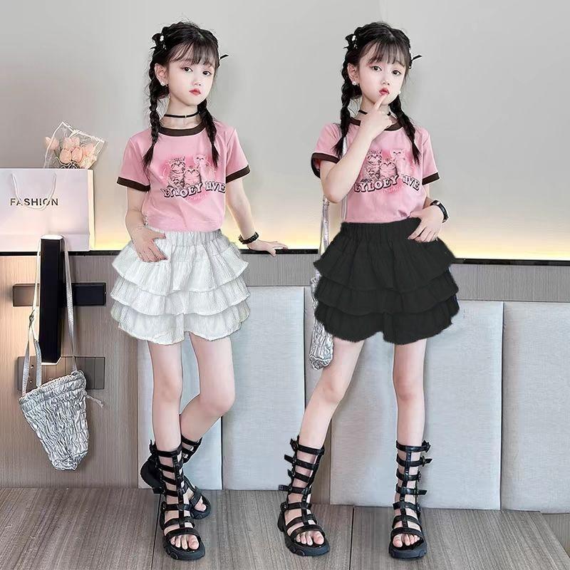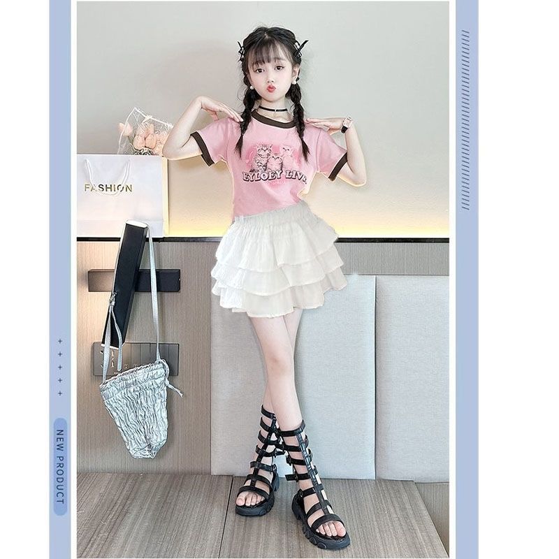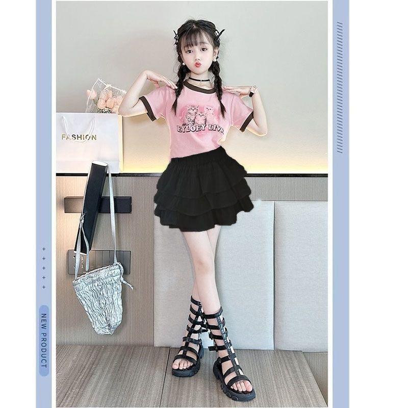 Traje de Falda Casual de Estilo Coreano para Niñas Celebridades de Internet para Niños Mayores Verano Nuevo Estilo Dibujos Animados Manga Corta Falda de Pastel Conjunto de Dos Piezas