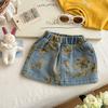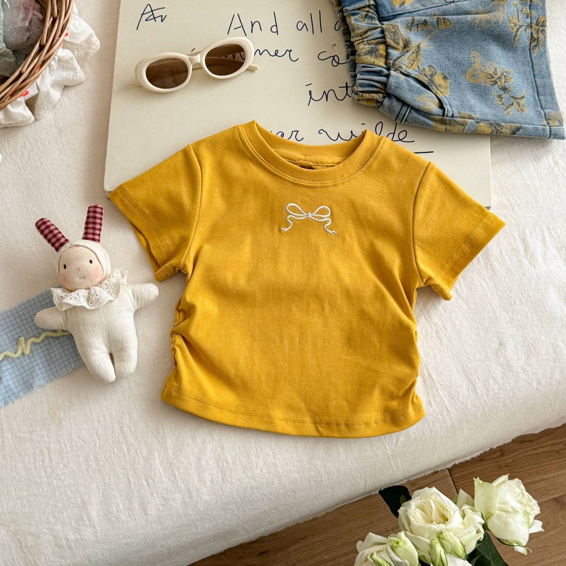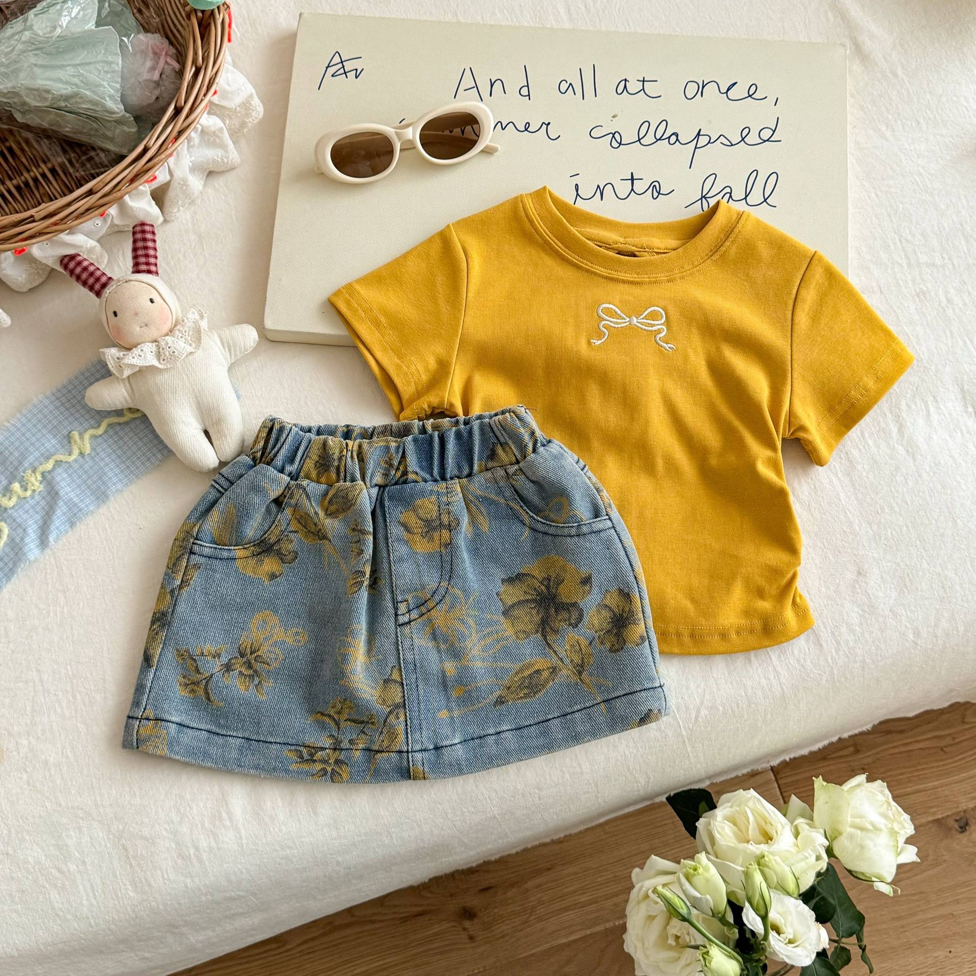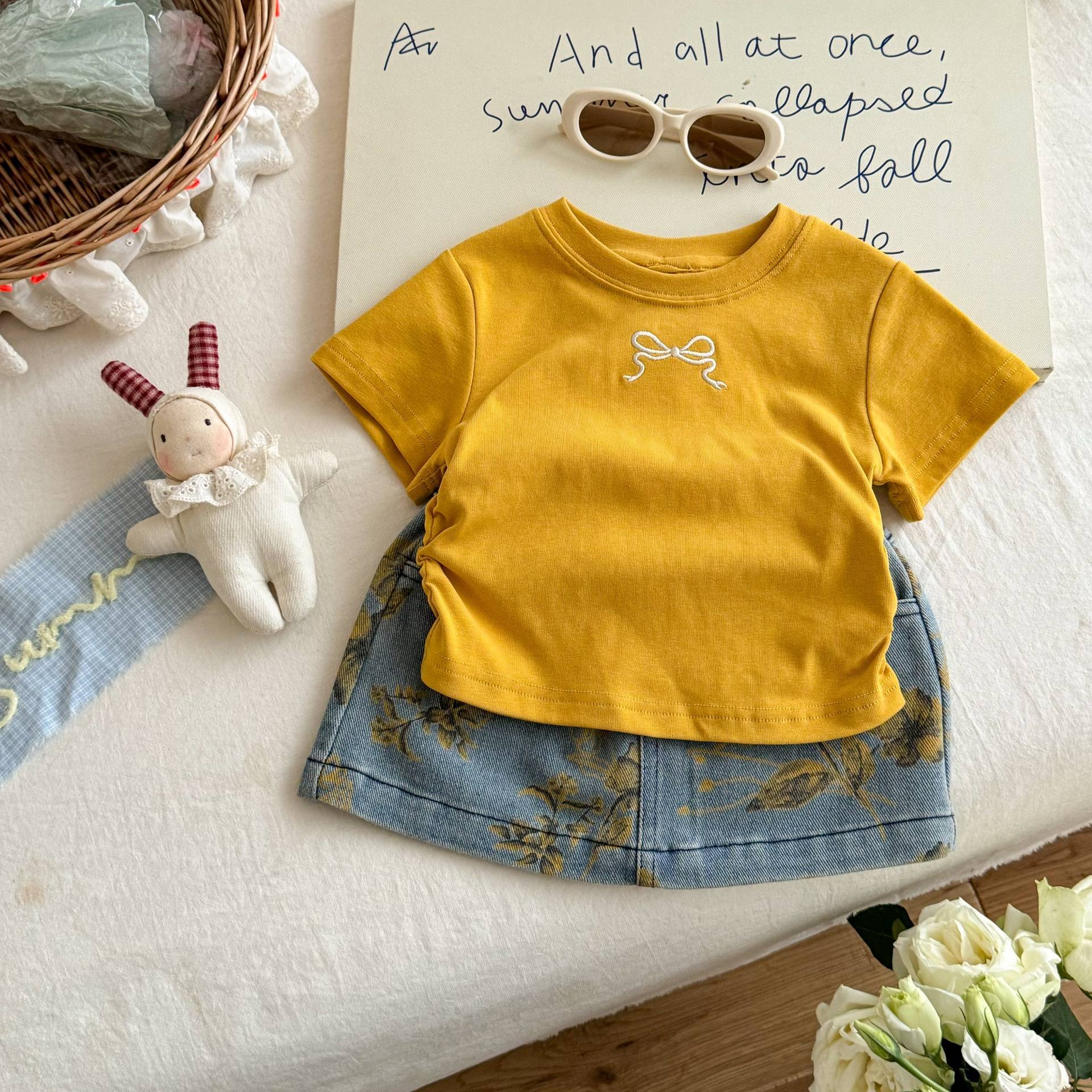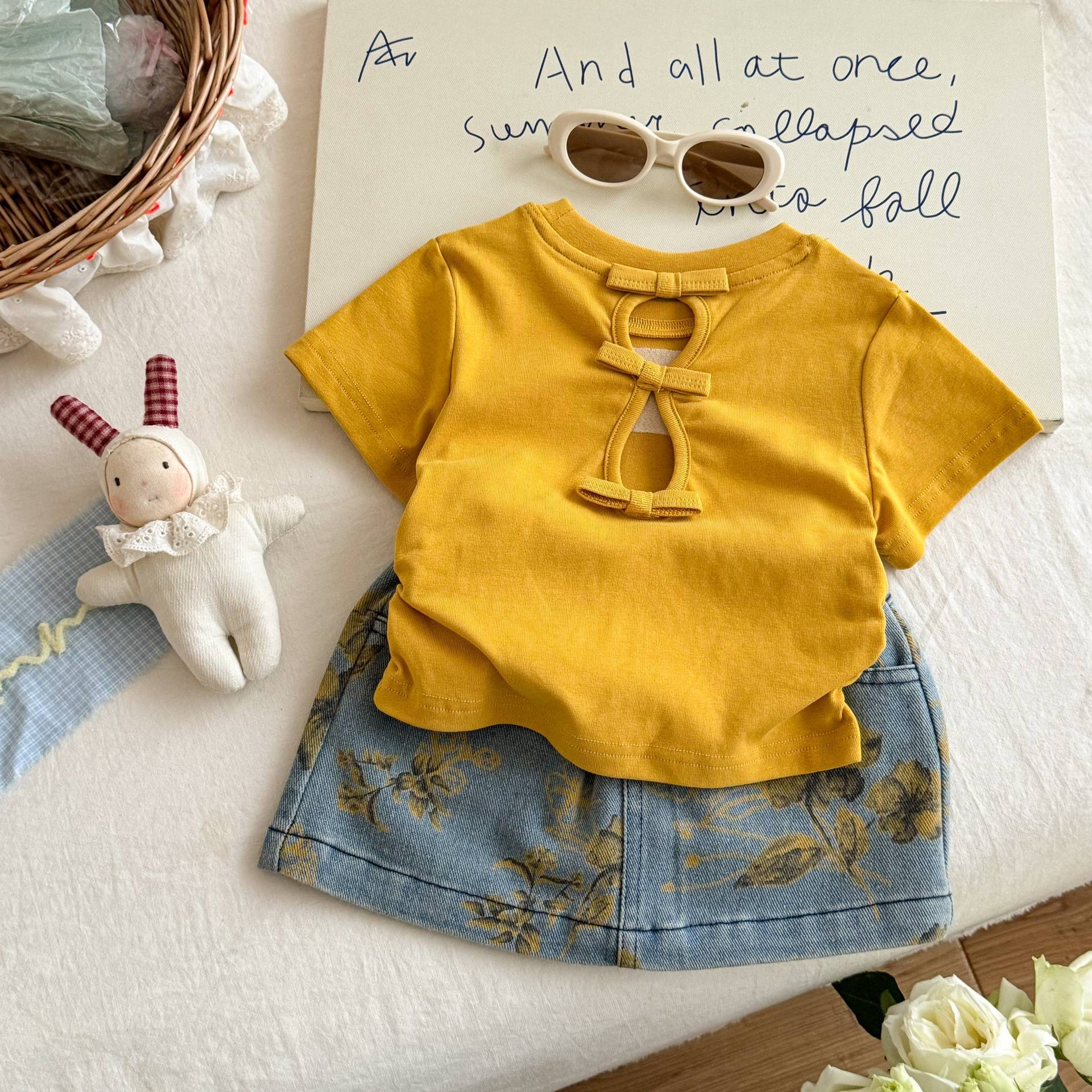 Traje de Verano Crema 2025 Nuevo Moda Bebé Jardín de Niños Camiseta de Lazo de Moda Falda de Mezclilla Conjunto de Dos Piezas Moderno