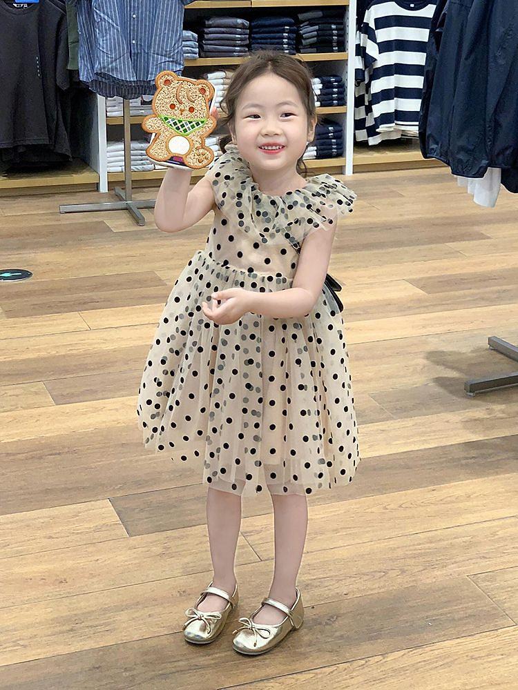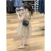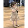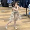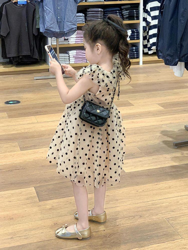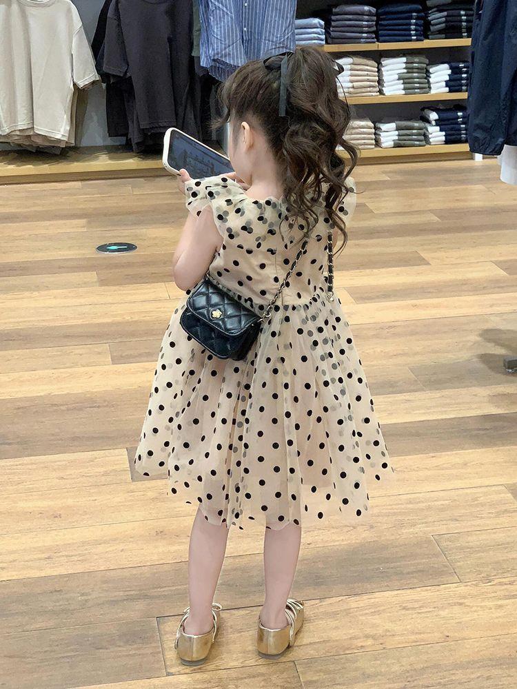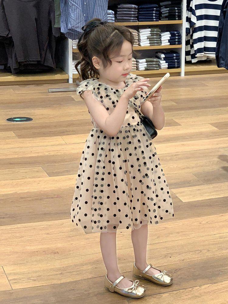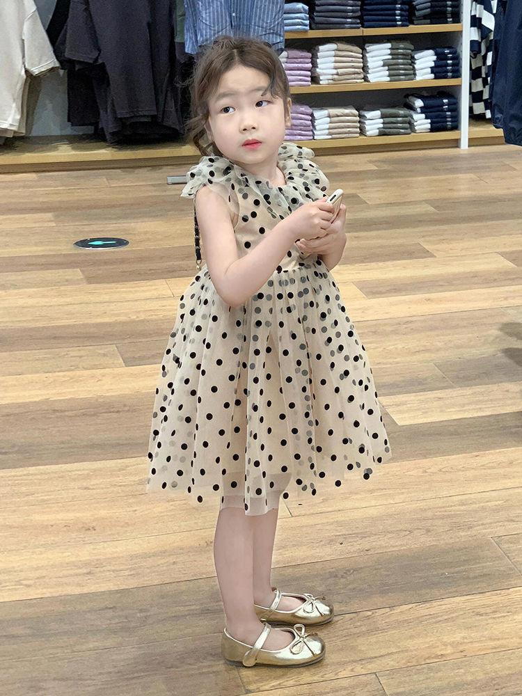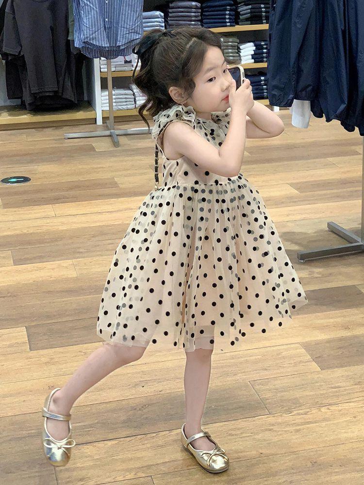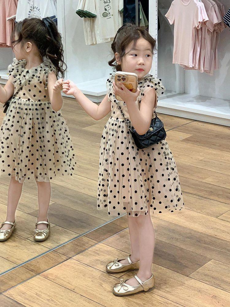 Vestido de Verano Nuevo Estilo Coreano para Niñas 2025 Vestido para Niños con Cuello de Encaje de Lunares Negros Falda de Malla Moderna para Bebé