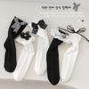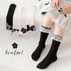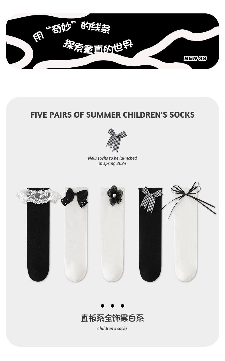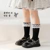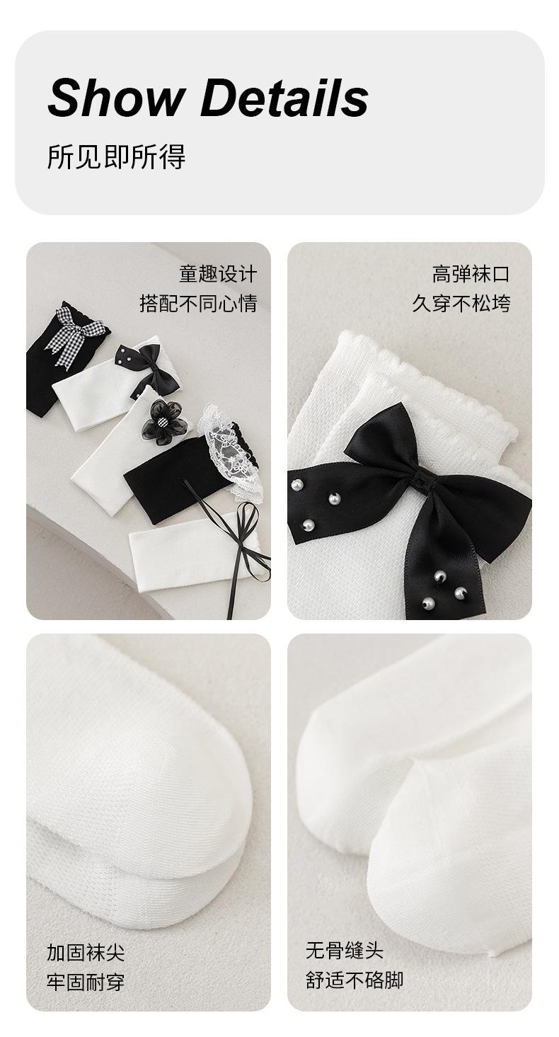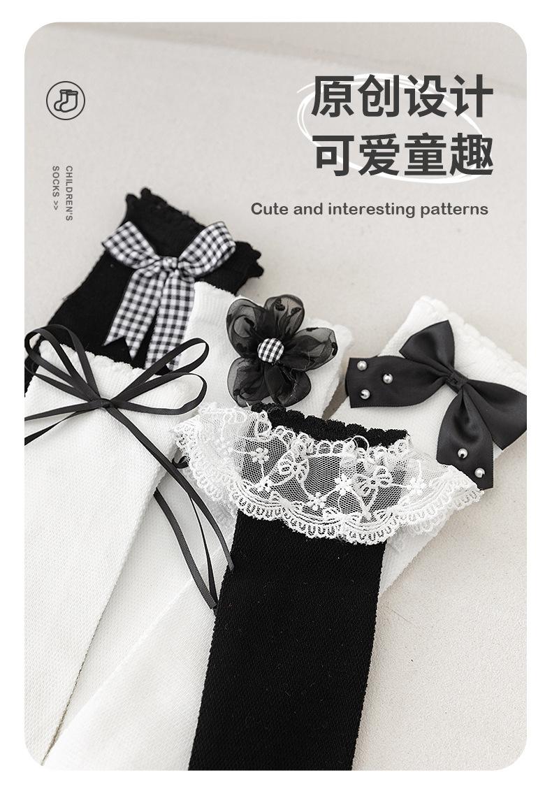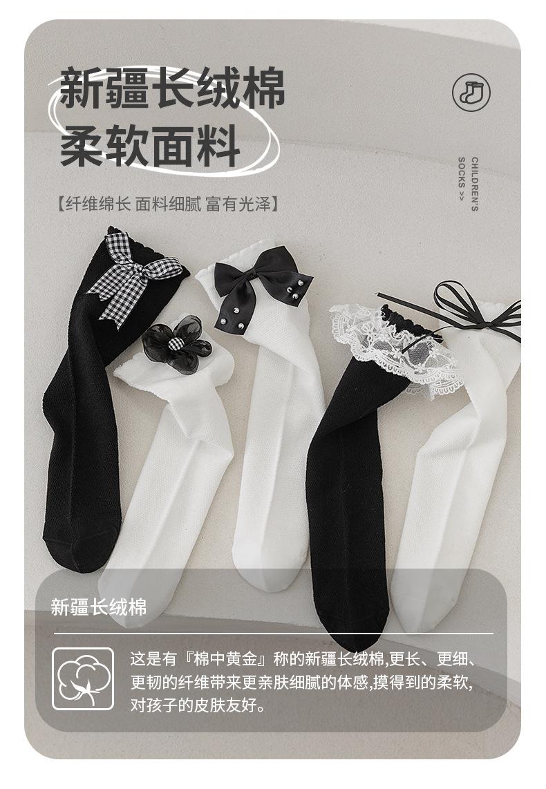 Un par de calcetines a media pantorrilla con una superficie de malla de algodón, 2 colores blanco y negro 001 encaje negro l 002 lazo blanco y negro 003 Blanco Cinco Flores Negras 004 lazo de cuadros negros 005 lazo de cuerda delgada blanco
