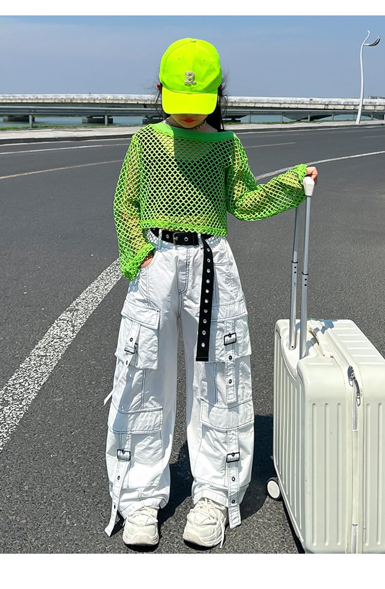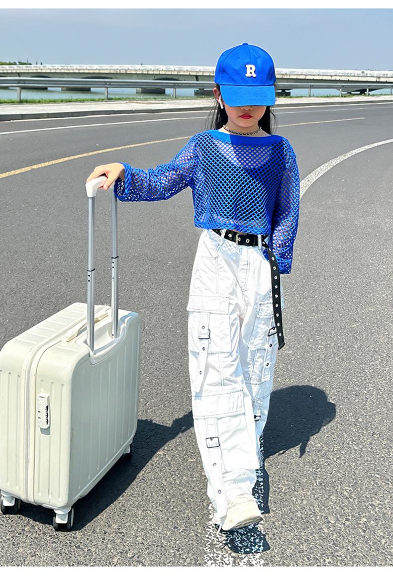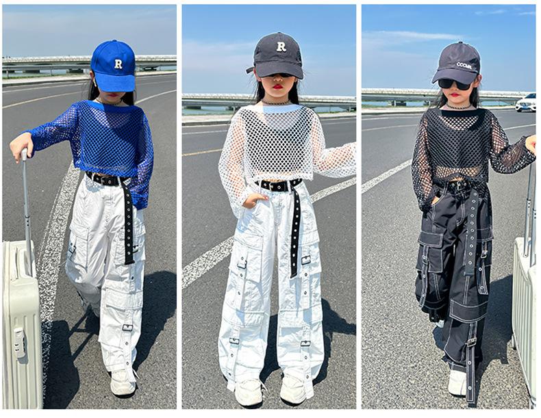 Single piece of white pants, Single piece of black pants, Single white net t, Single black net t, Single blue ...