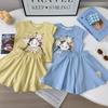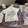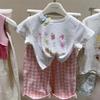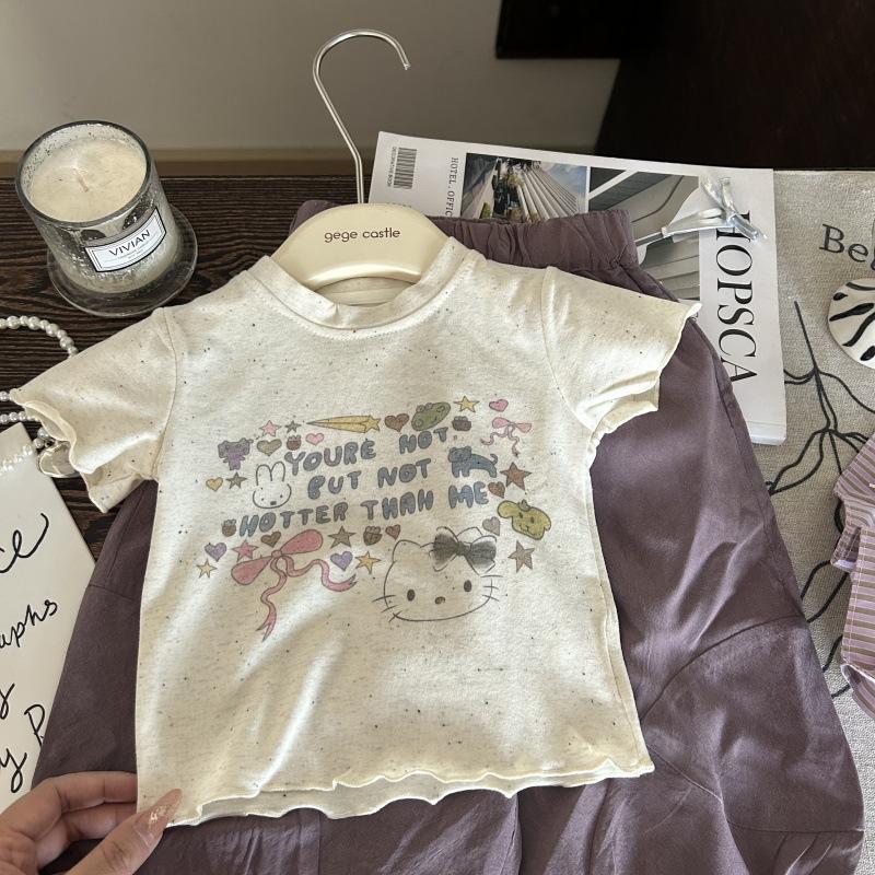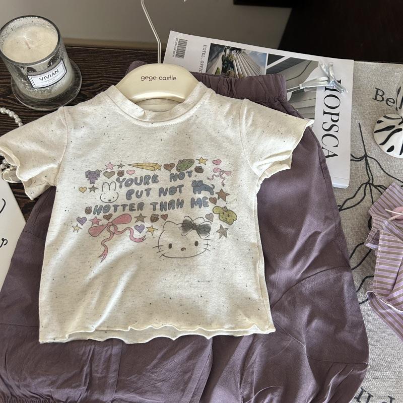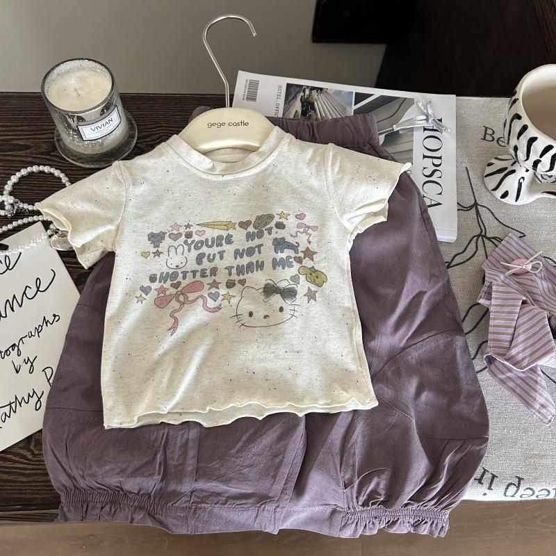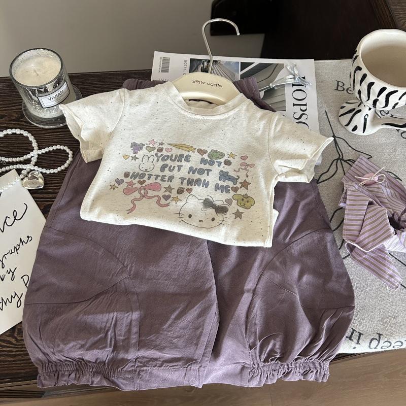 Ropa coreana para niños 2025 nuevo verano niñas camiseta de manga corta estampada con dibujos animados pantalones cortos morados para niños conjunto de dos piezas
