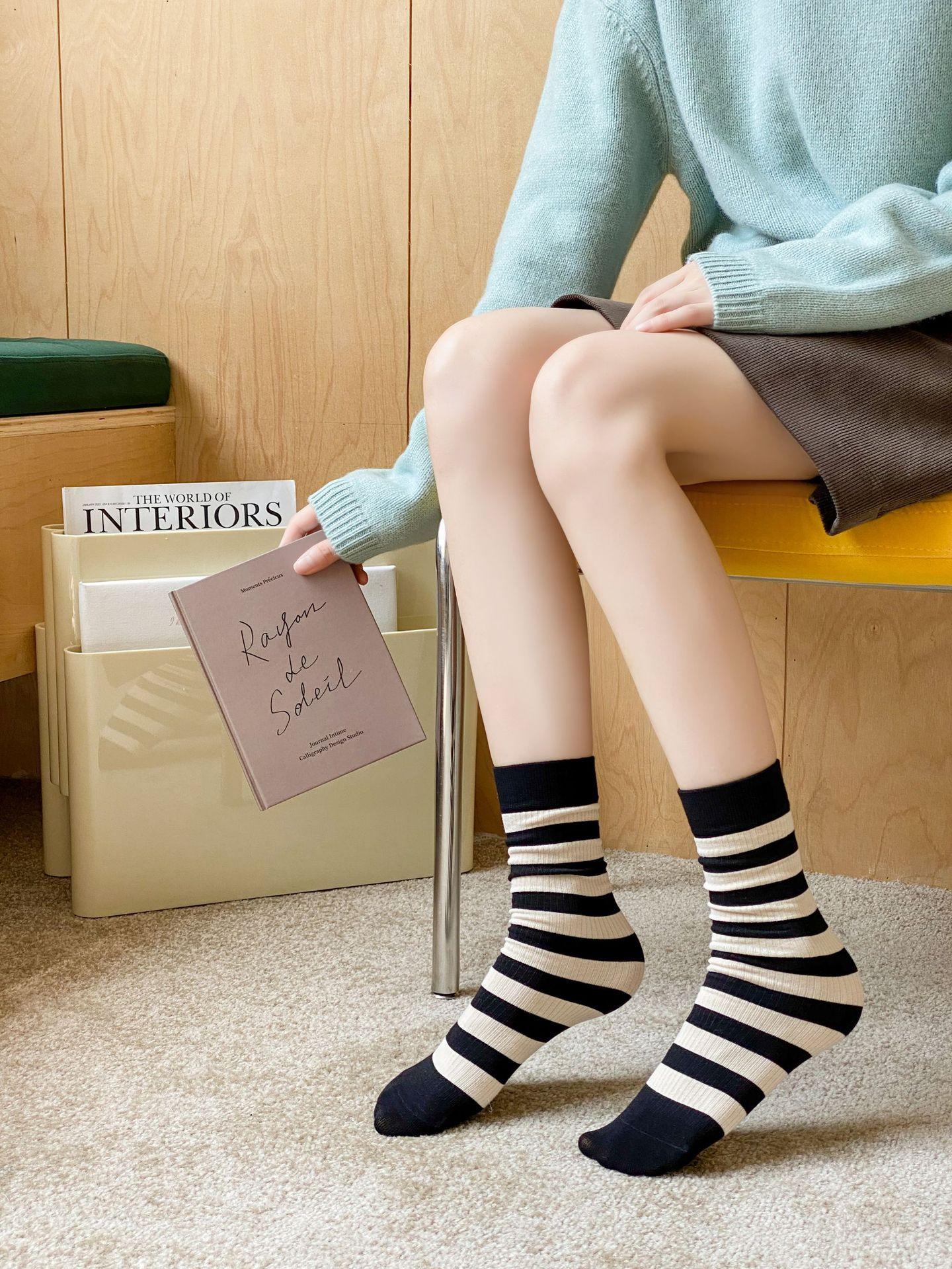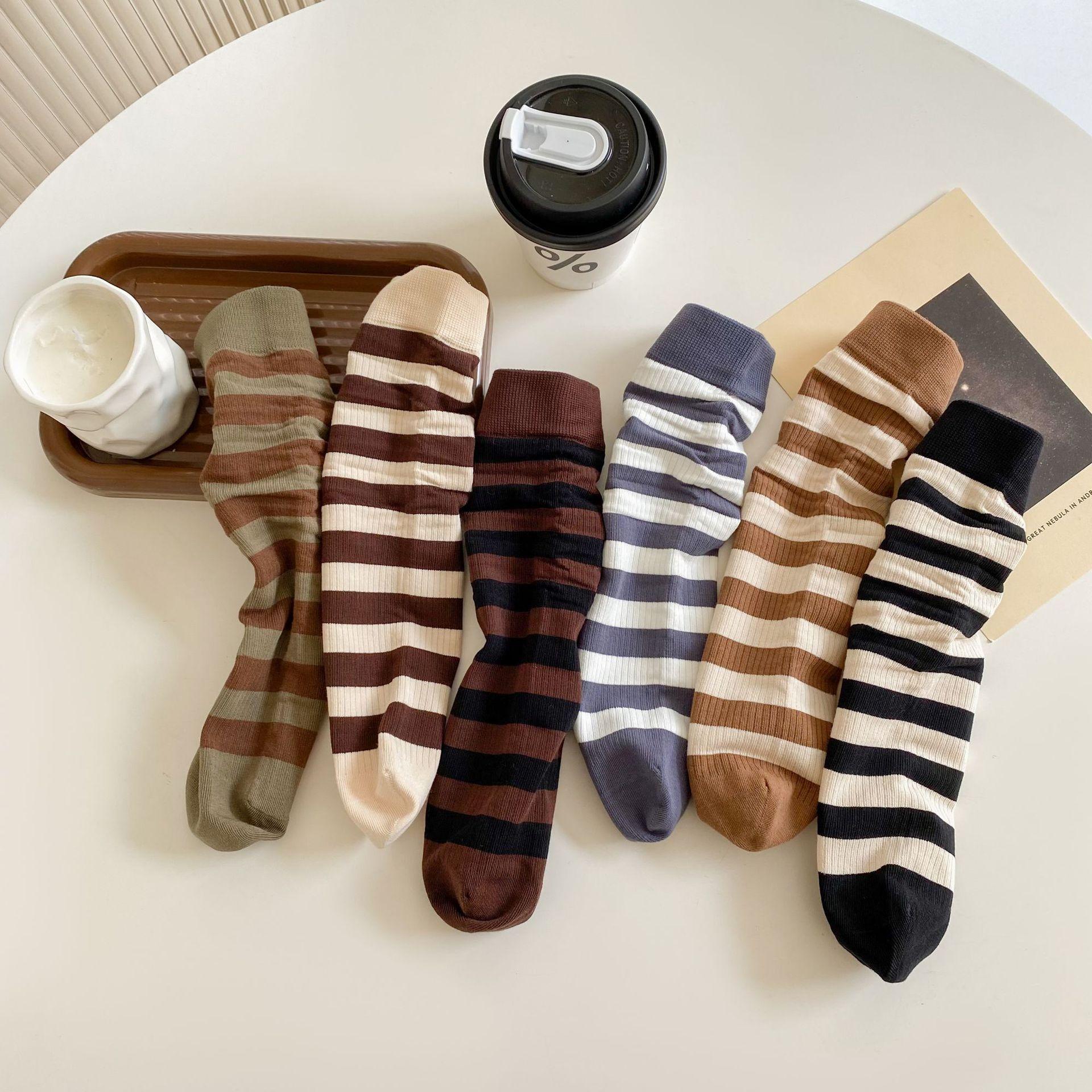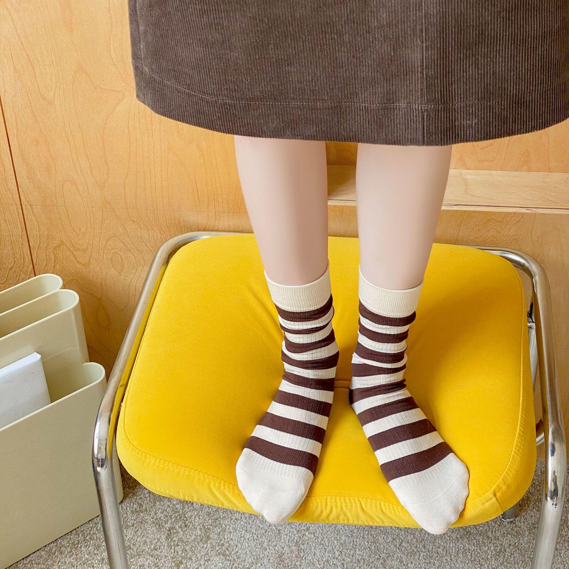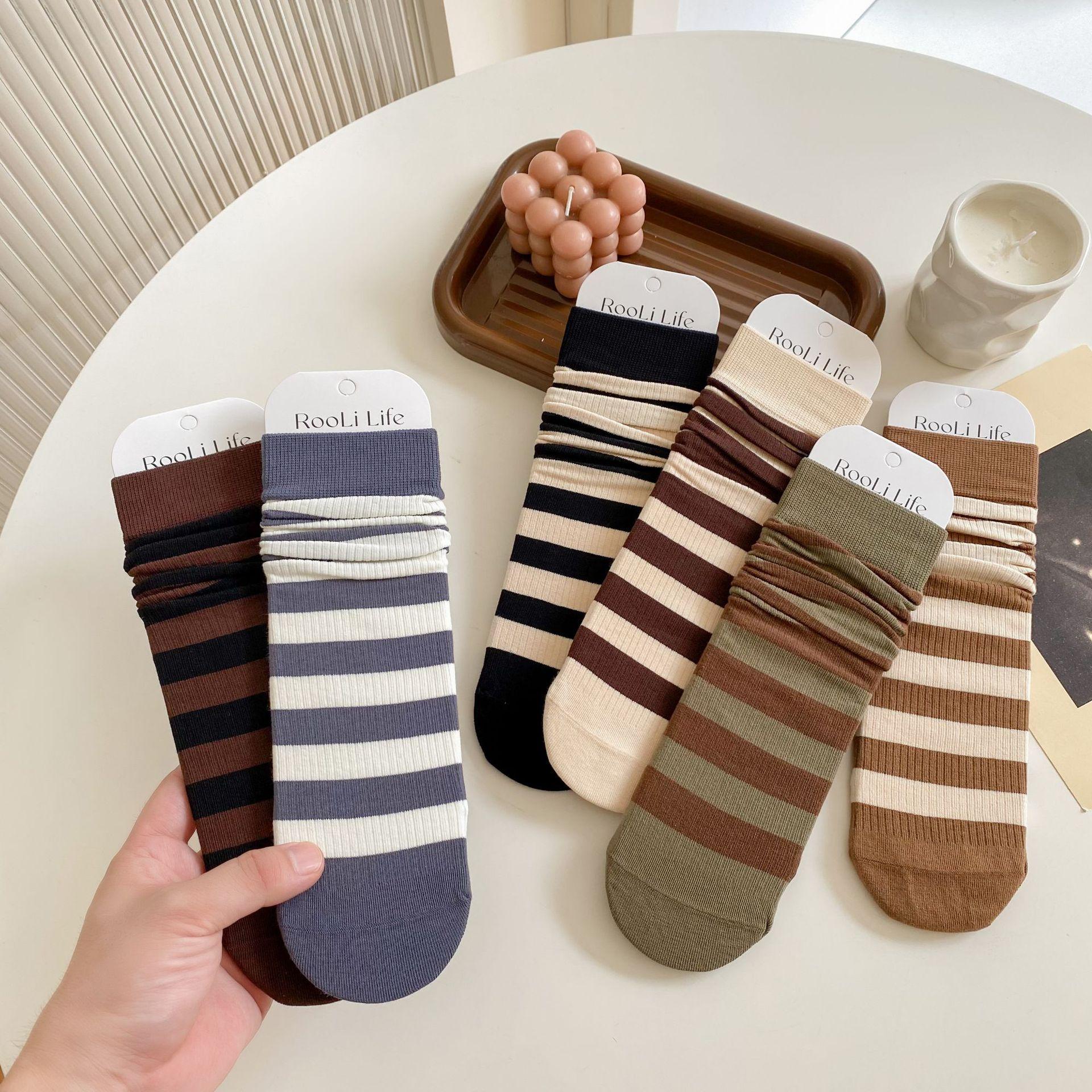 Calcetines holgados a rayas modernos que absorben el sudor para mujer Versátiles Moda Ins Otoño e Invierno Estilo universitario Calcetines de media caña Calcetines de algodón sin costuras Bloque de color