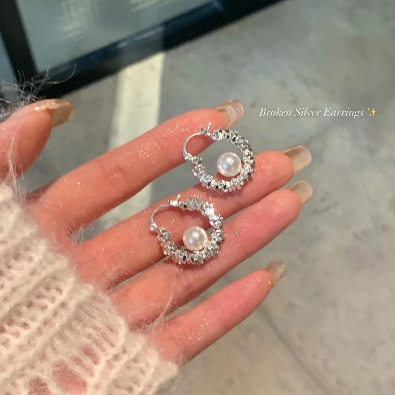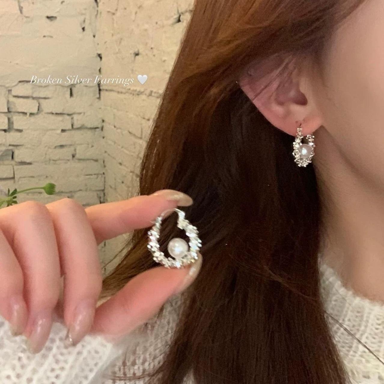 Anillo de perla plateada rota flash de primavera y verano hebilla de oreja pendientes de alto temperamento pendientes de personalidad única para mujer pendientes pendientes