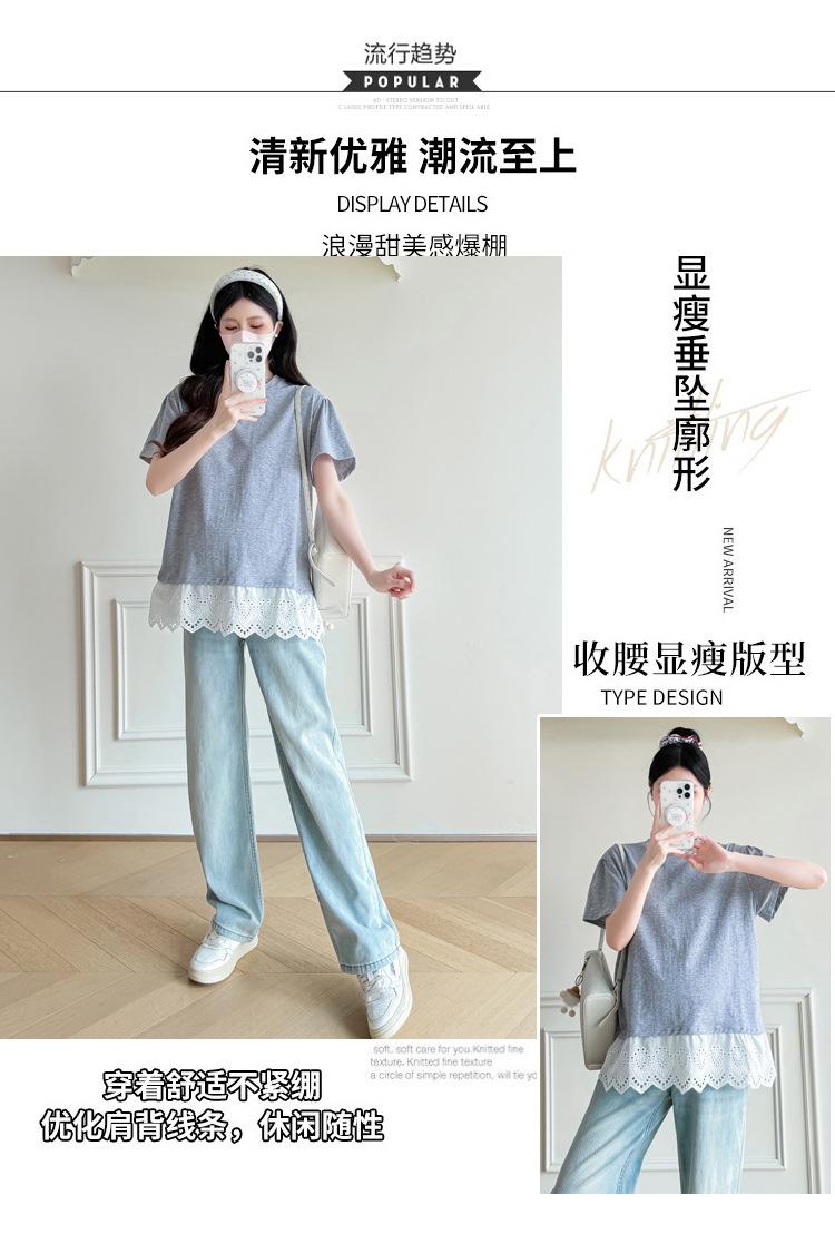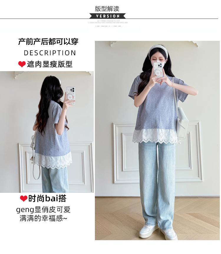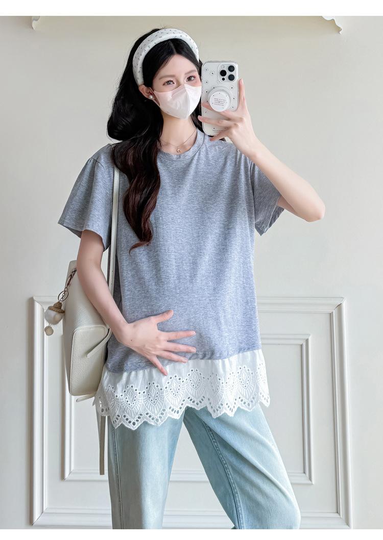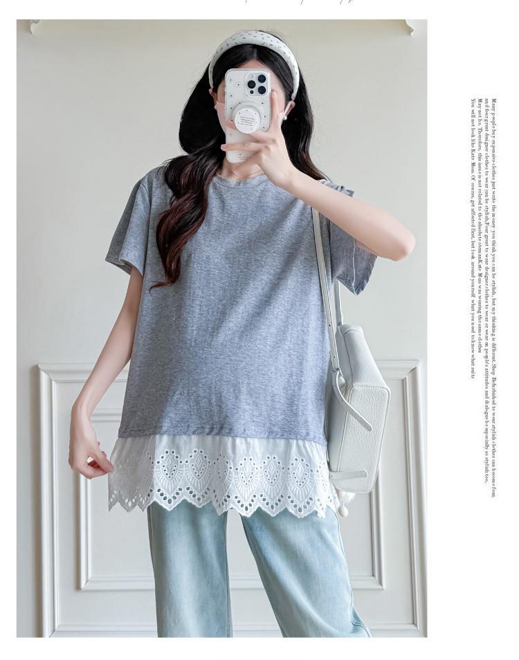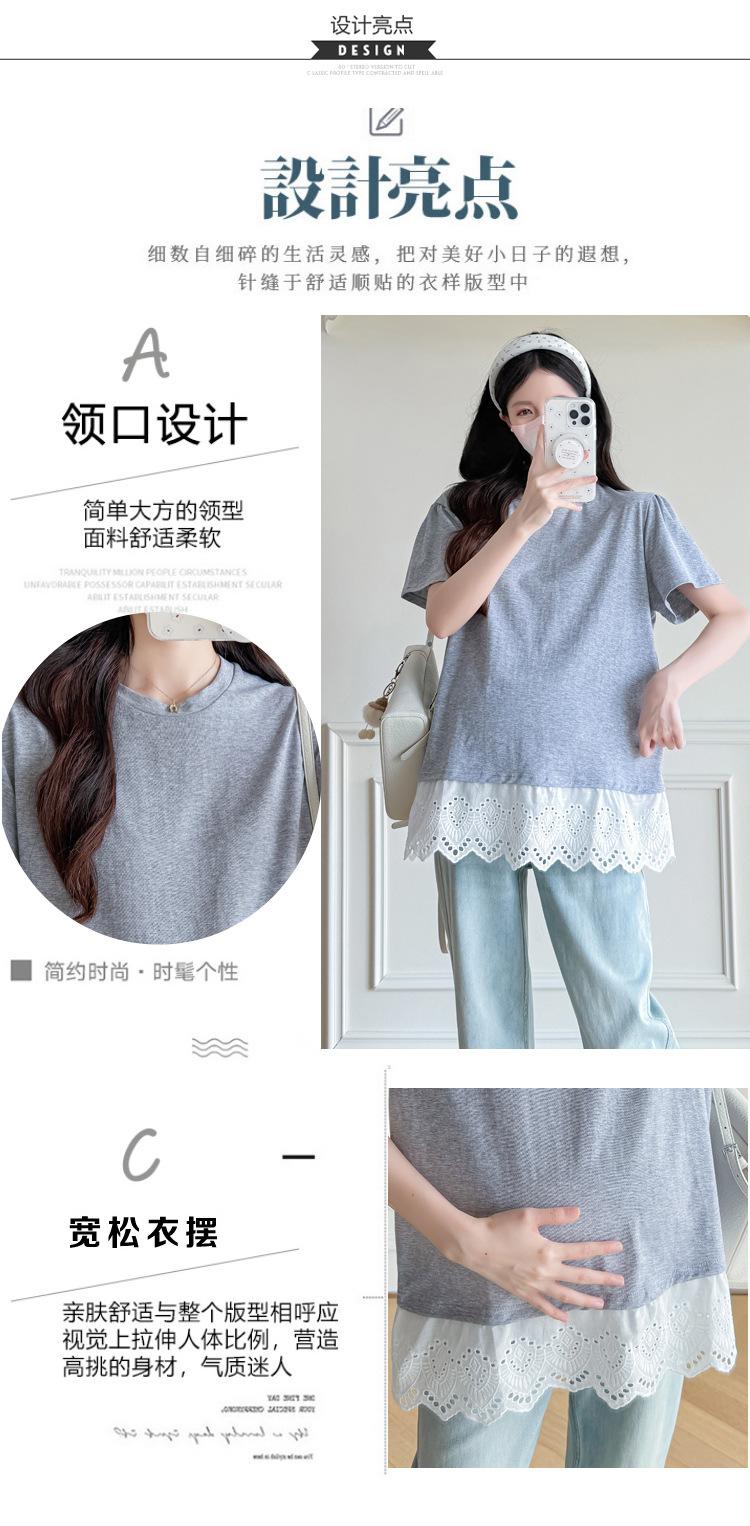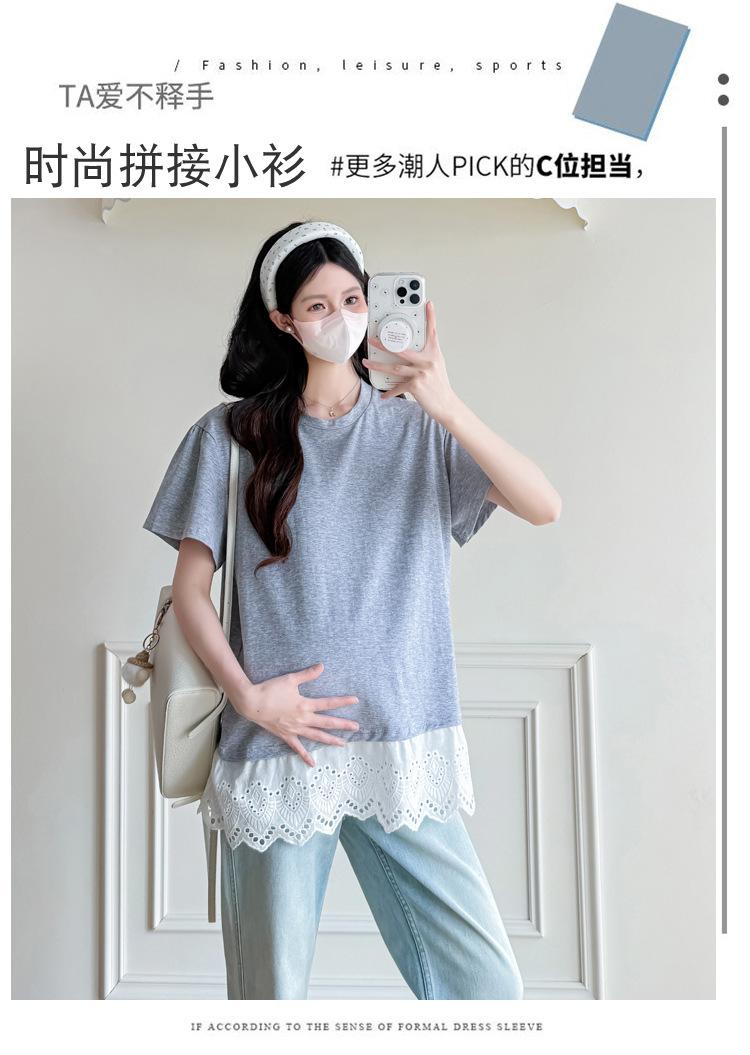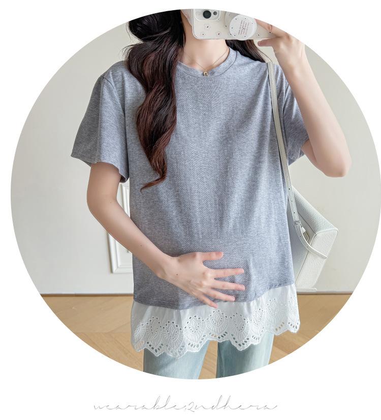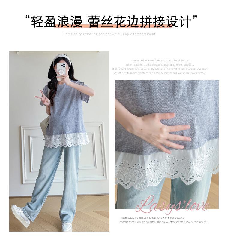 Ropa de Maternidad 2025 Verano Nueva Moda Elegante Diseño de Camiseta de Manga Corta Encaje Holgado Revelador Top de Maternidad