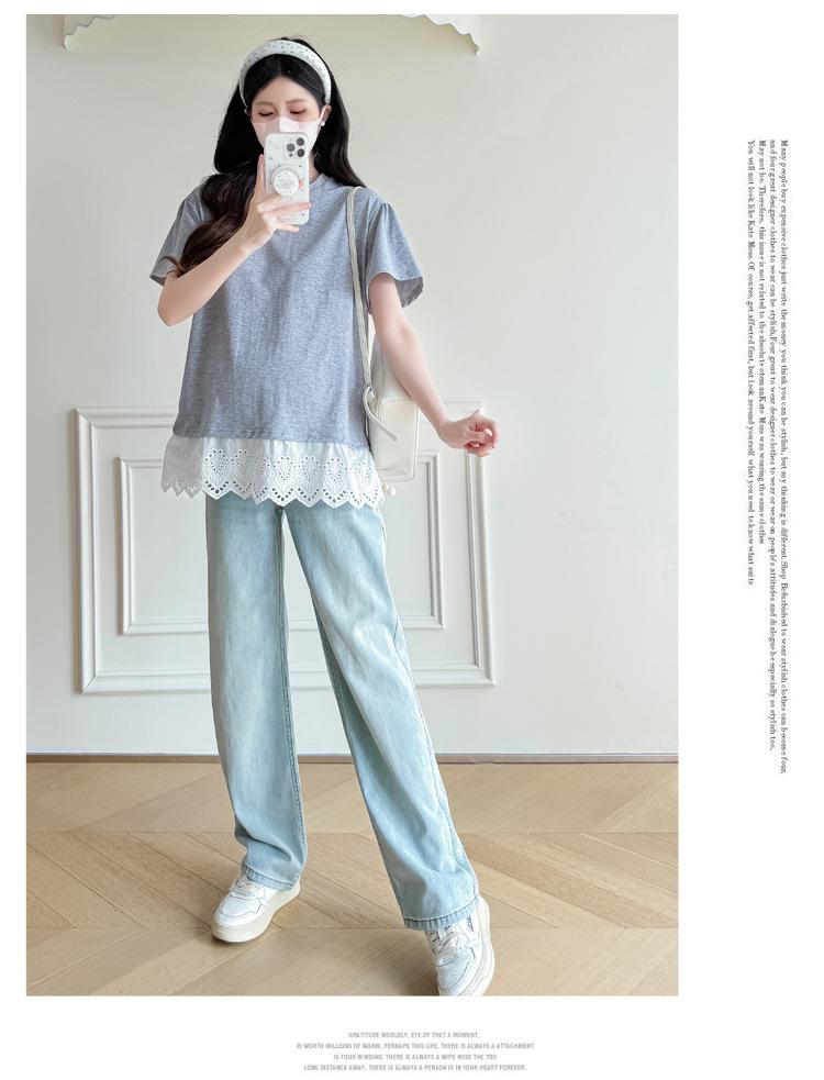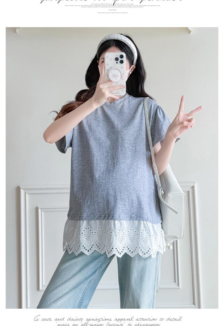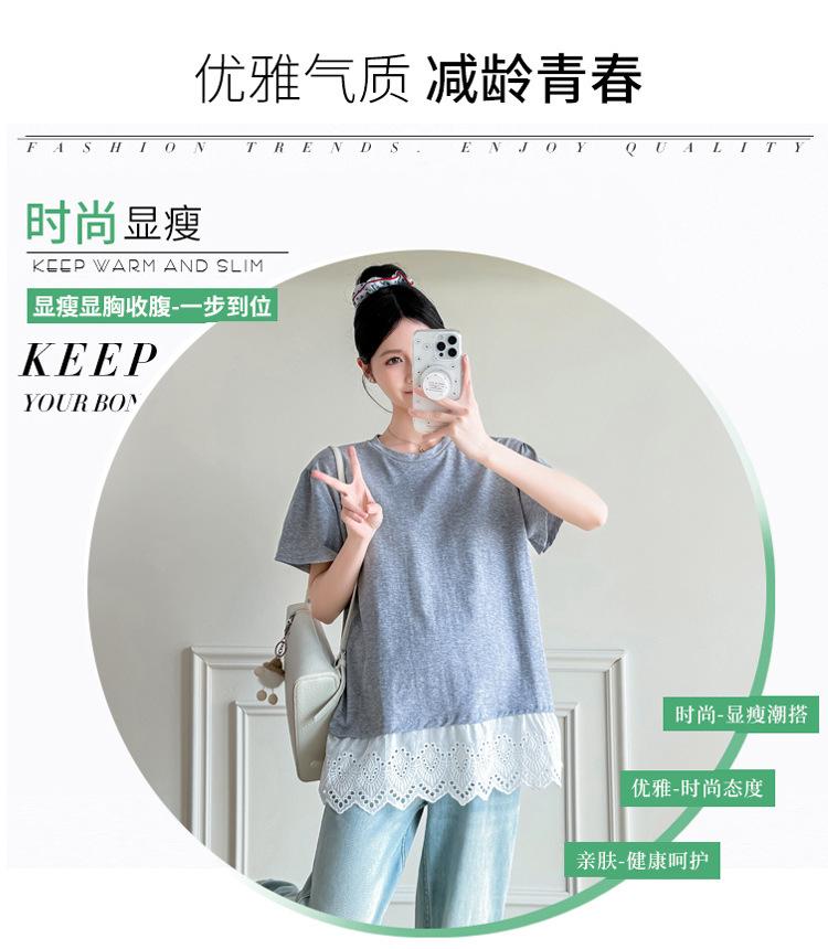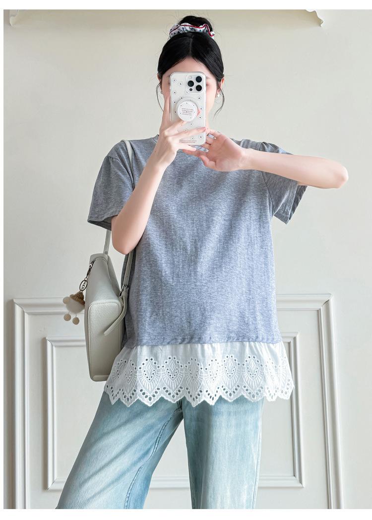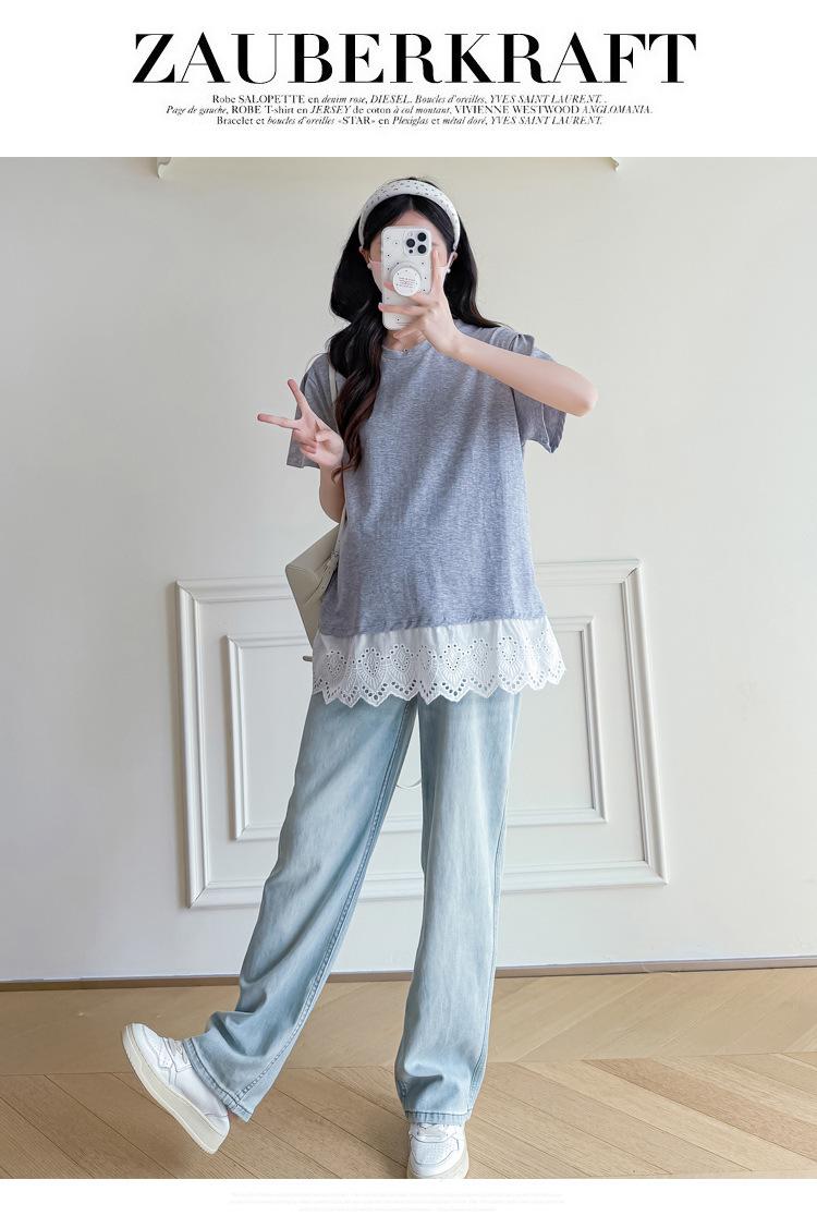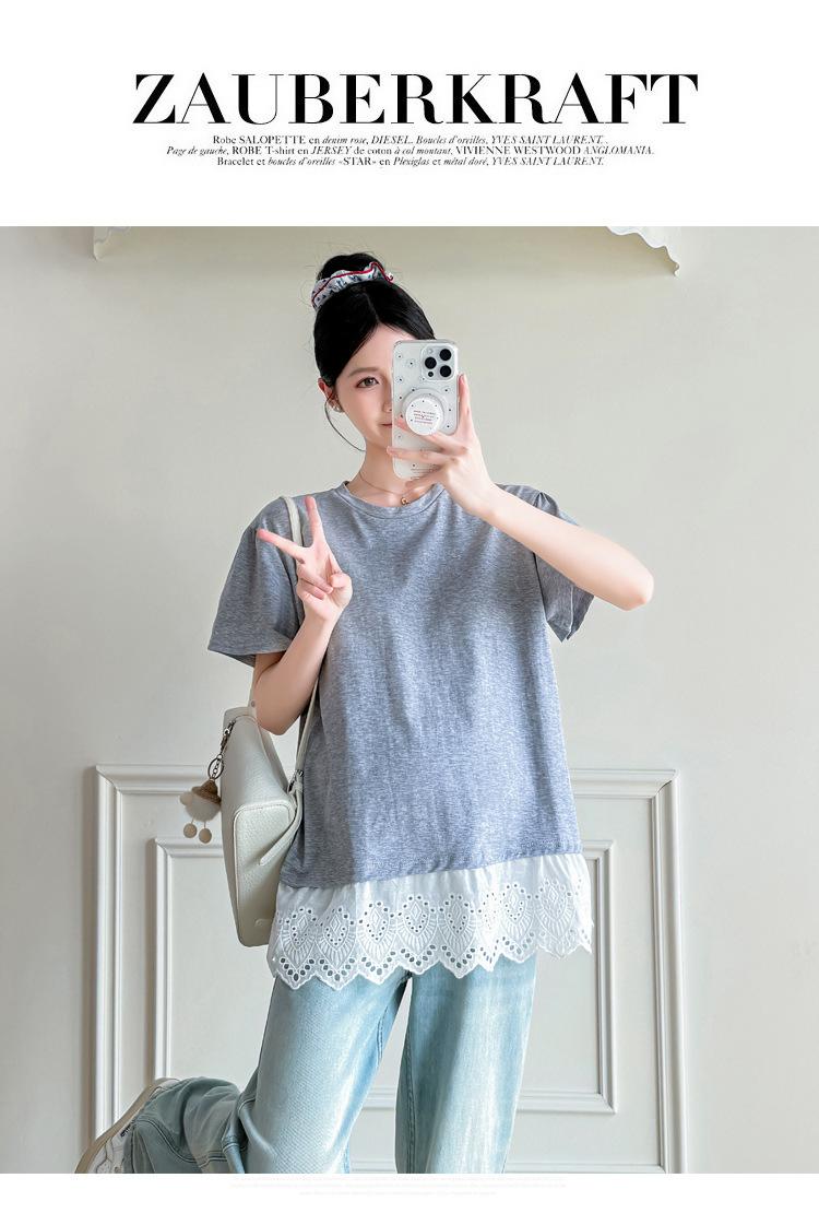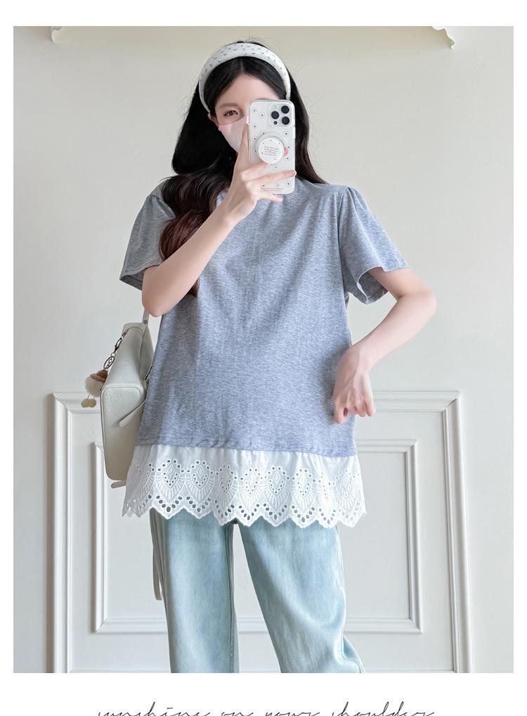 Ropa de Maternidad 2025 Verano Nueva Moda Elegante Diseño de Camiseta de Manga Corta Encaje Holgado Revelador Top de Maternidad