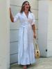2025 Verano Transfronterizo Nuevo Europeo y Americano Amazon Color Sólido Solapa Lazo en la Cintura Elegante Vestido Largo con Abertura