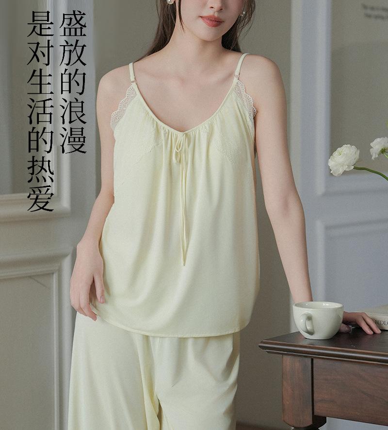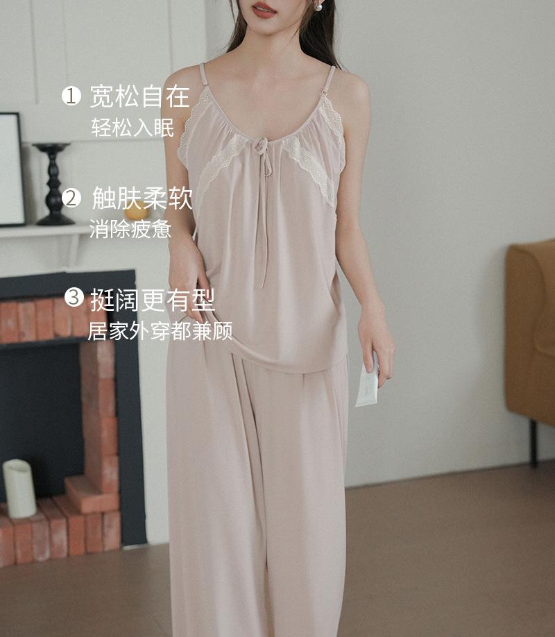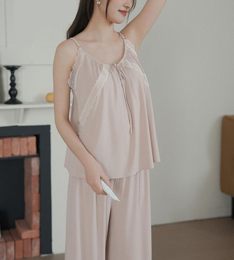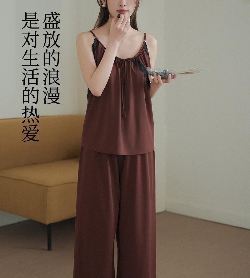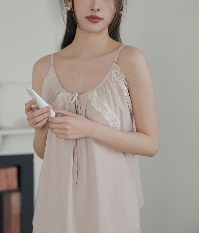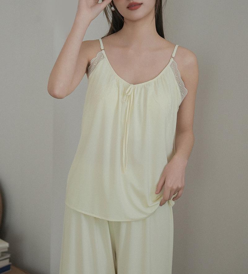 Pantalones finos de verano con tirantes Pijama para mujer Encaje Top holgado con almohadilla en el pecho Traje de ropa para el hogar para mujer