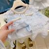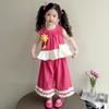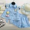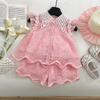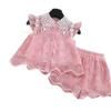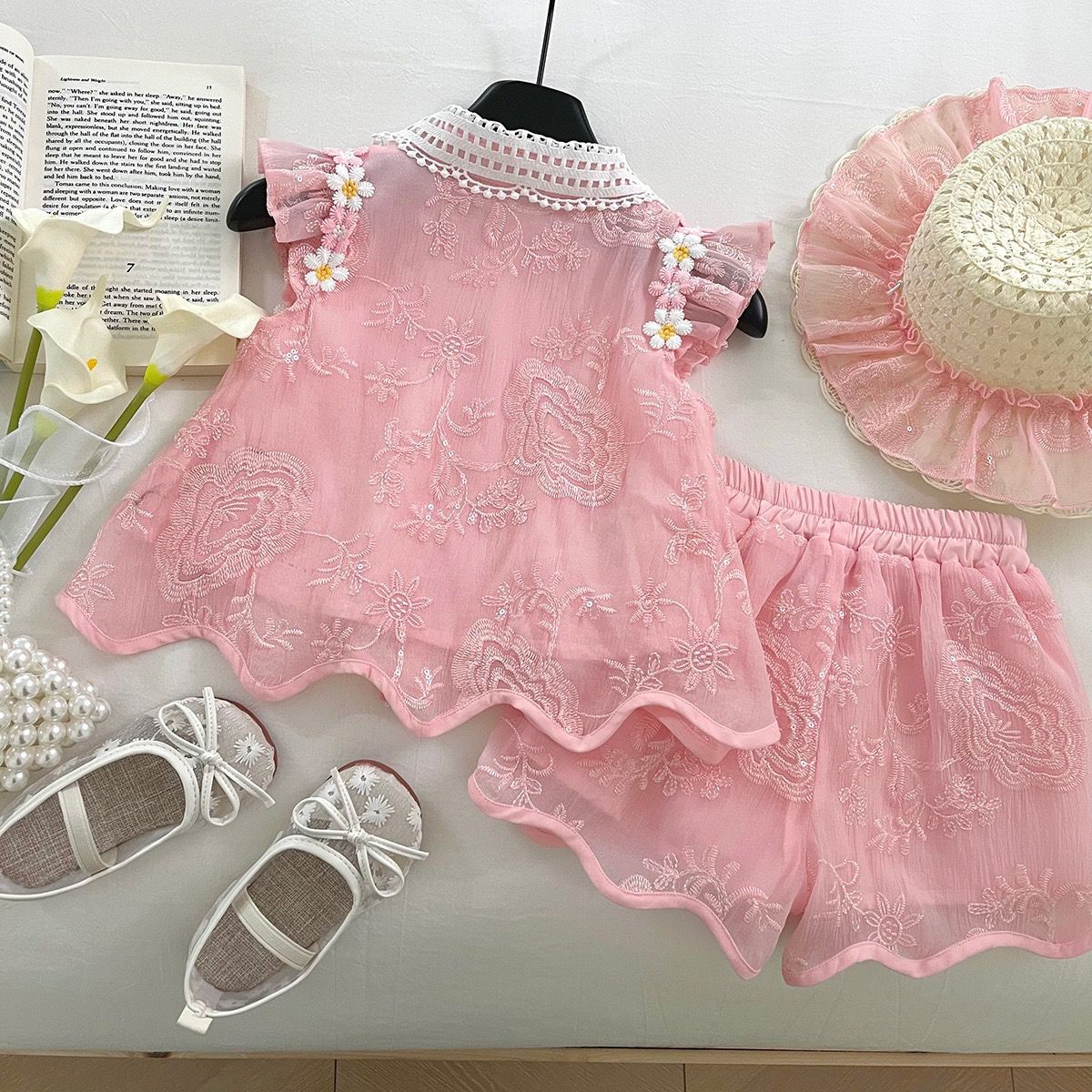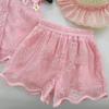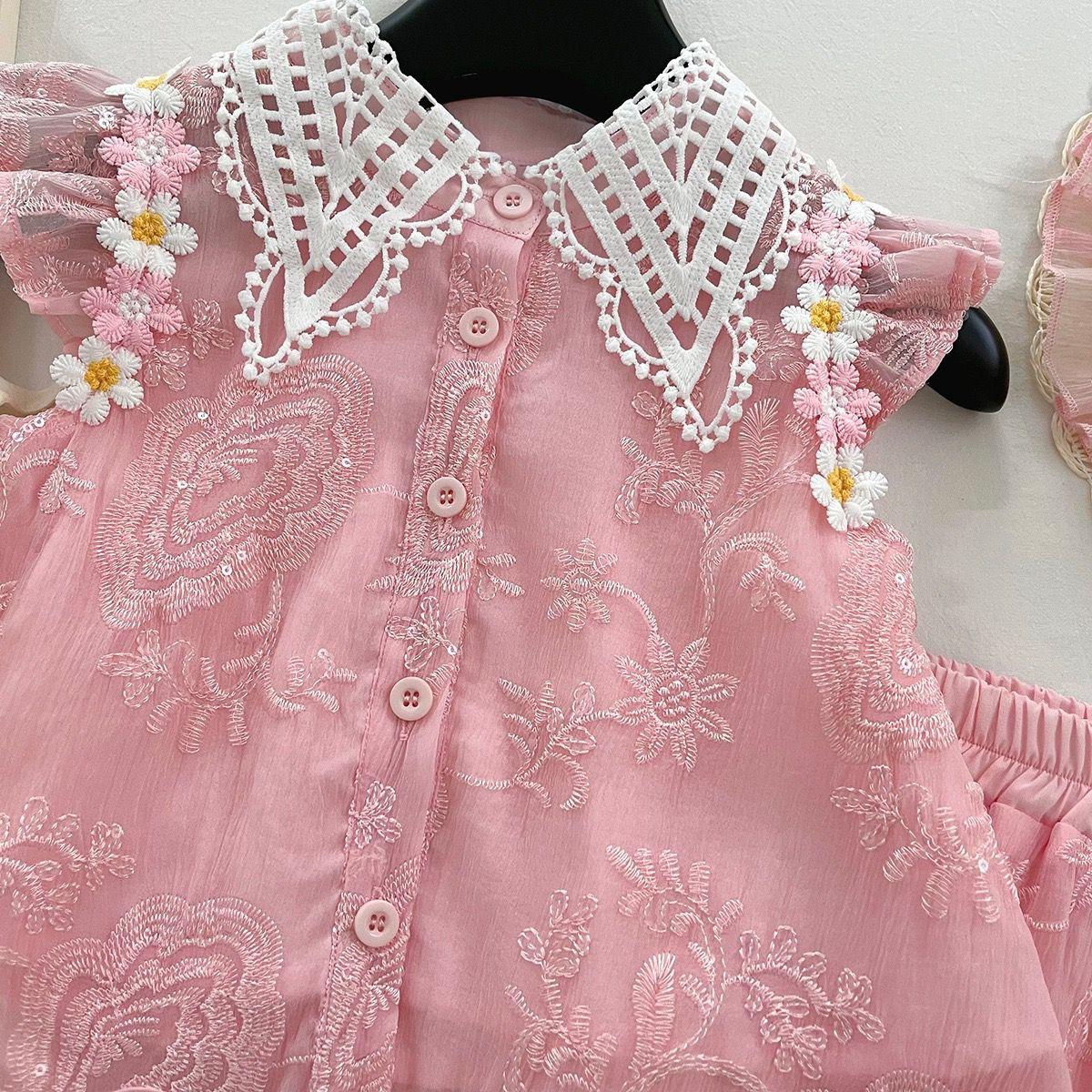 Traje de Verano para Niñas Nuevo 2025 Top Bordado de Encaje Floral Shorts de Encaje Niños Princesa Conjunto de Dos Piezas