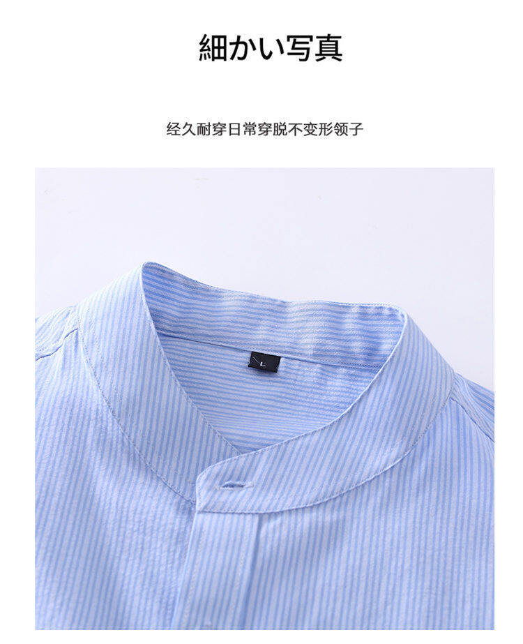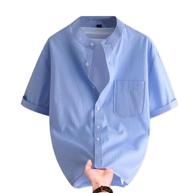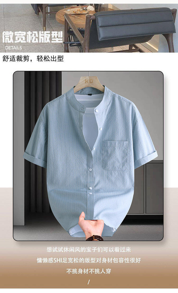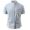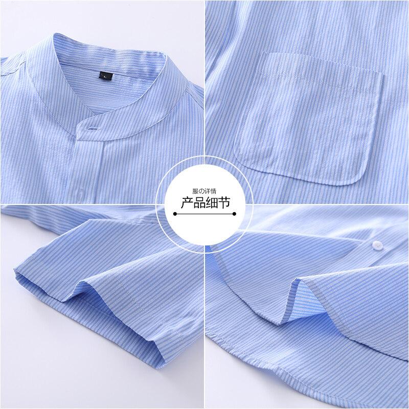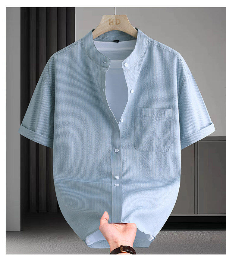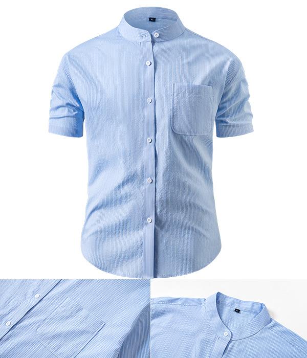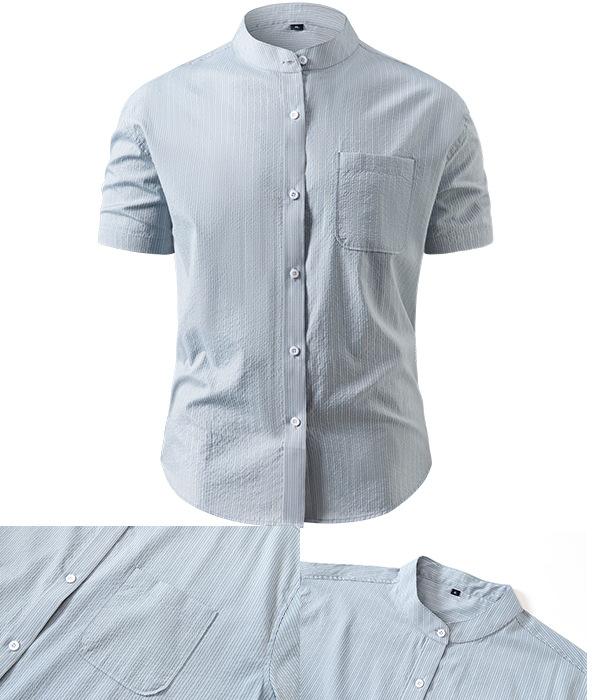 Camisa de Hombre de Cuello Mao Transfronteriza Verano Tela Burbuja Algodón Transpirable Camisa de Hombre Slim Rayada Casual Manga Corta