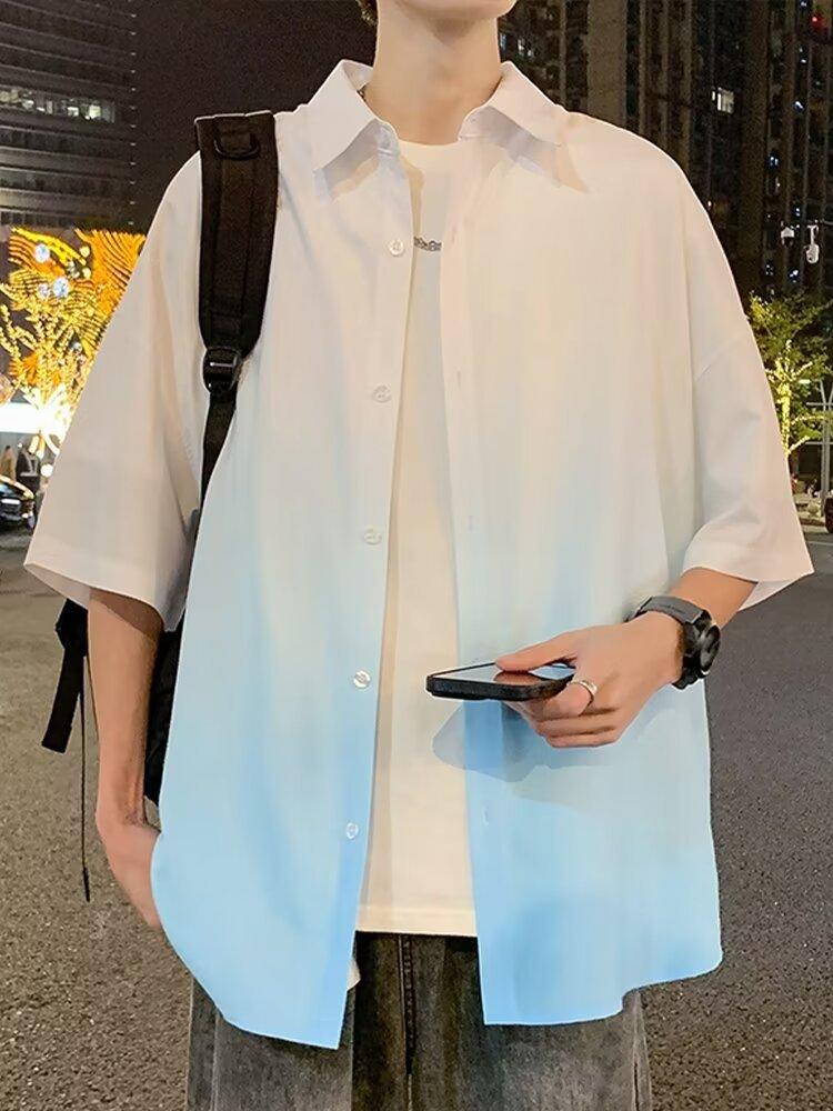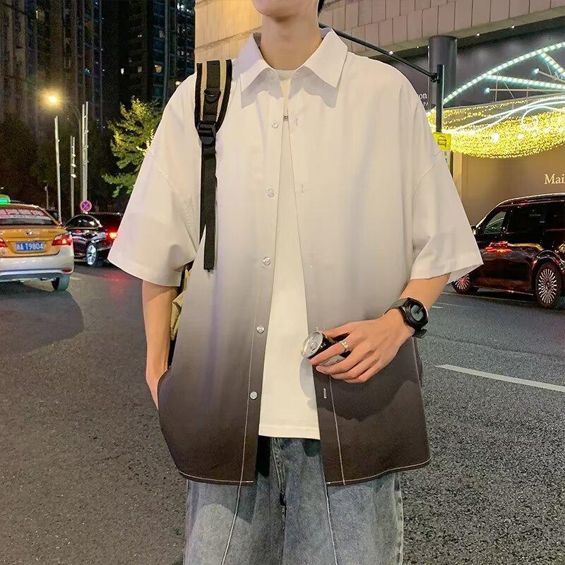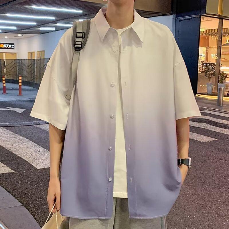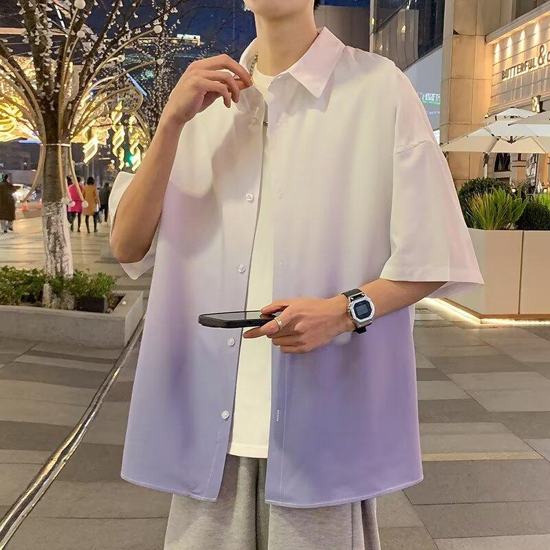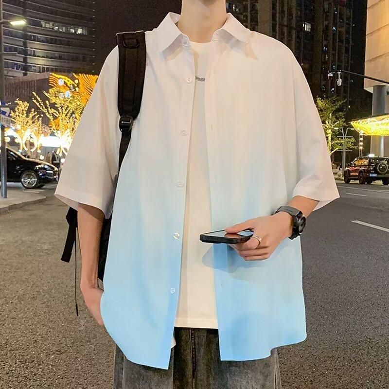 Camisa de manga corta de seda de hielo para hombre, nueva camisa holgada informal con degradado de verano para niños y adolescentes, abrigo de verano a la moda