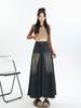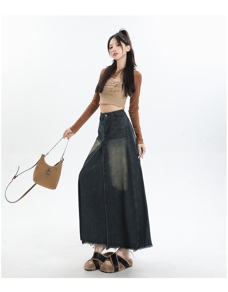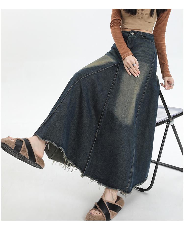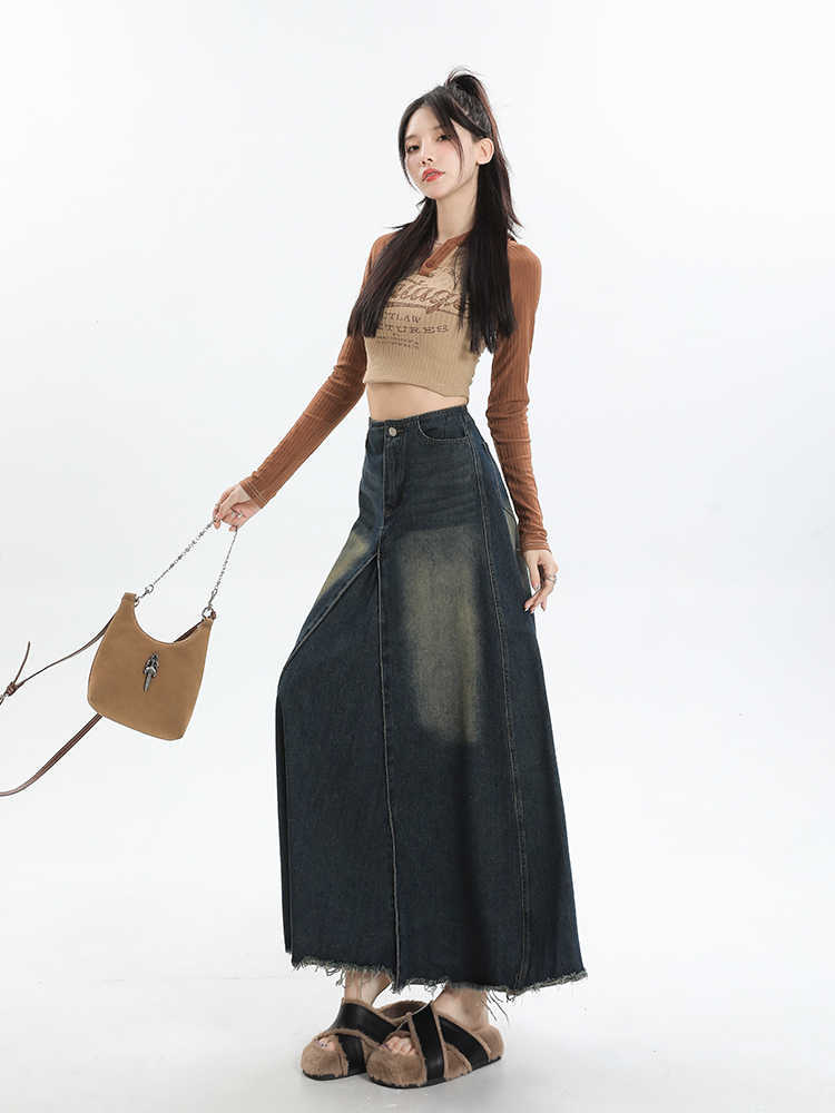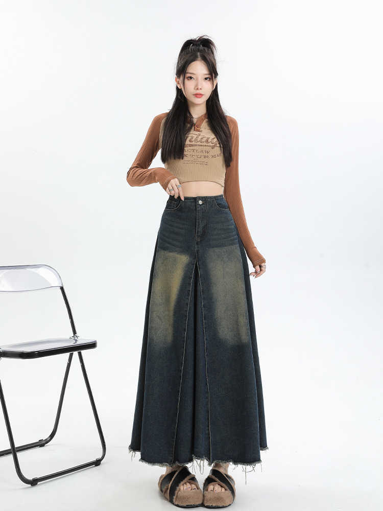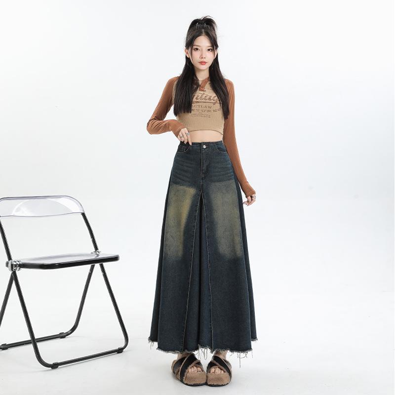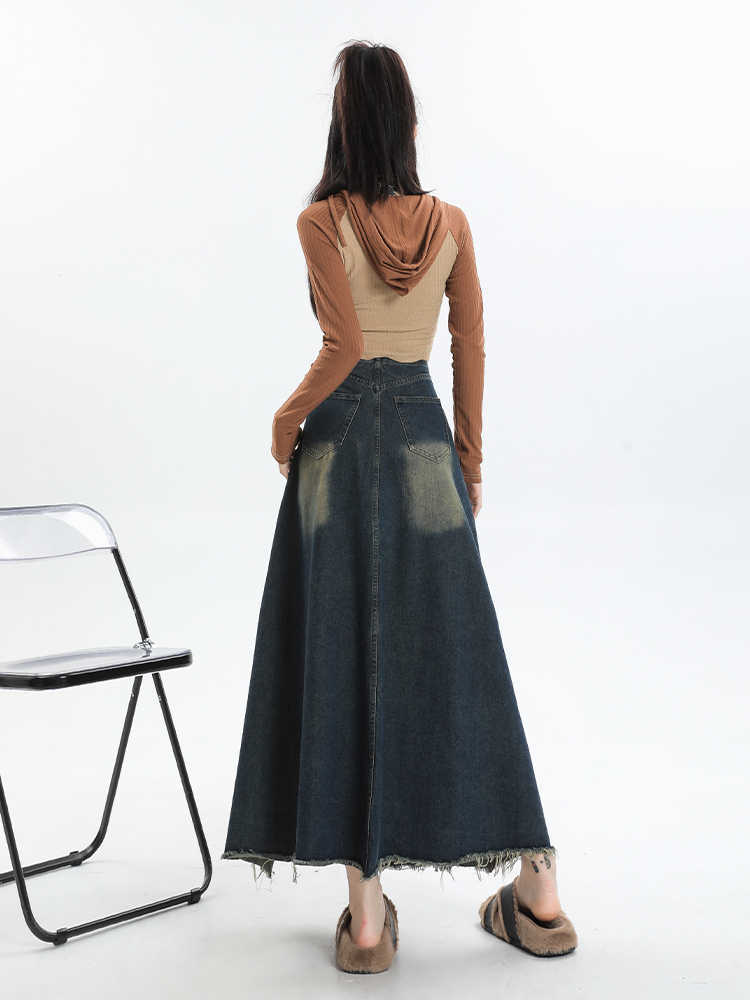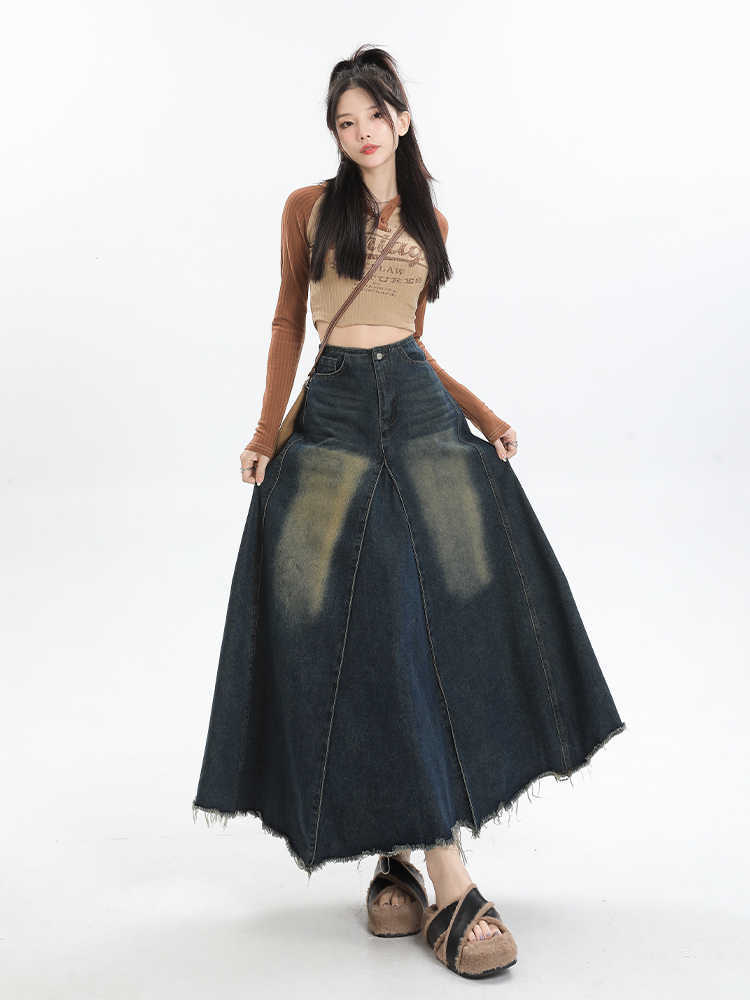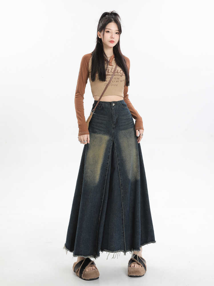 Falda de mezclilla retro de cintura alta para mujer, corte holgado en A que estiliza, nuevo estilo primavera y otoño 2025, falda midi con vuelo y costuras para mujer