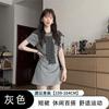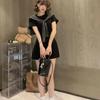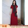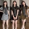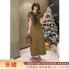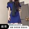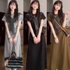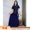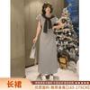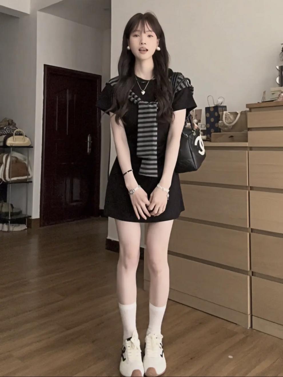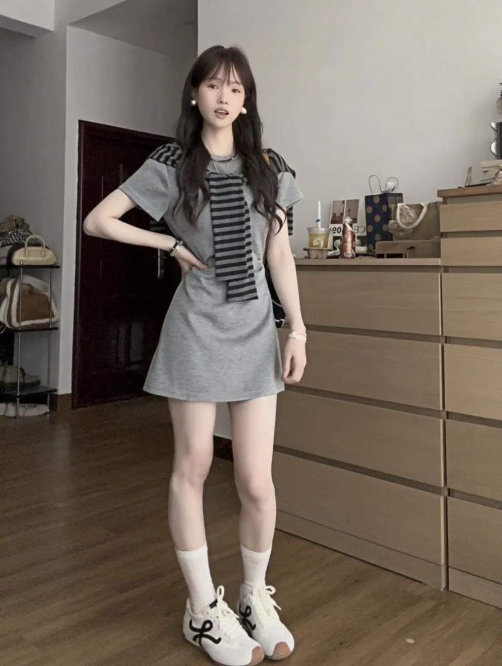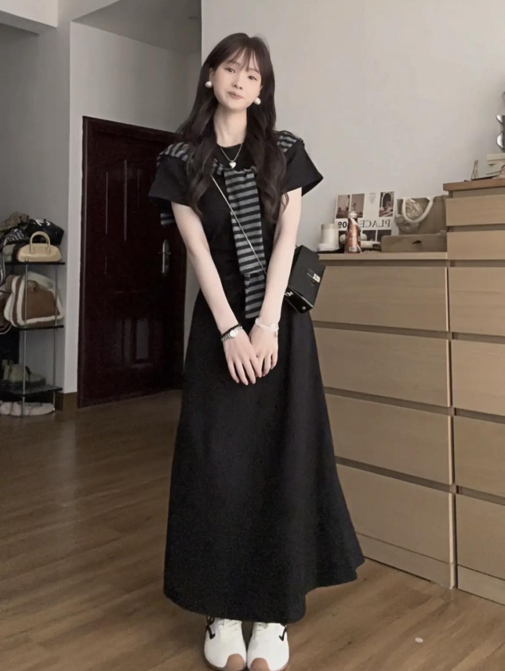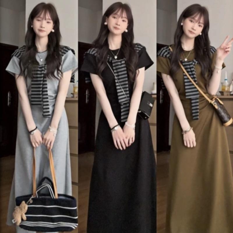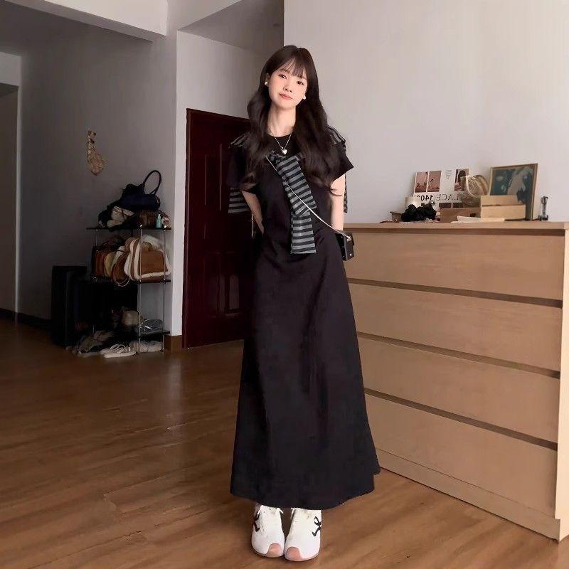 Traje de Moda de Verano Chal Rayado Vestido Nuevo de Manga Corta Cuello Redondo Estilo Urbano Coreano Falda Larga