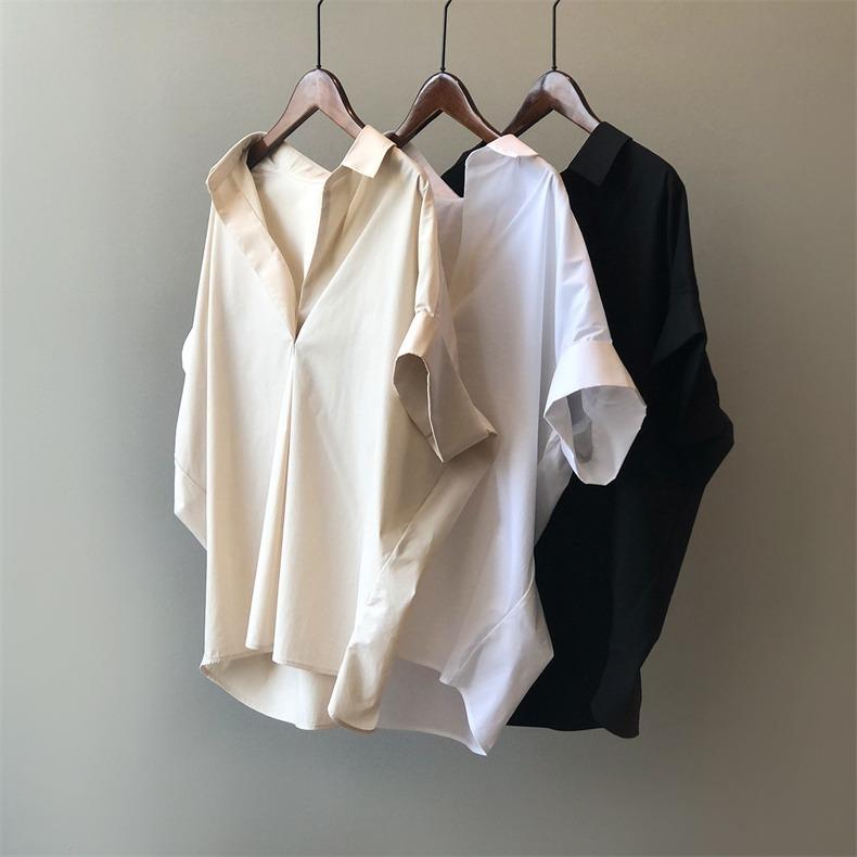 Marca Contador Cierre Ropa de Mujer Comercio Exterior Original Único Liquidación Etiqueta Cortada Vintage Estilo Hong Kong Manga Murciélago Suelta Cuello en V Camisa Verano