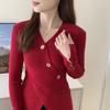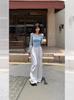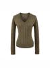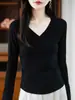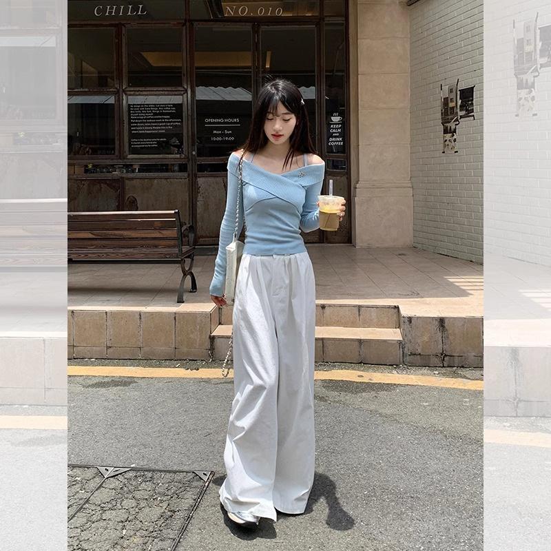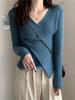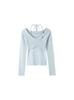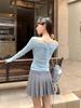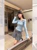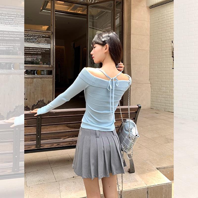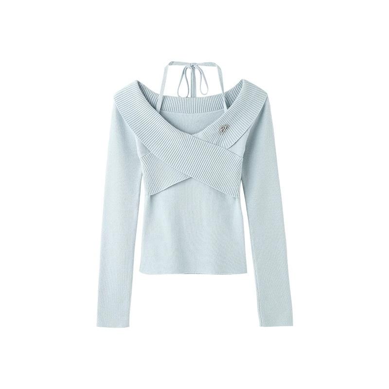 Camiseta de punto de manga larga con hombros y cuello azules Otoño e Invierno Ajustada Adelgazante Estilo Deseo Puro Sentido del Diseño Camiseta Básica Top ins