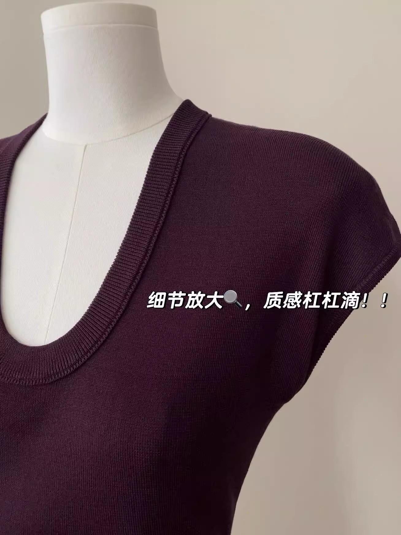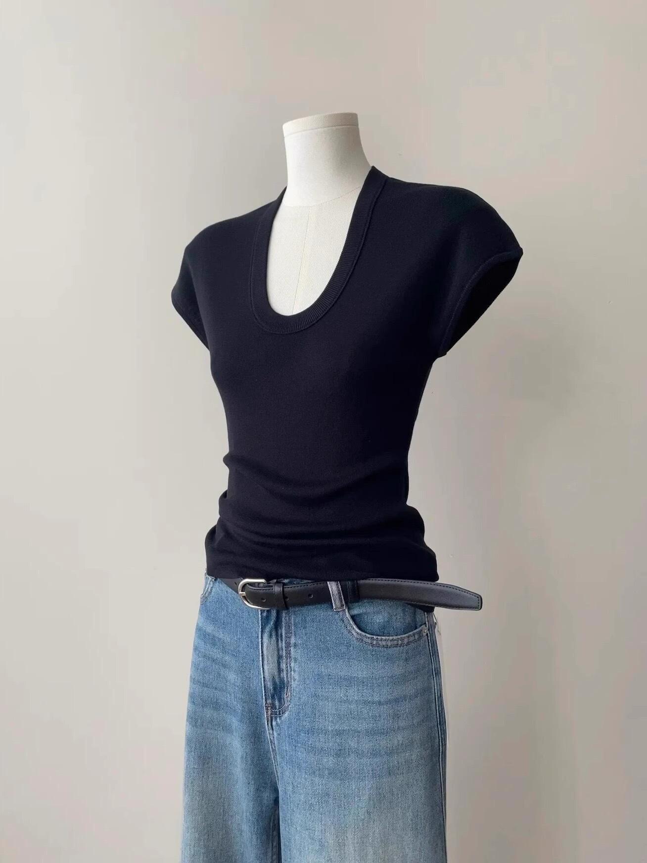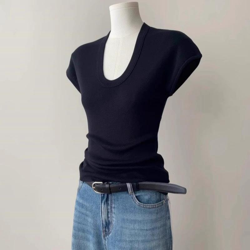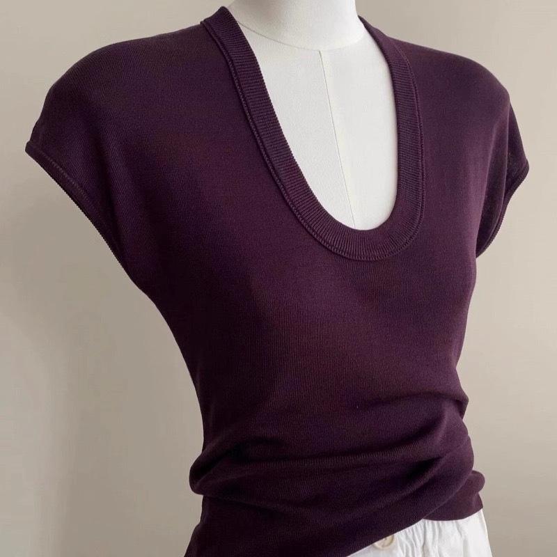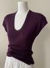 Camiseta de punto morada de Tencel con cuello en U, hombro recto de manga corta para mujer, estilo de verano delgado único