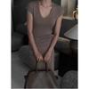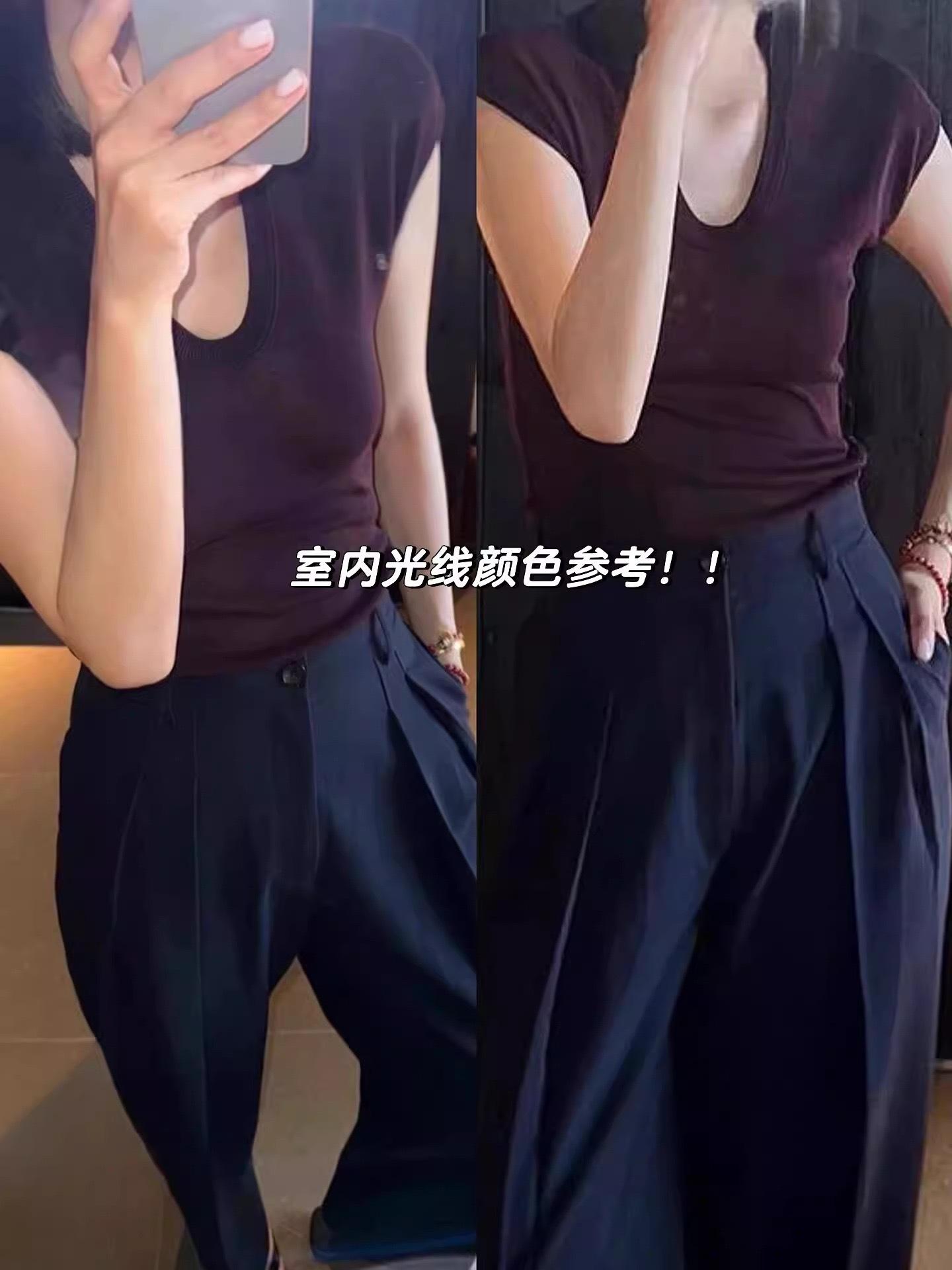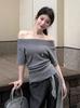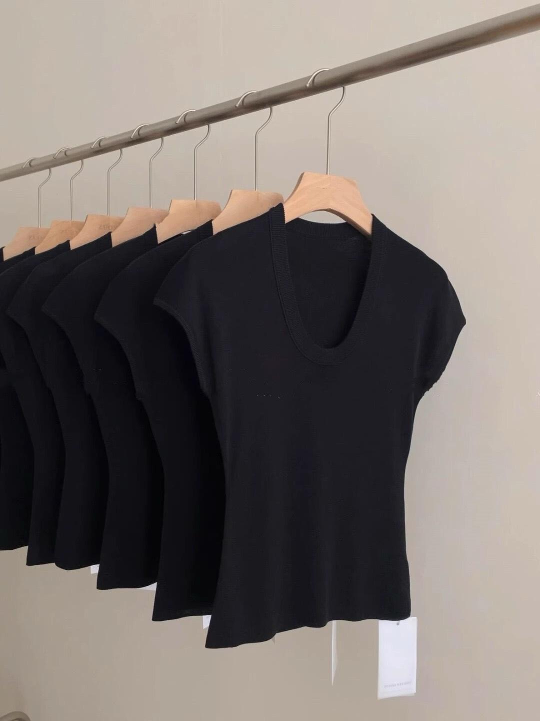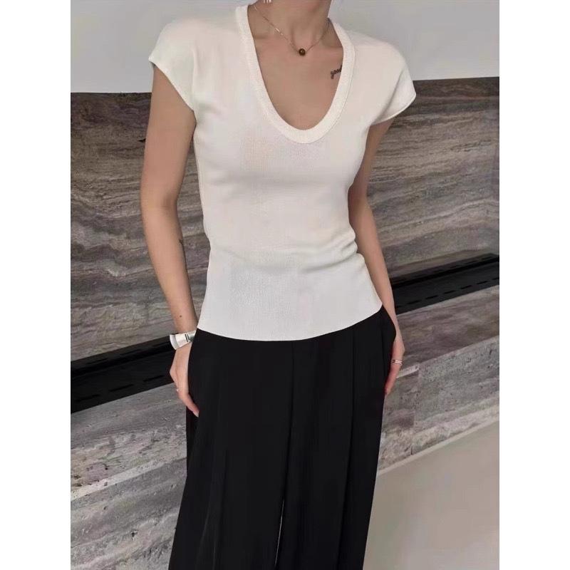 Camiseta de punto morada de Tencel con cuello en U, hombro recto de manga corta para mujer, estilo de verano delgado único
