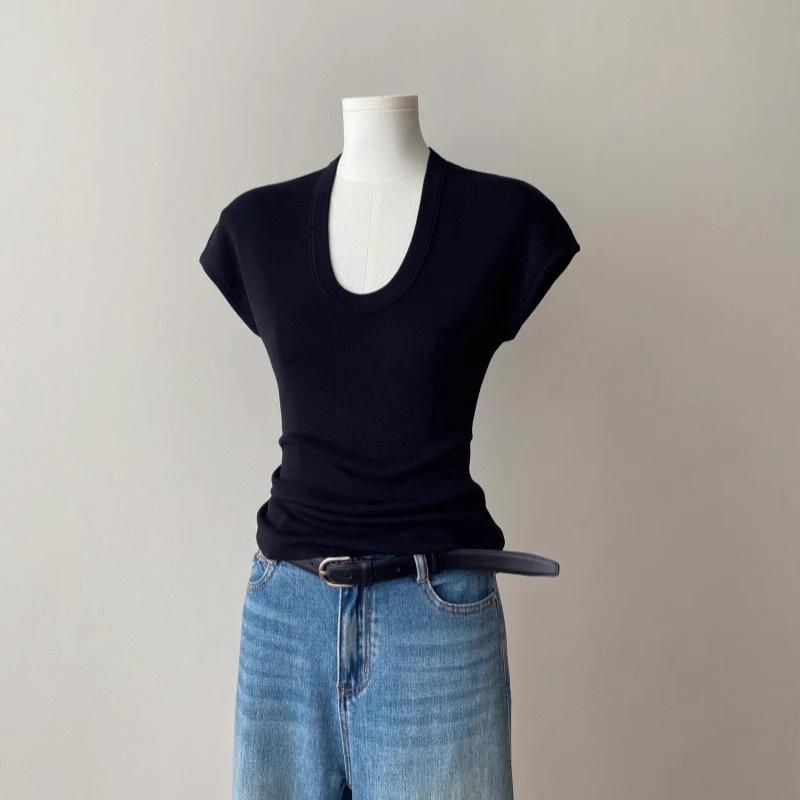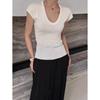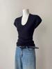 Playera de Manga Corta de Punto con Cuello U Morado Tencel para Mujer, Delgada para Verano, Estilo Occidental Único Chic, Ajustada, Adelgazante