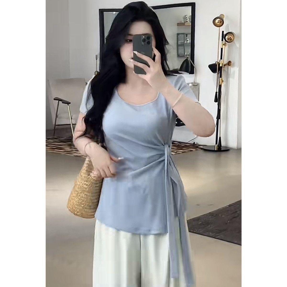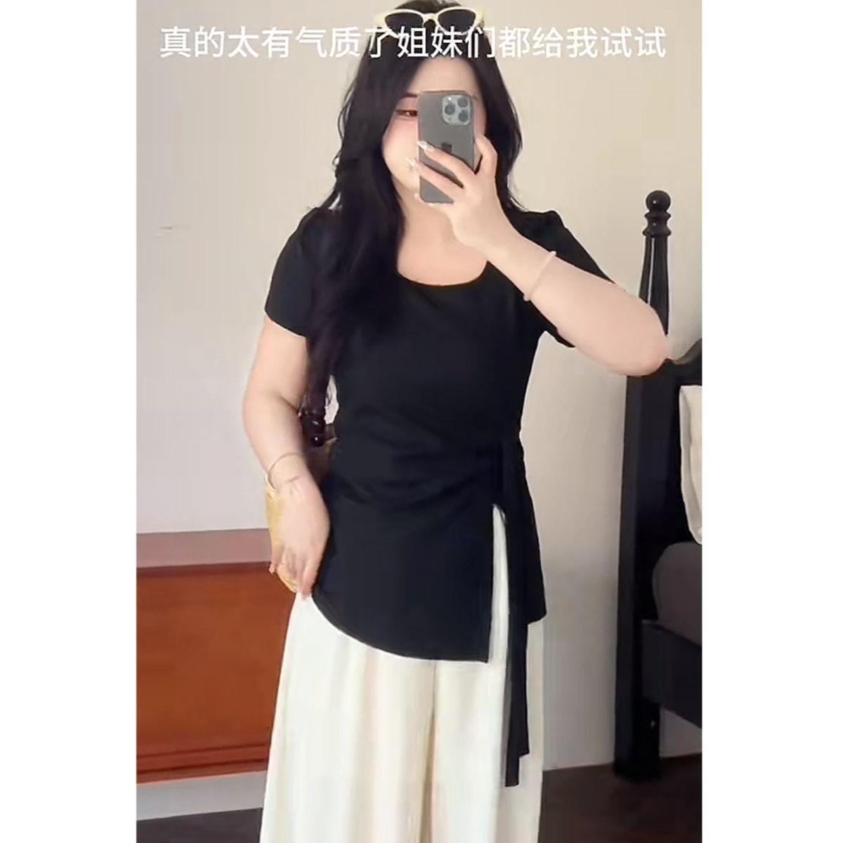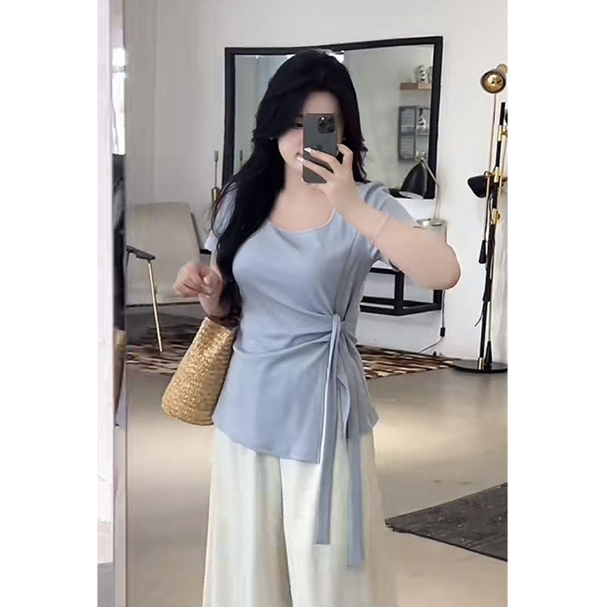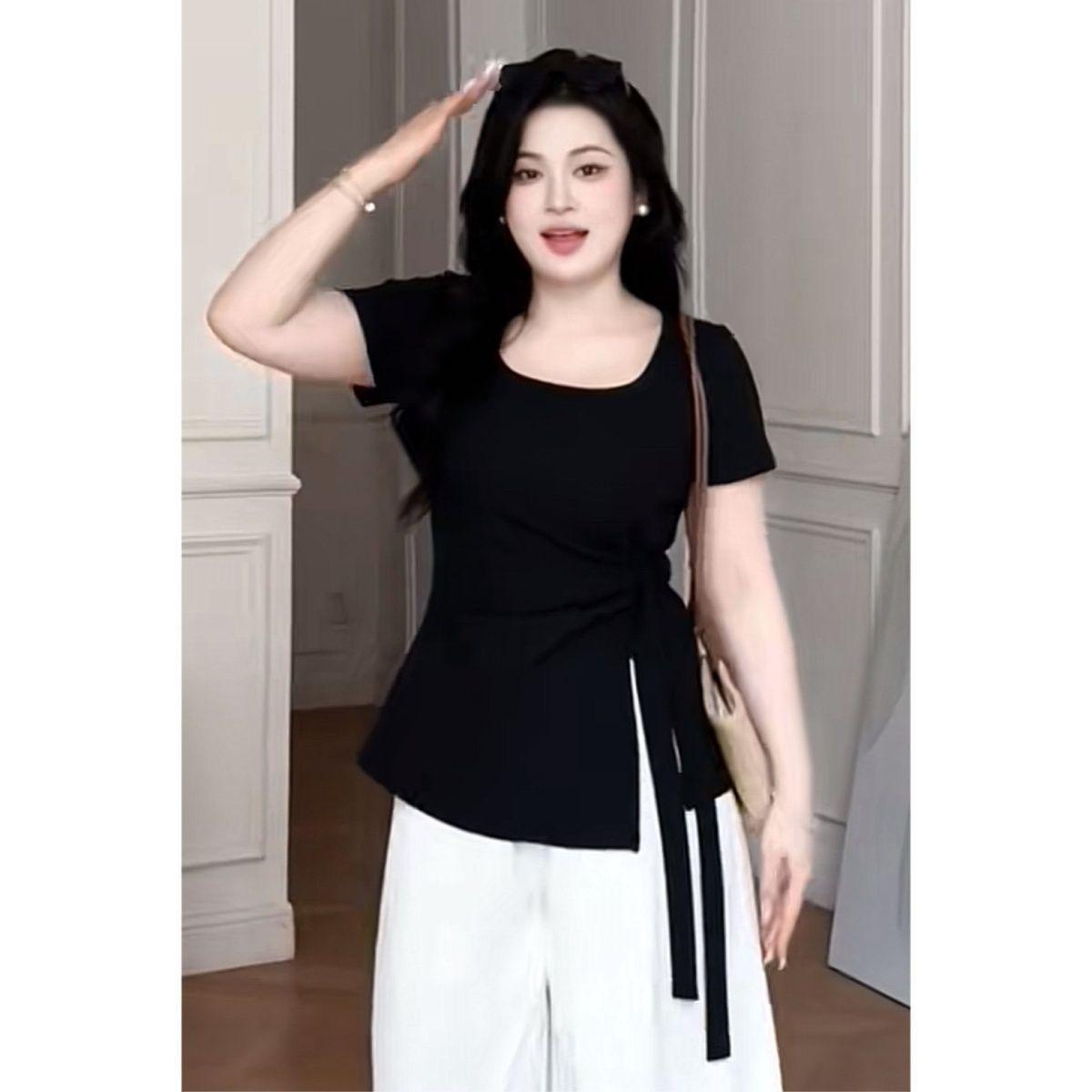 Talla grande Camiseta de Hombro Manga Corta para Mujer Verano 2025 Nuevo Diseño Irregular Chica Gordita Cubre Carne Slim Top