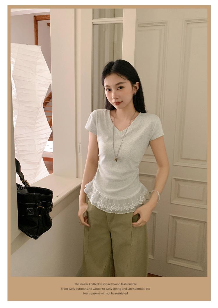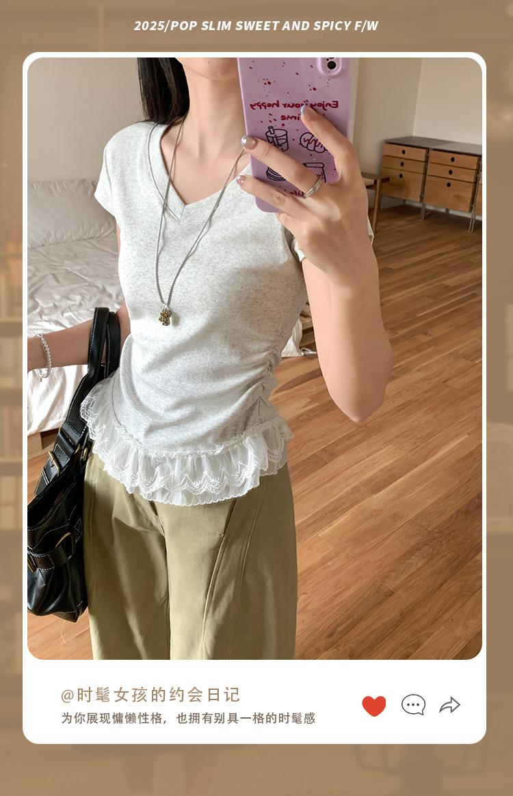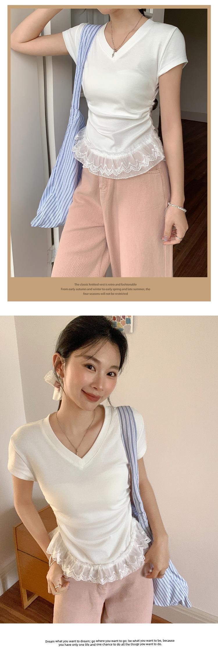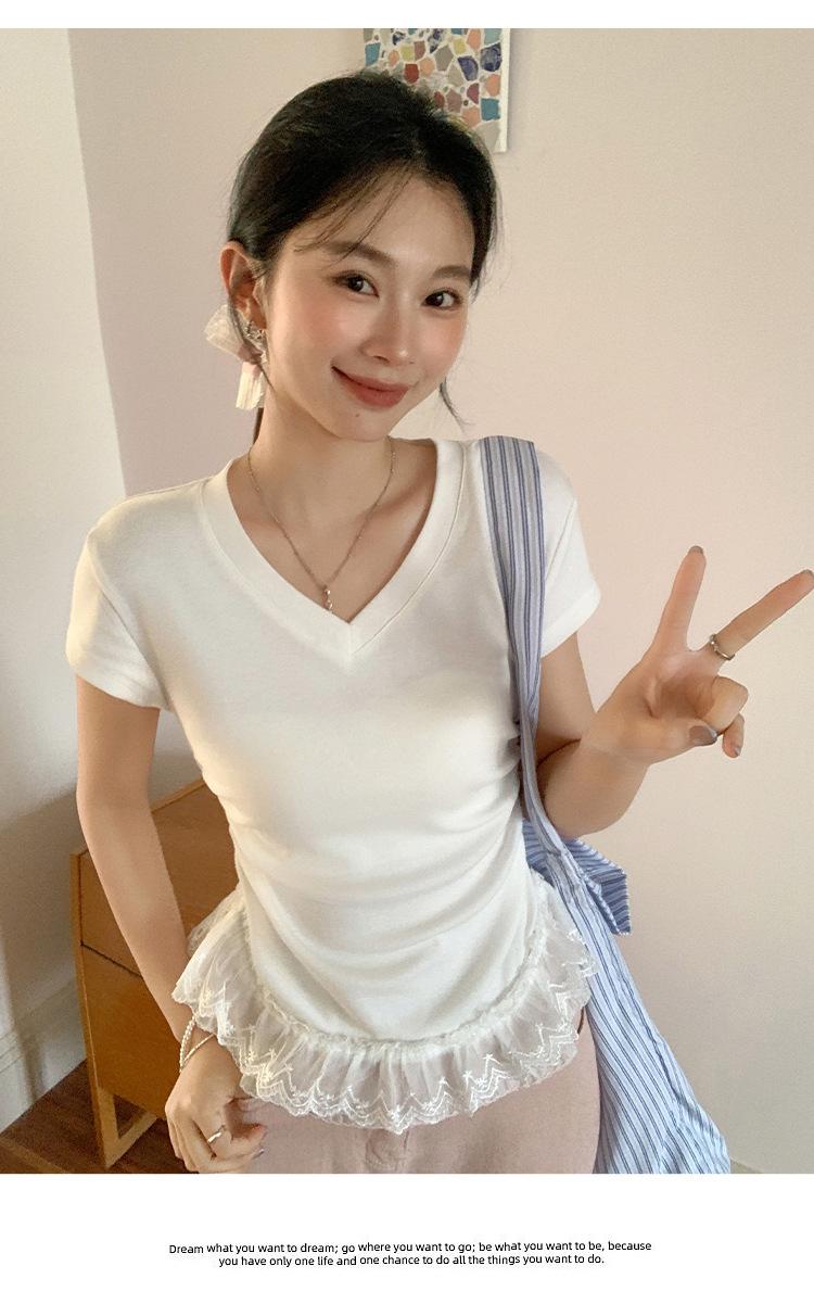 Compra Playera Blanca Pura de Cuello en V con Costuras de Encaje de Manga Corta para Mujer Verano 2025 Nueva Ajustada Hombro Top Corto al por mayor en Joom.pro