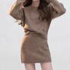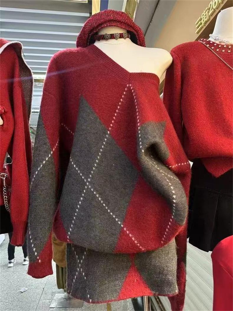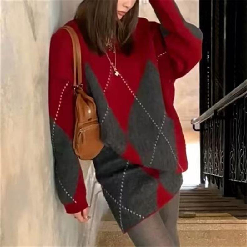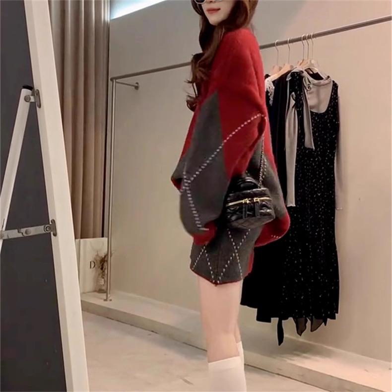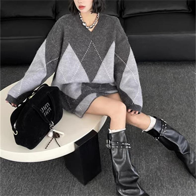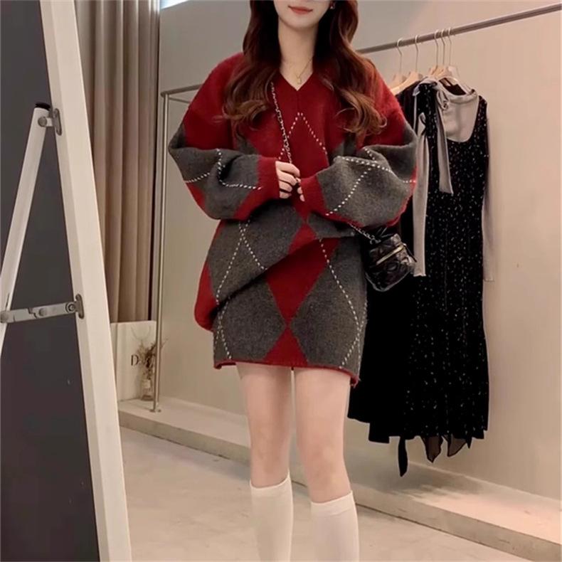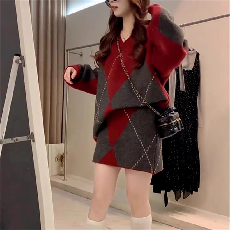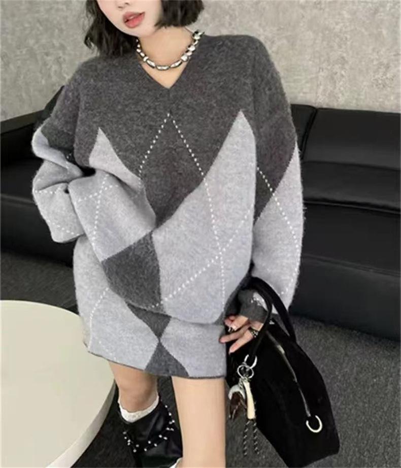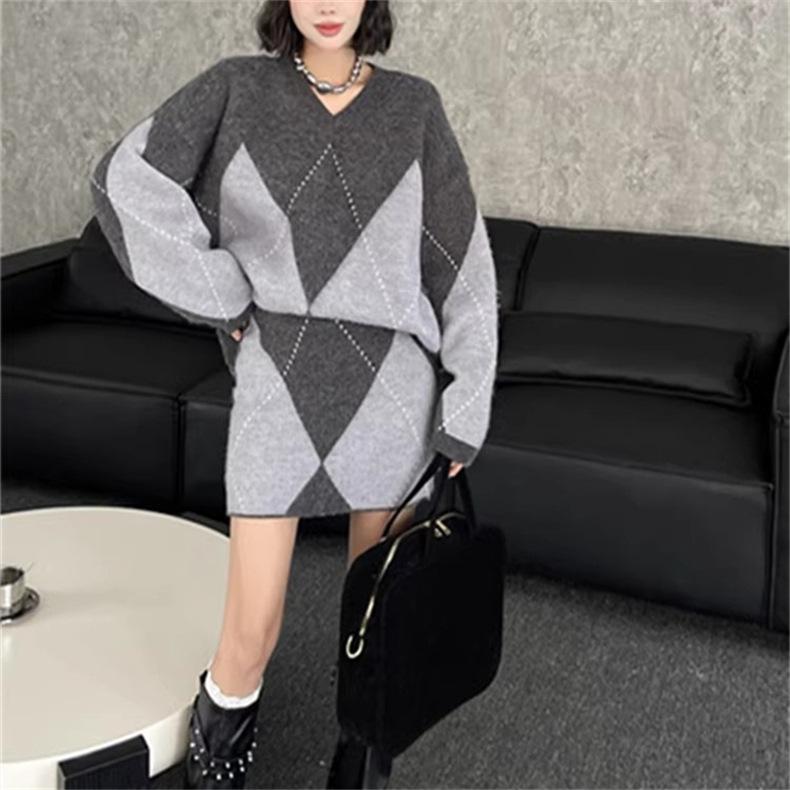 Conjunto de dos piezas de suéter holgado de punto de alta gama con forma de diamante engrosado y falda que cubre la cadera para mujer 25 Nueva moda de primavera y otoño Traje de punto