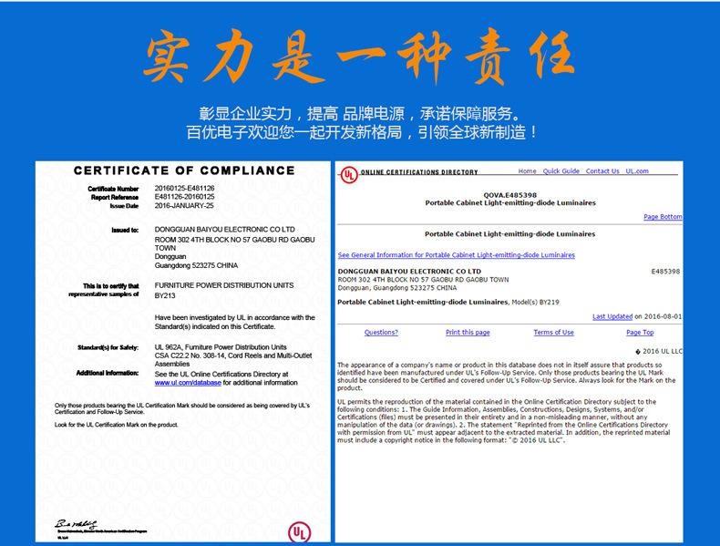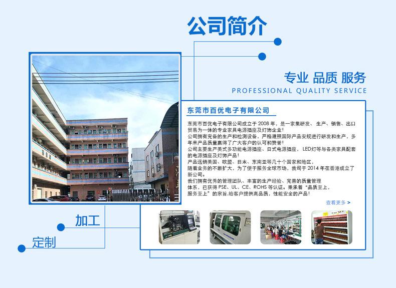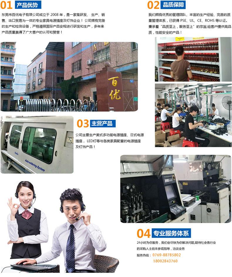 DongGuan BaiYou Electronics CO., Ltd, fundada en 2008, es un fabricante profesional de tomas de corriente y luces para muebles. Especializada en tomas de corriente estilo japonés, tomas de corriente multifuncionales Americana, luz LED y tomas de corriente para muebles y luces para muebles.