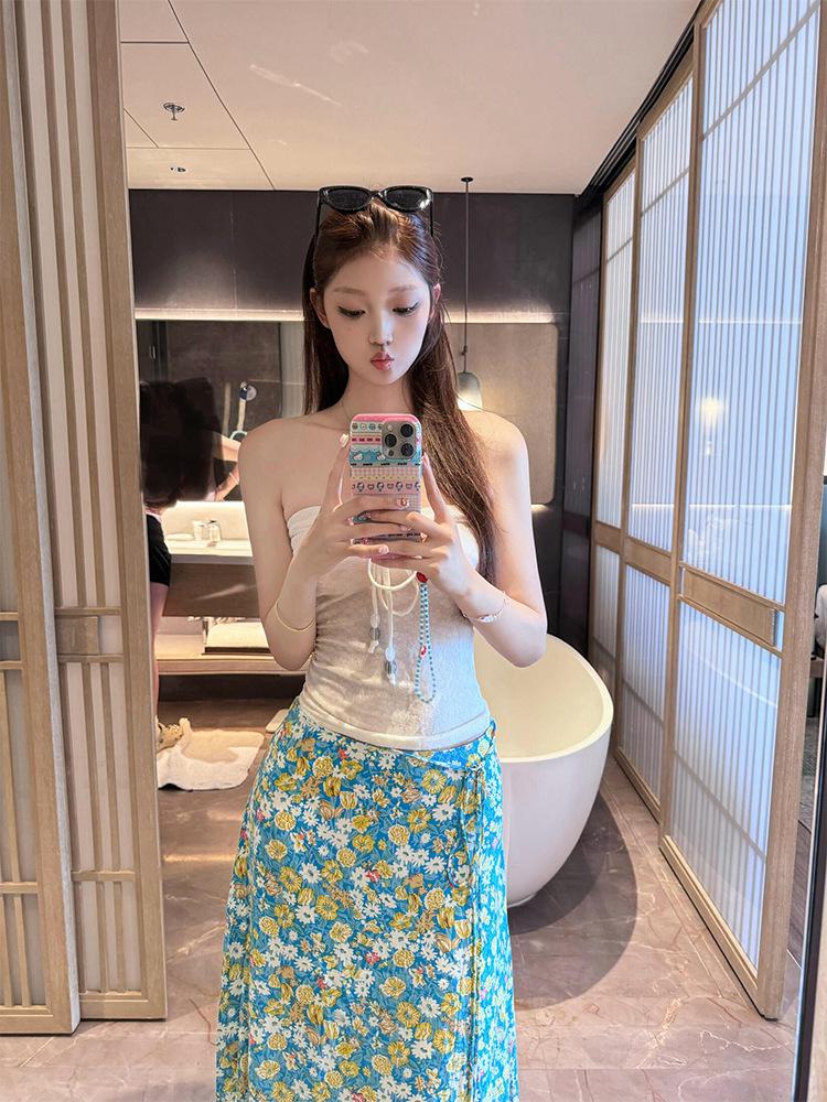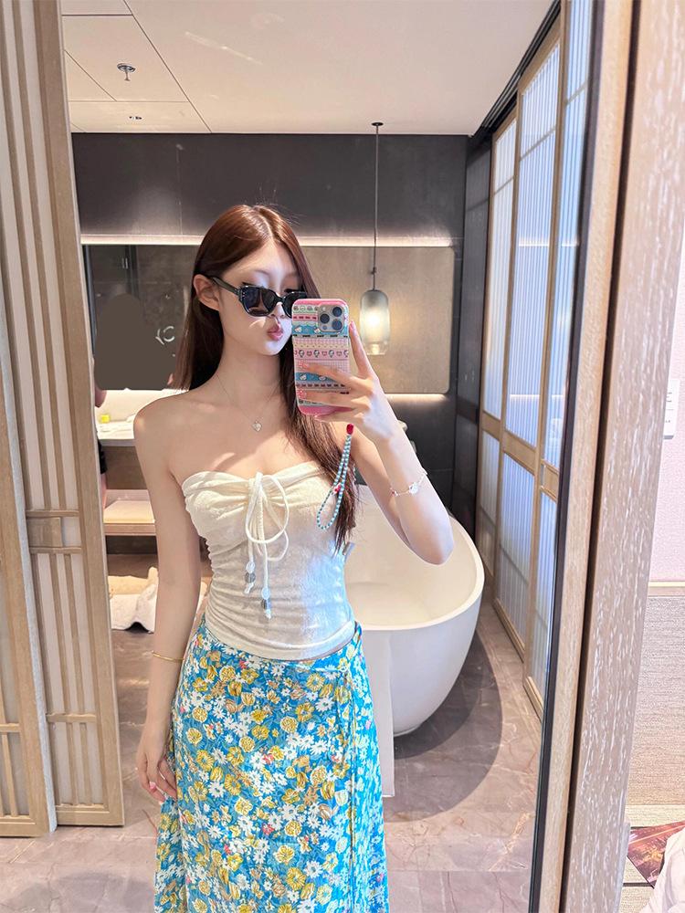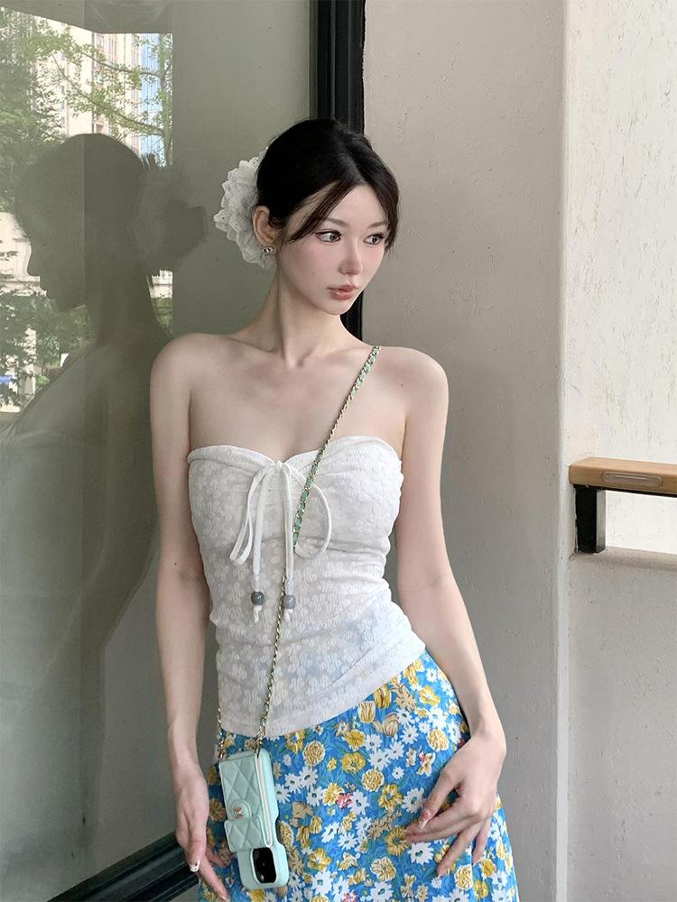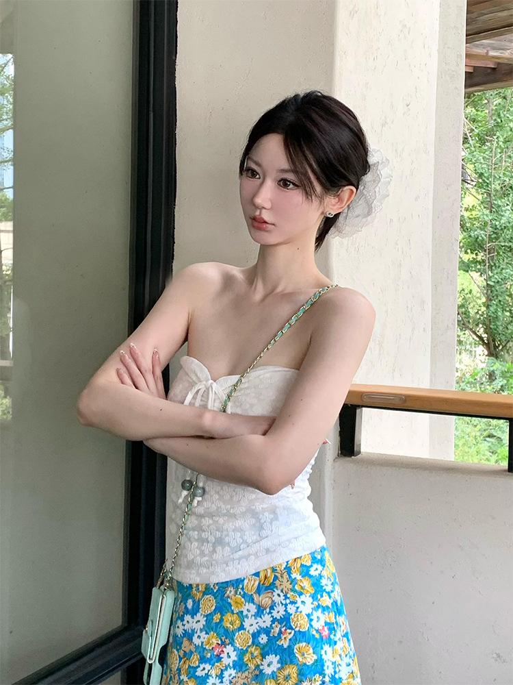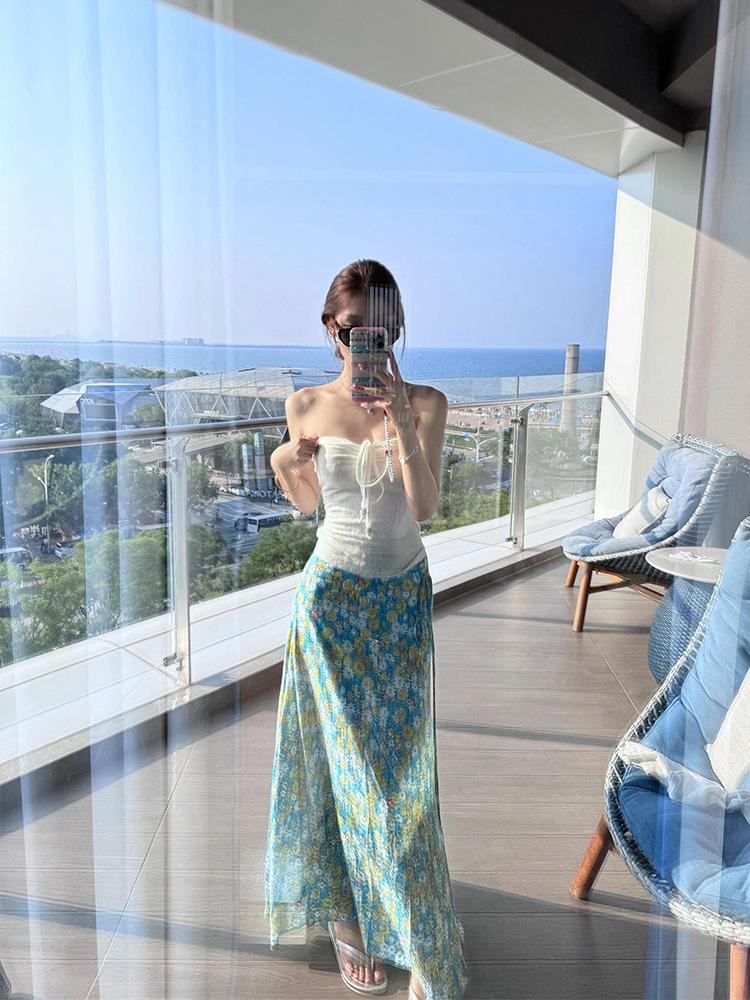 Sexy Chaleco Strapless con Diseño Calado para Mujer Verano Ropa Exterior Estilo Vacacional Floral Falda de Cadera Conjunto de Dos Piezas