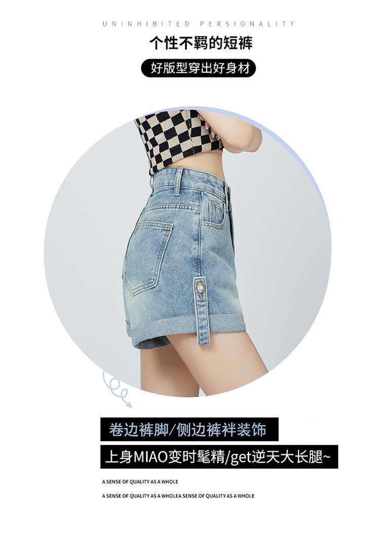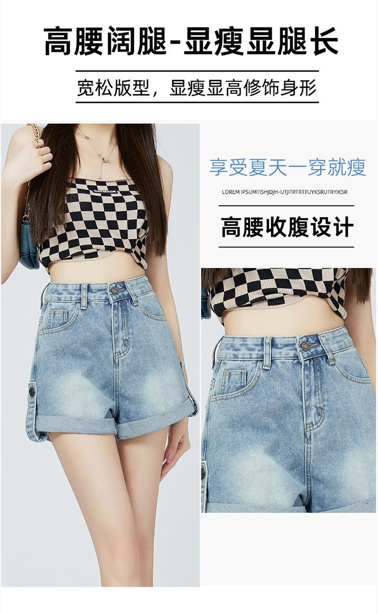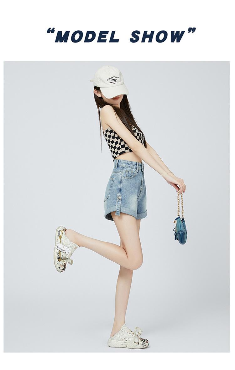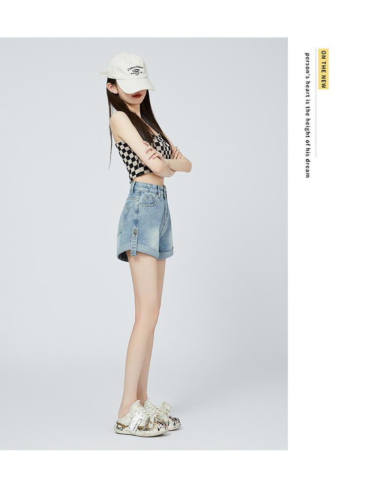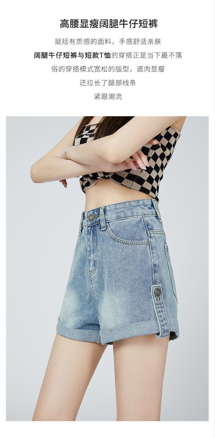 Pantalones cortos de mezclilla de cintura alta estilo americano de pierna ancha para mujer, pantalones cortos cortos tipo A, pantalones cortos hot pants, verano para mujer, azul nostálgico, elastano