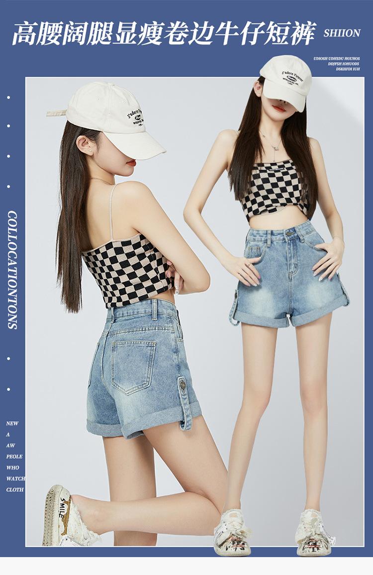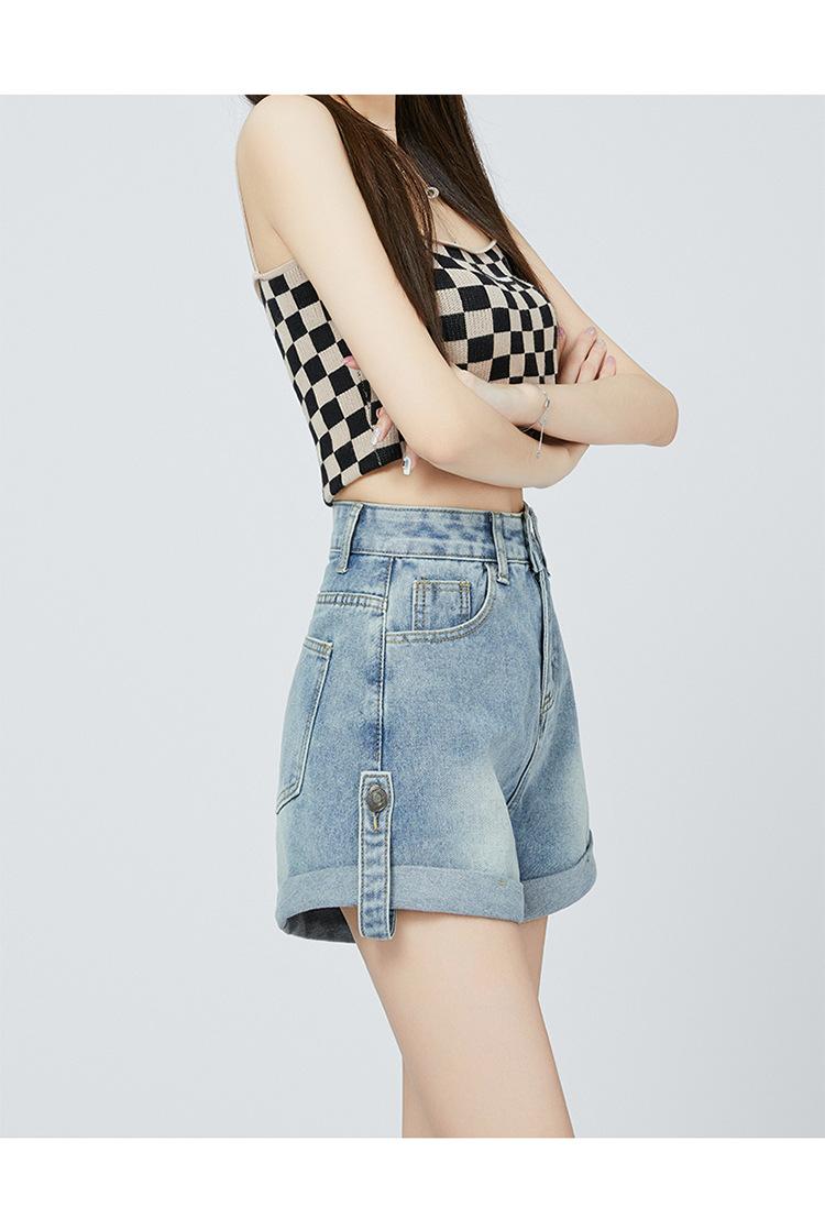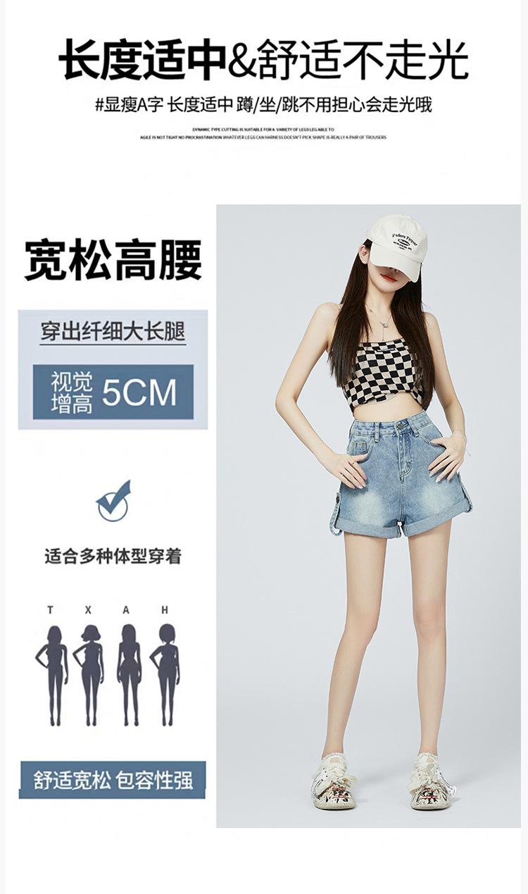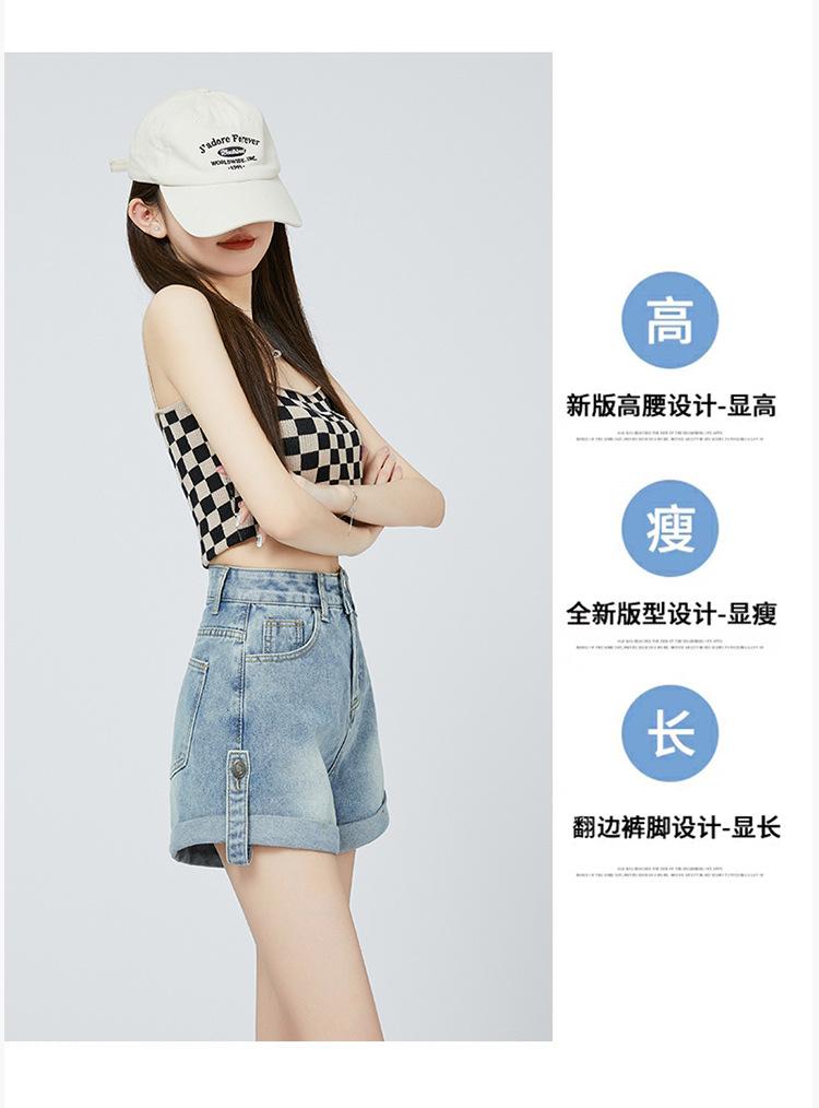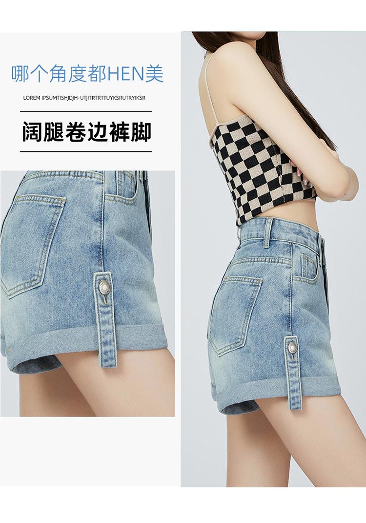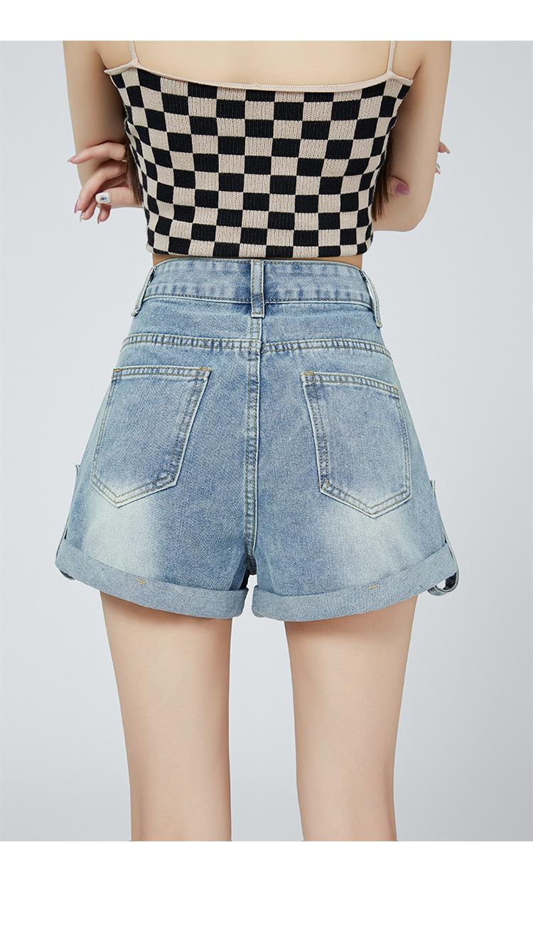 Pantalones cortos de mezclilla de cintura alta estilo americano de pierna ancha para mujer, pantalones cortos cortos tipo A, pantalones cortos hot pants, verano para mujer, azul nostálgico, elastano