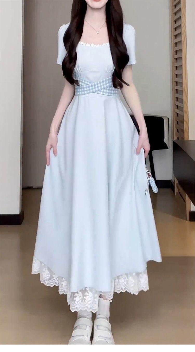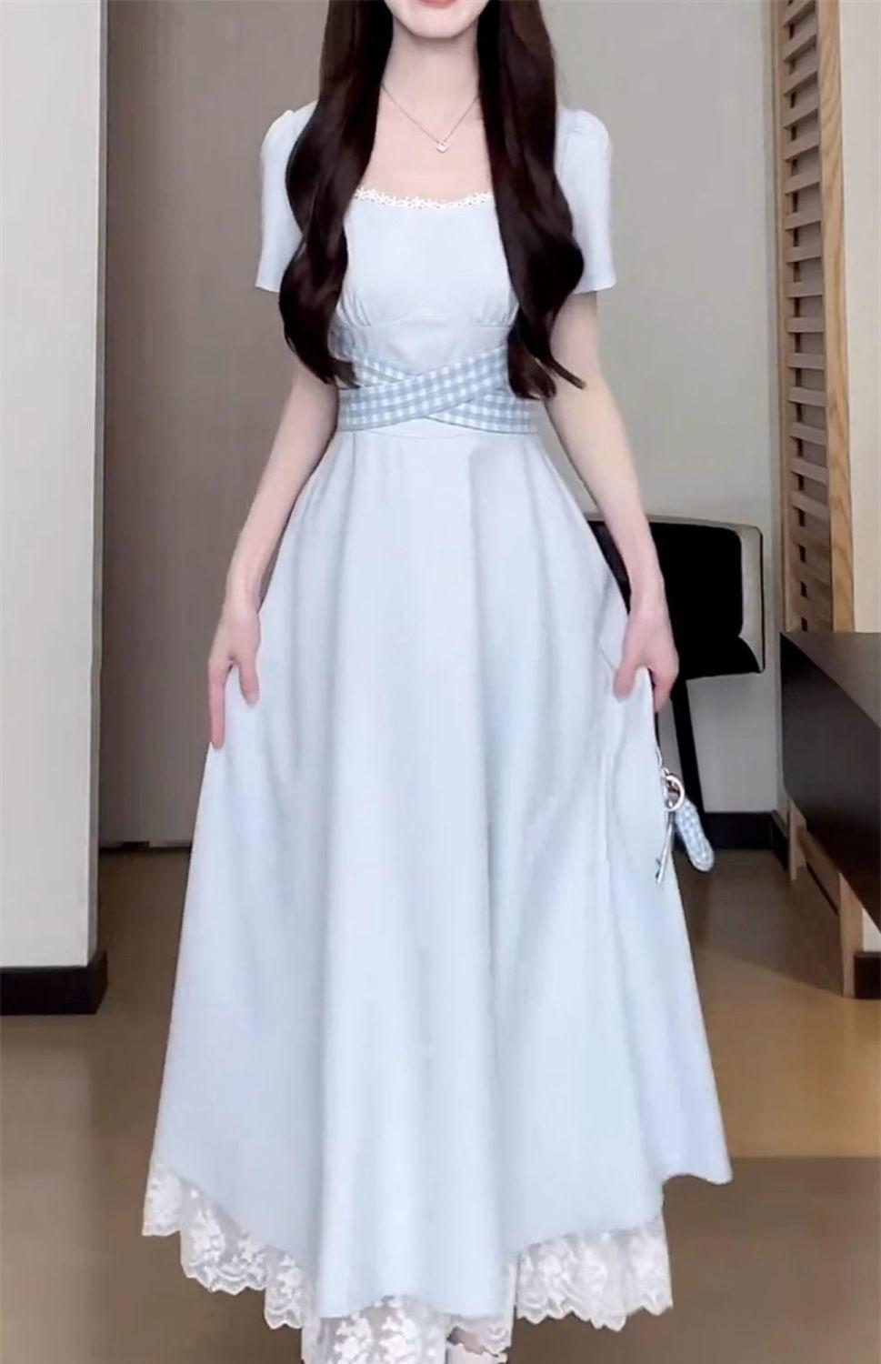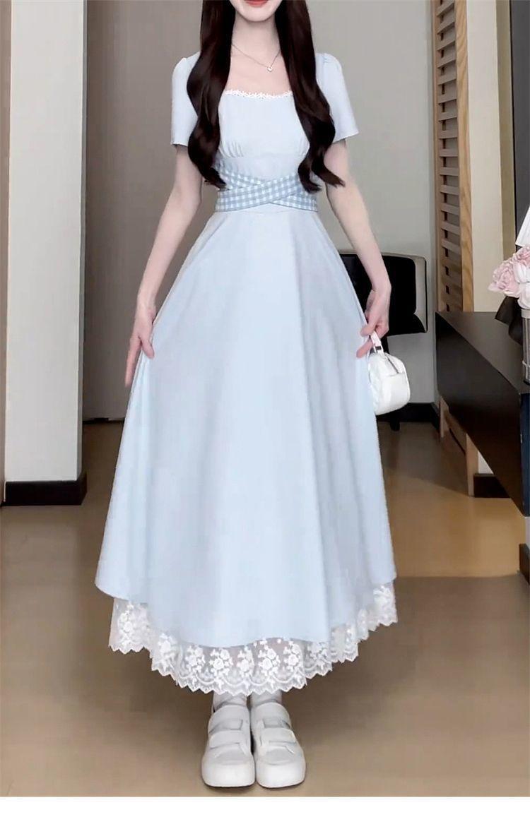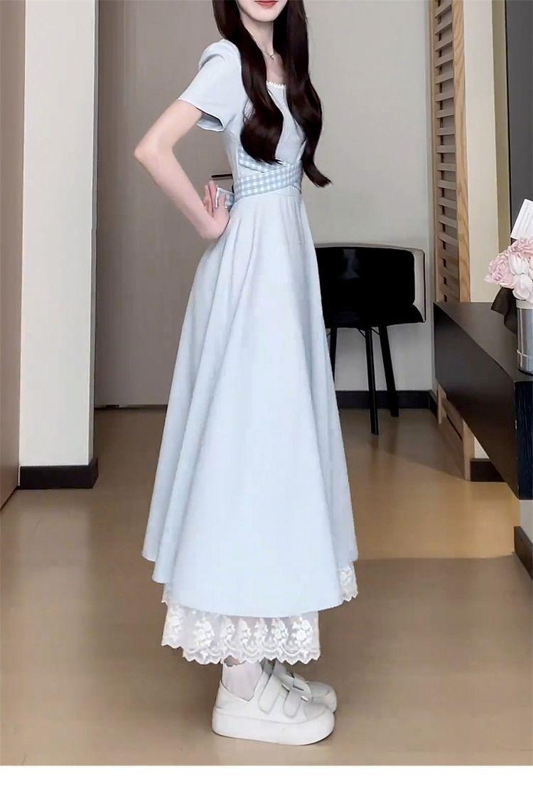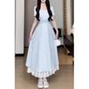Vestido Francés Azul de Cintura Alta para Mujer 2025 Estilo Popular de Principios de Verano de Este Año Manga Corta Falda Larga