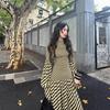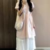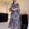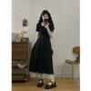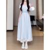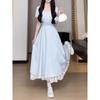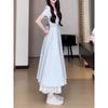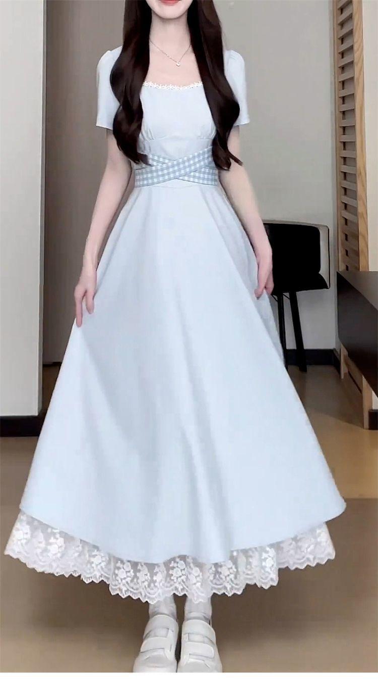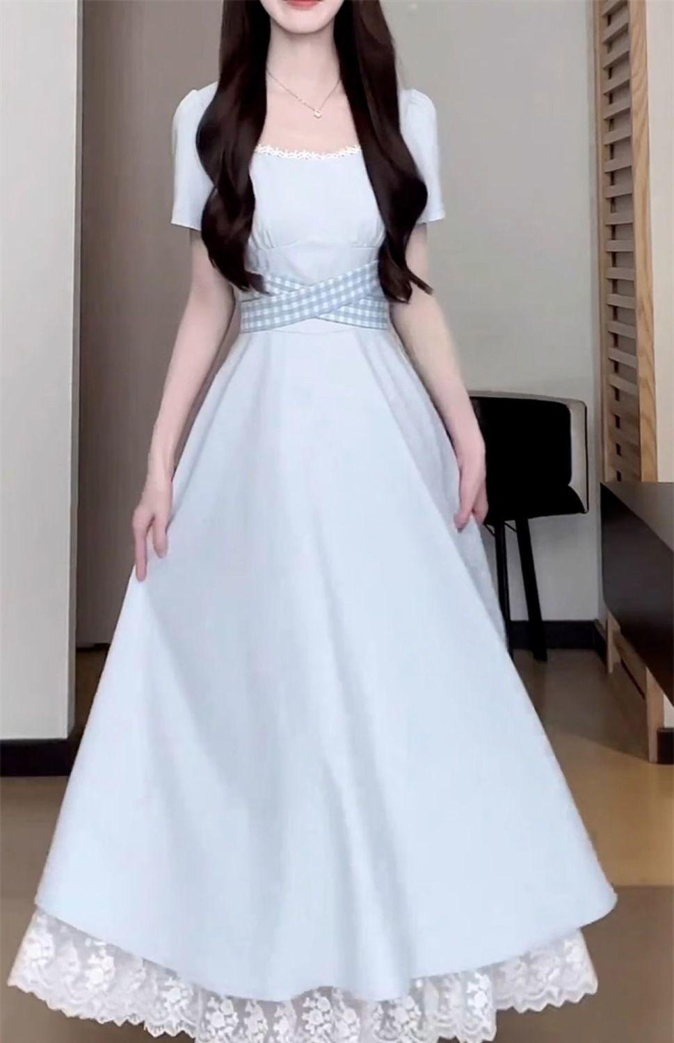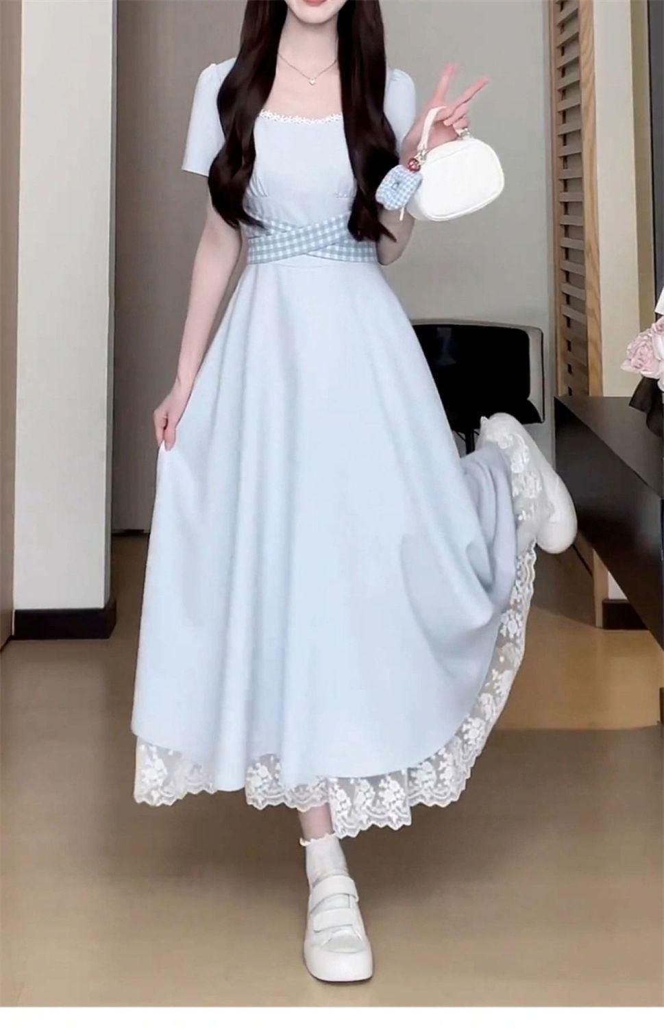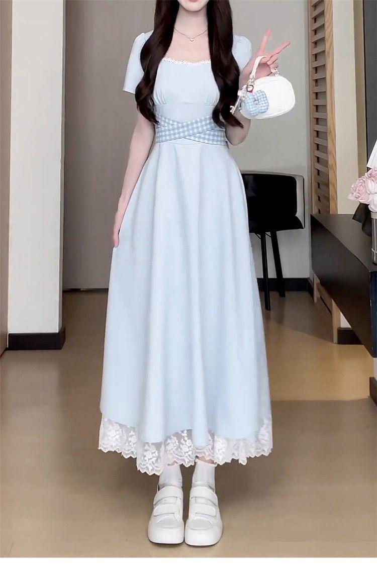 Vestido Francés Azul de Cintura Alta para Mujer 2025 Estilo Popular de Principios de Verano de Este Año Manga Corta Falda Larga