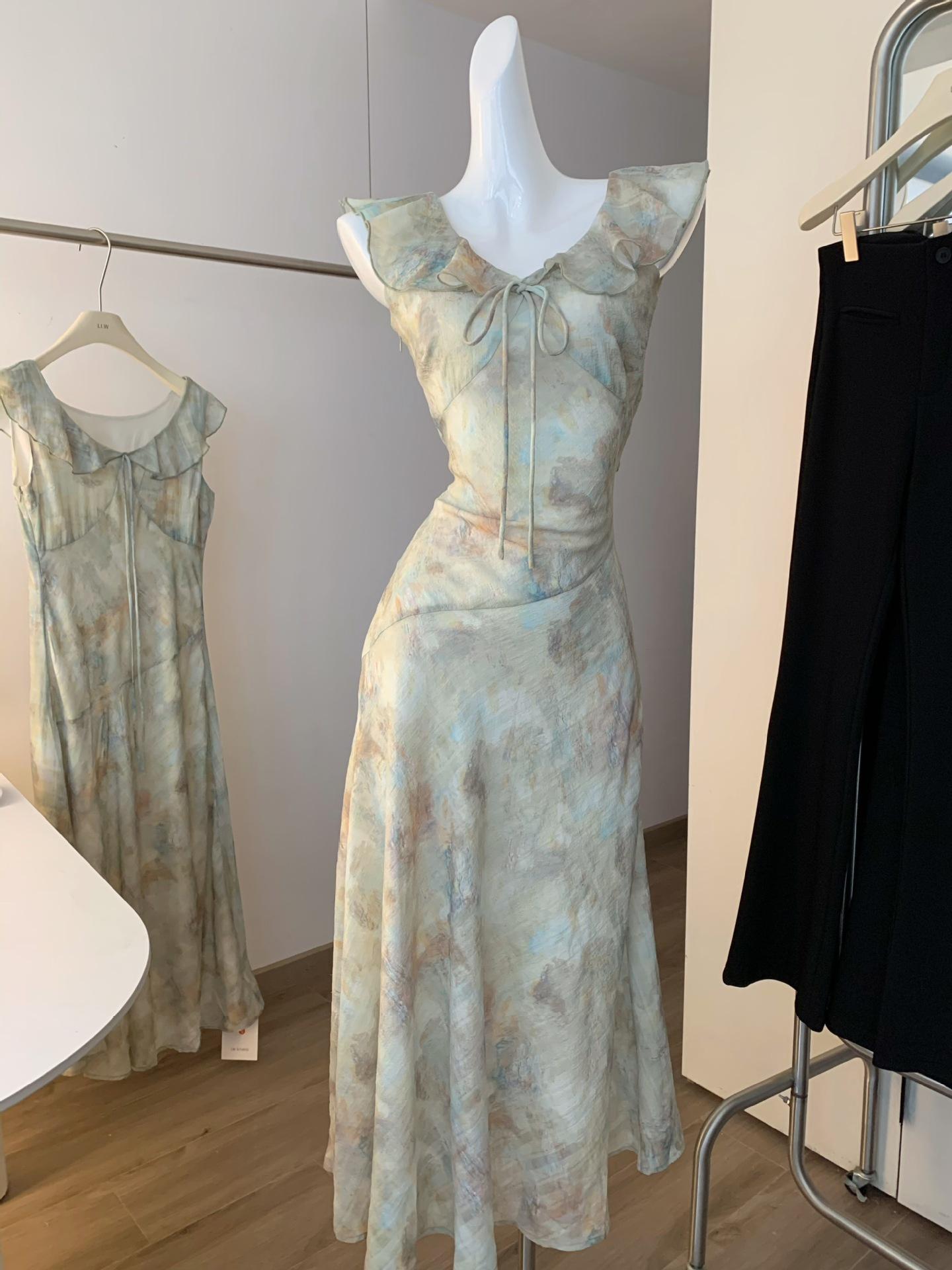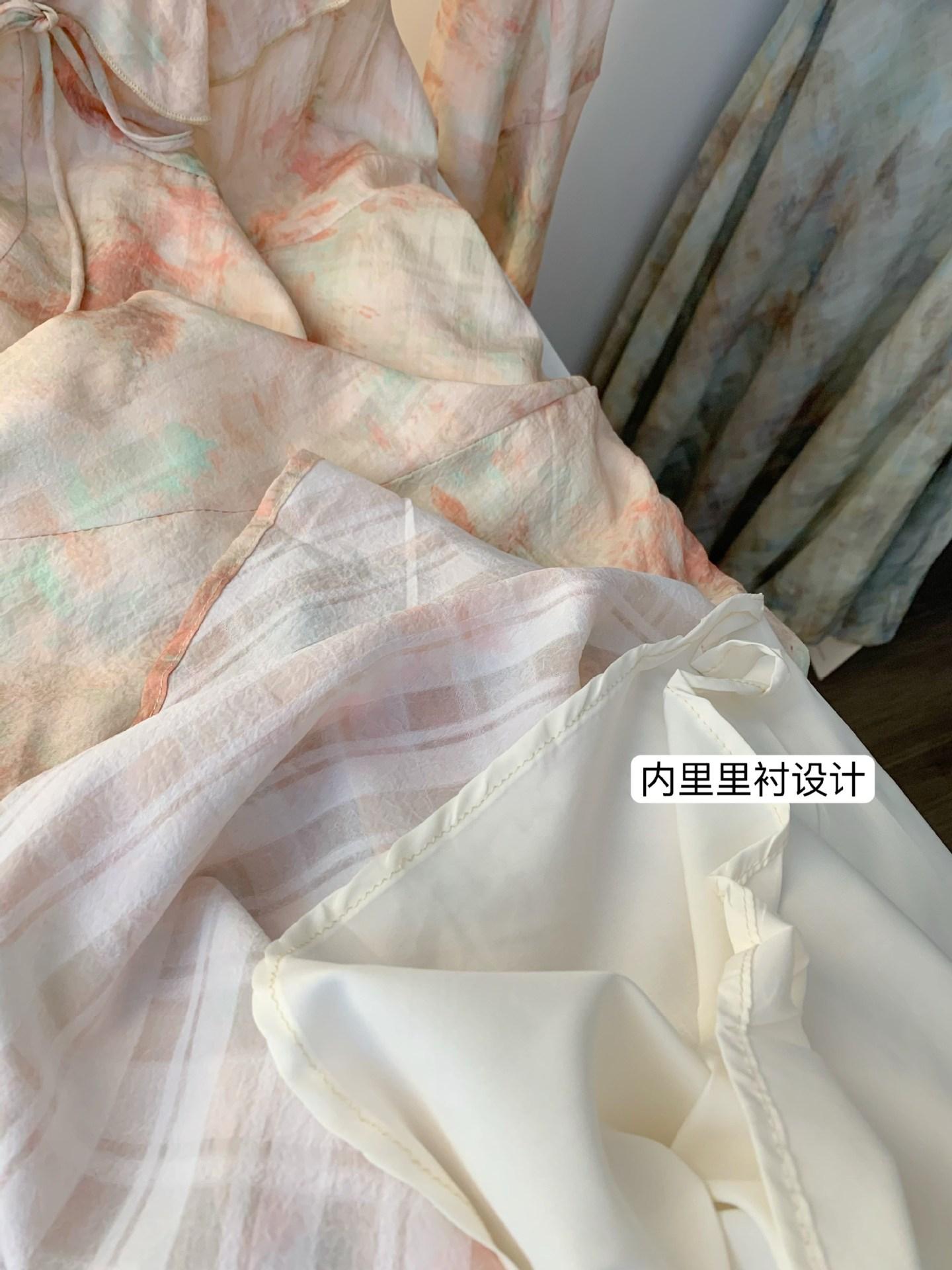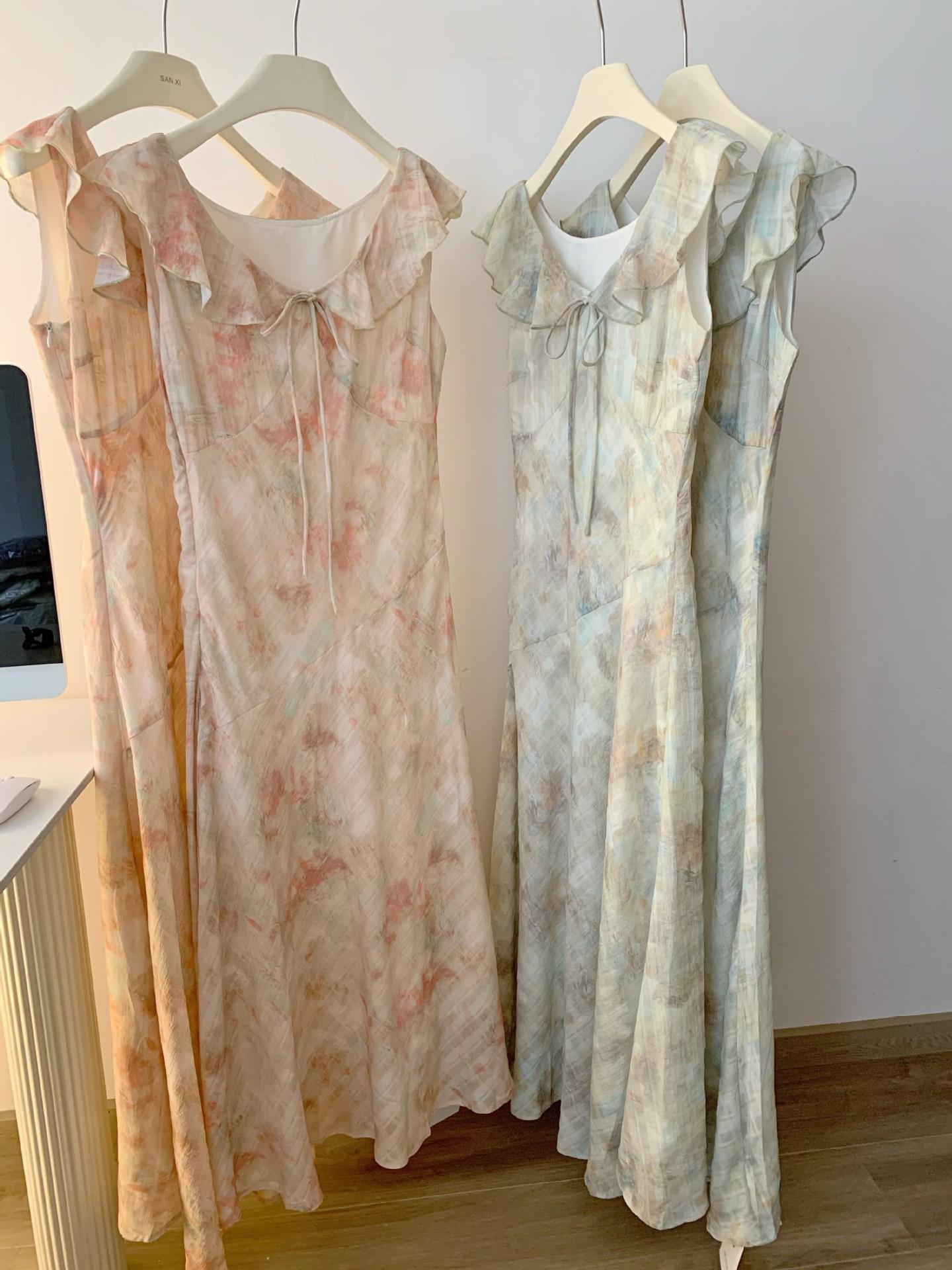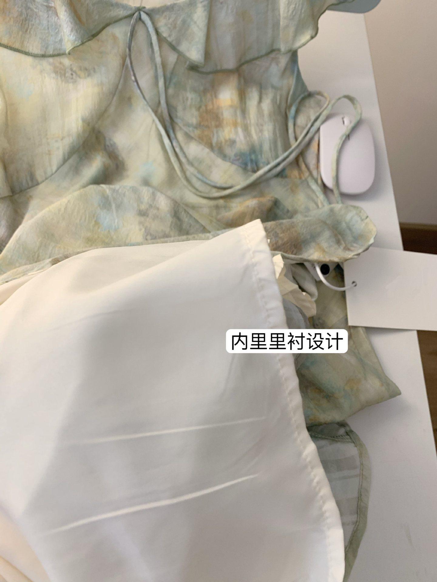 Falda Estampado Francés Balanceándose Nuevo Jacquard Tridimensional de Alta Riqueza Tie-dye Tirantes Vestido de Tirantes Verano Mujer Lazo Cuello U Largo