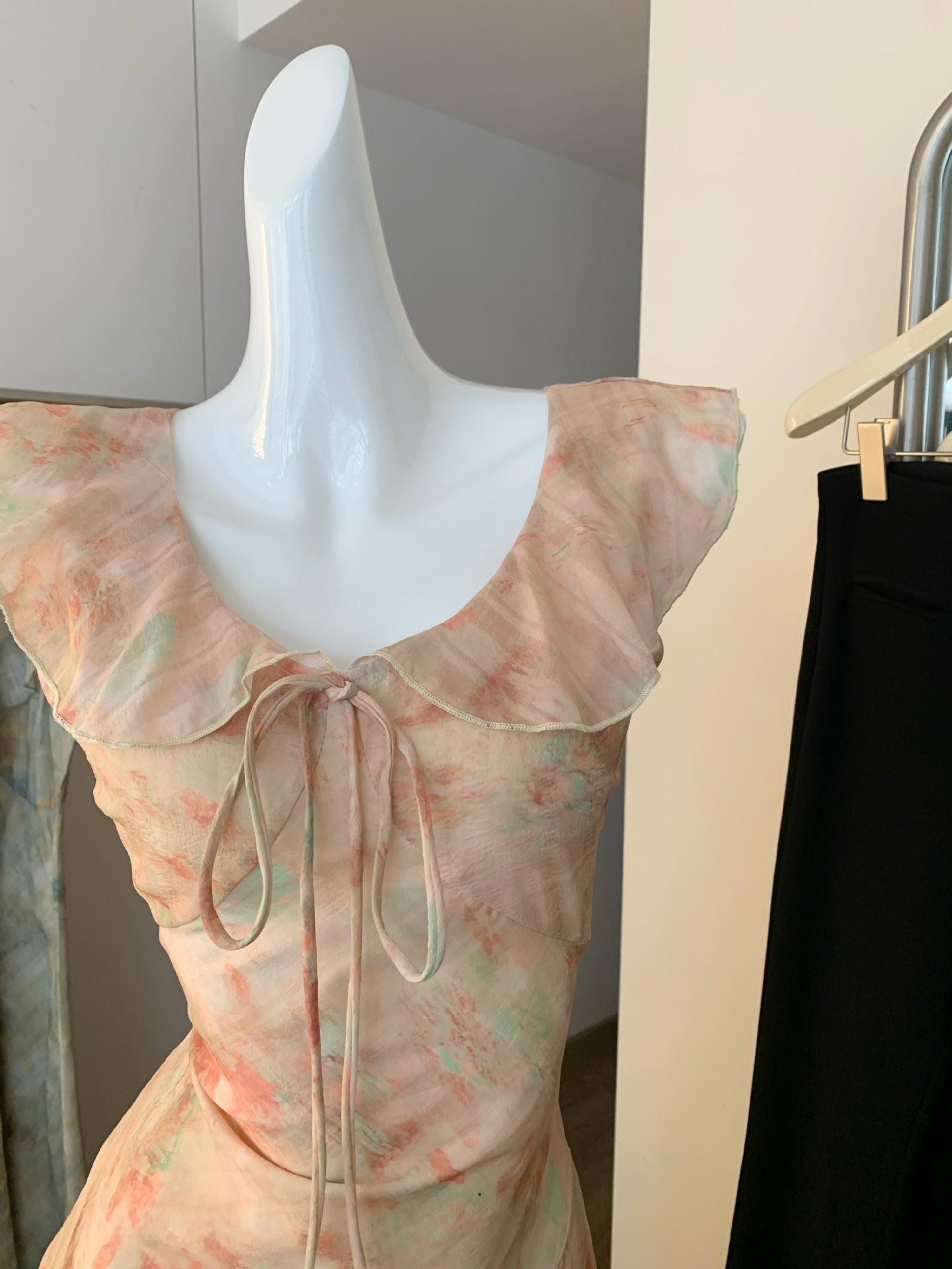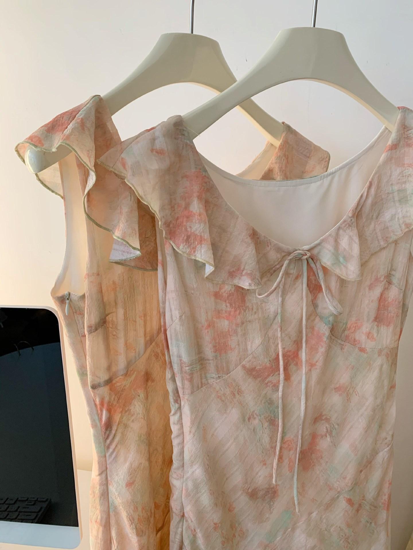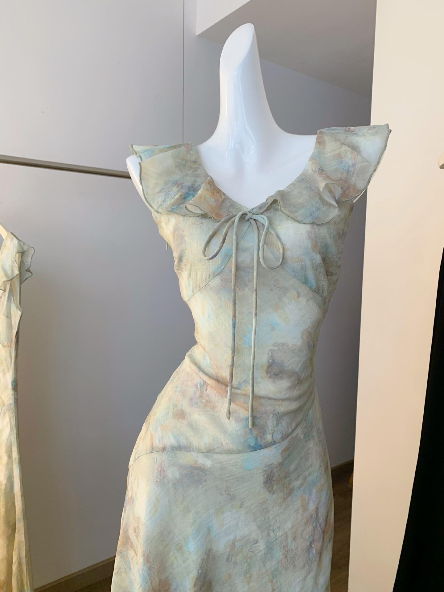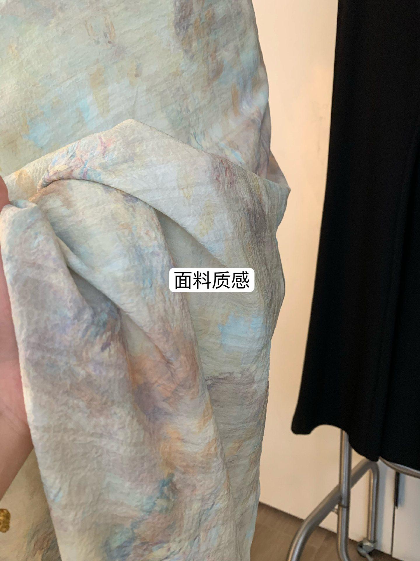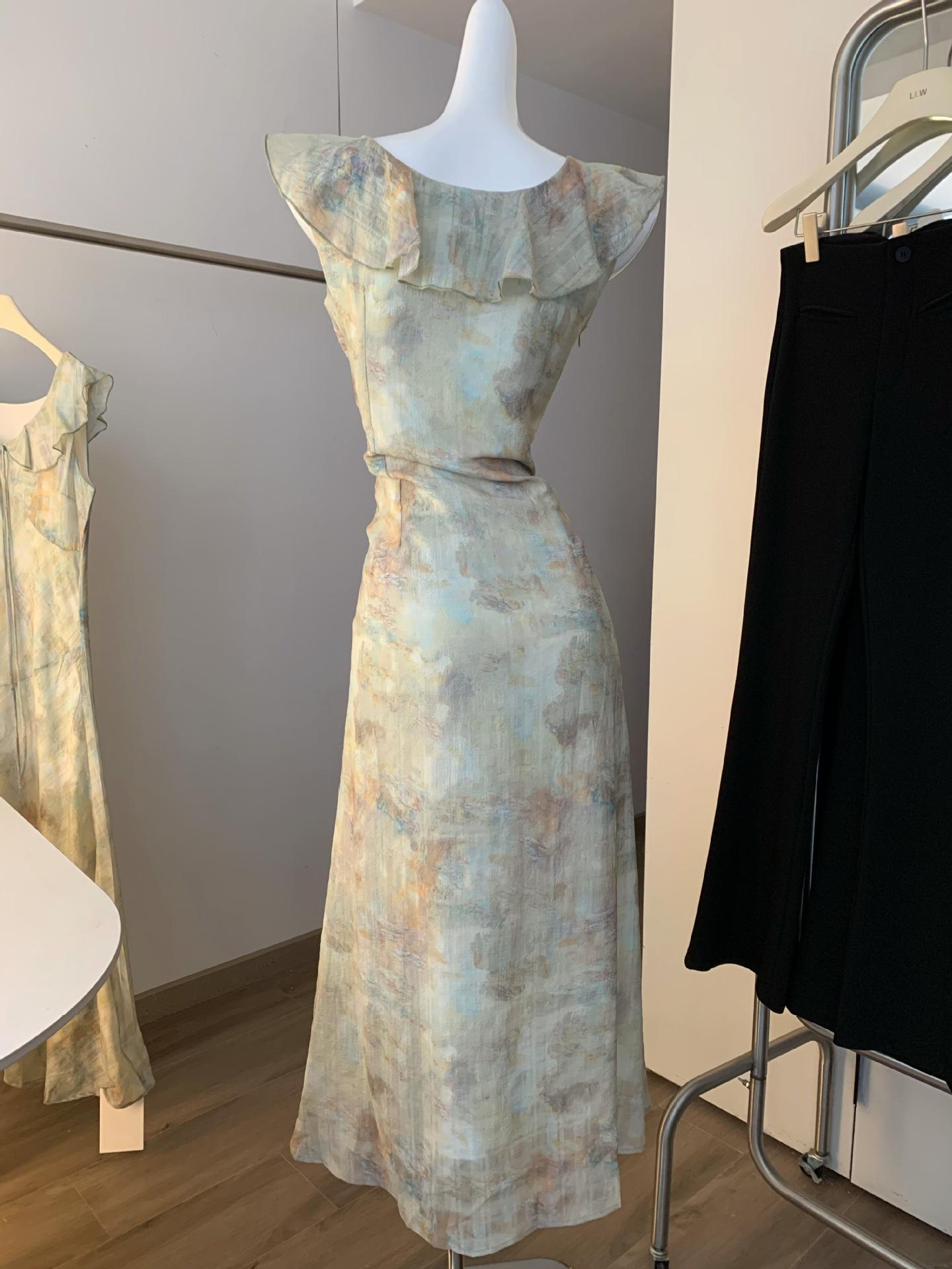 Falda Estampado Francés Balanceándose Nuevo Jacquard Tridimensional de Alta Riqueza Tie-dye Tirantes Vestido de Tirantes Verano Mujer Lazo Cuello U Largo