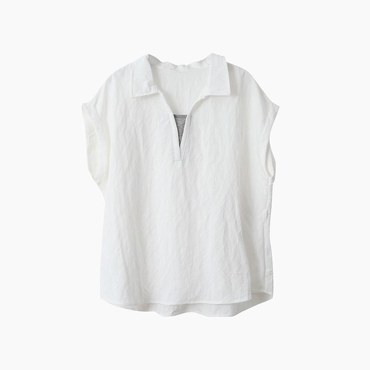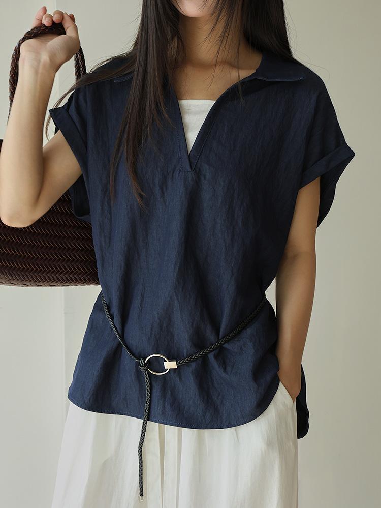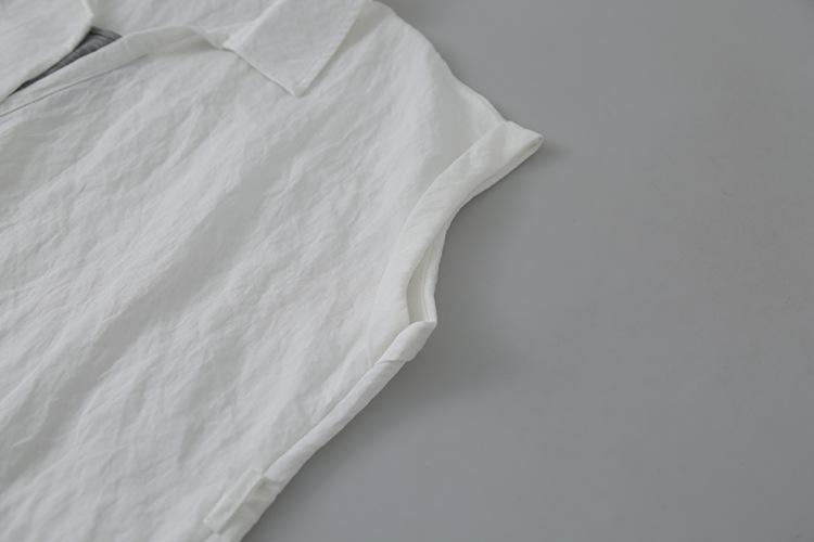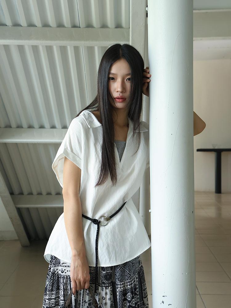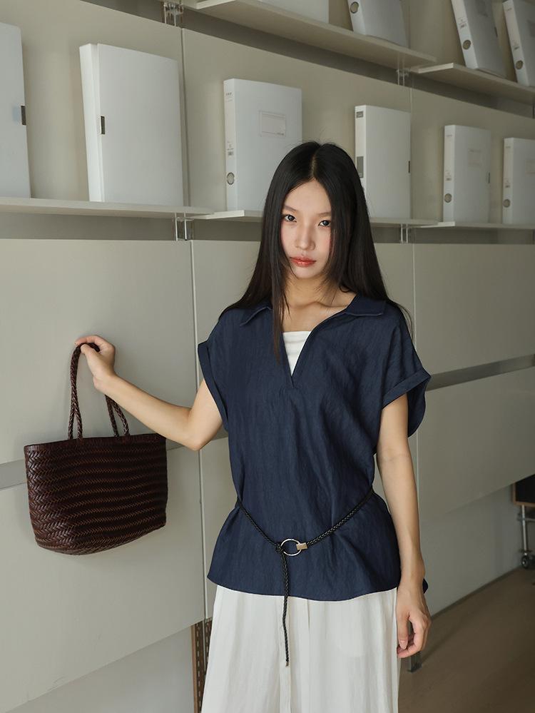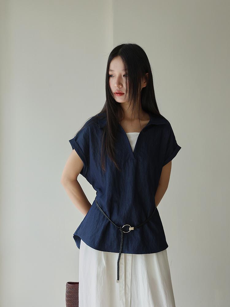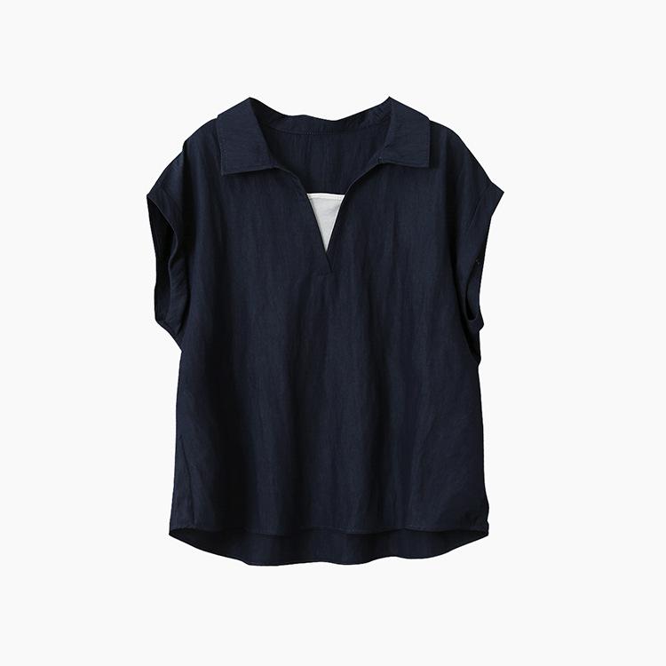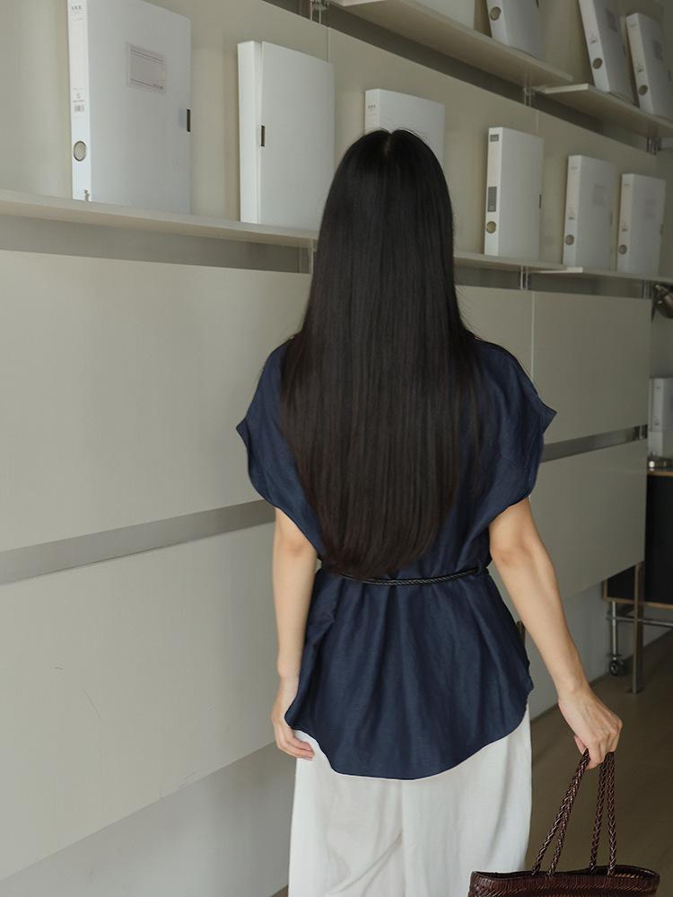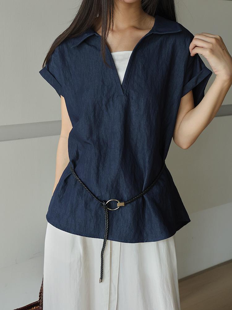 [Oufan] Camisa de Manga Corta con Cuello en V y Diseño de Falso Dos Piezas que Ciñe la Cintura para Mujer Verano Nueva Silueta Adelgazante Camisa Elegante sin Mangas 2995