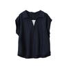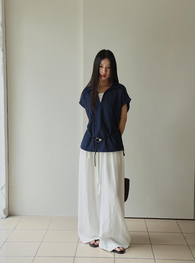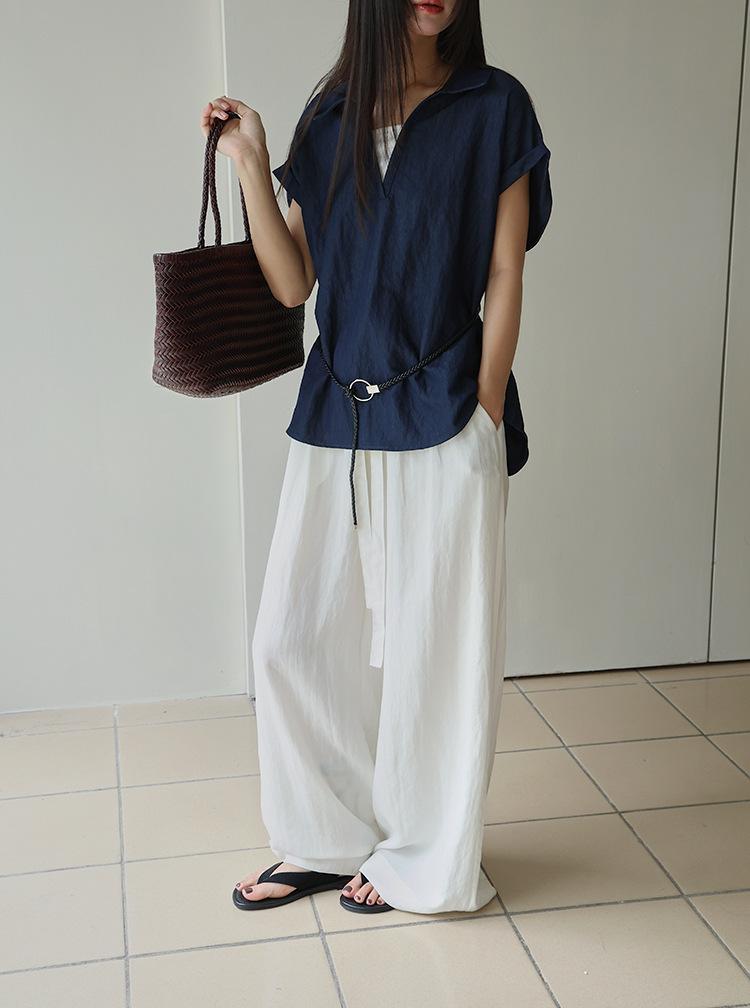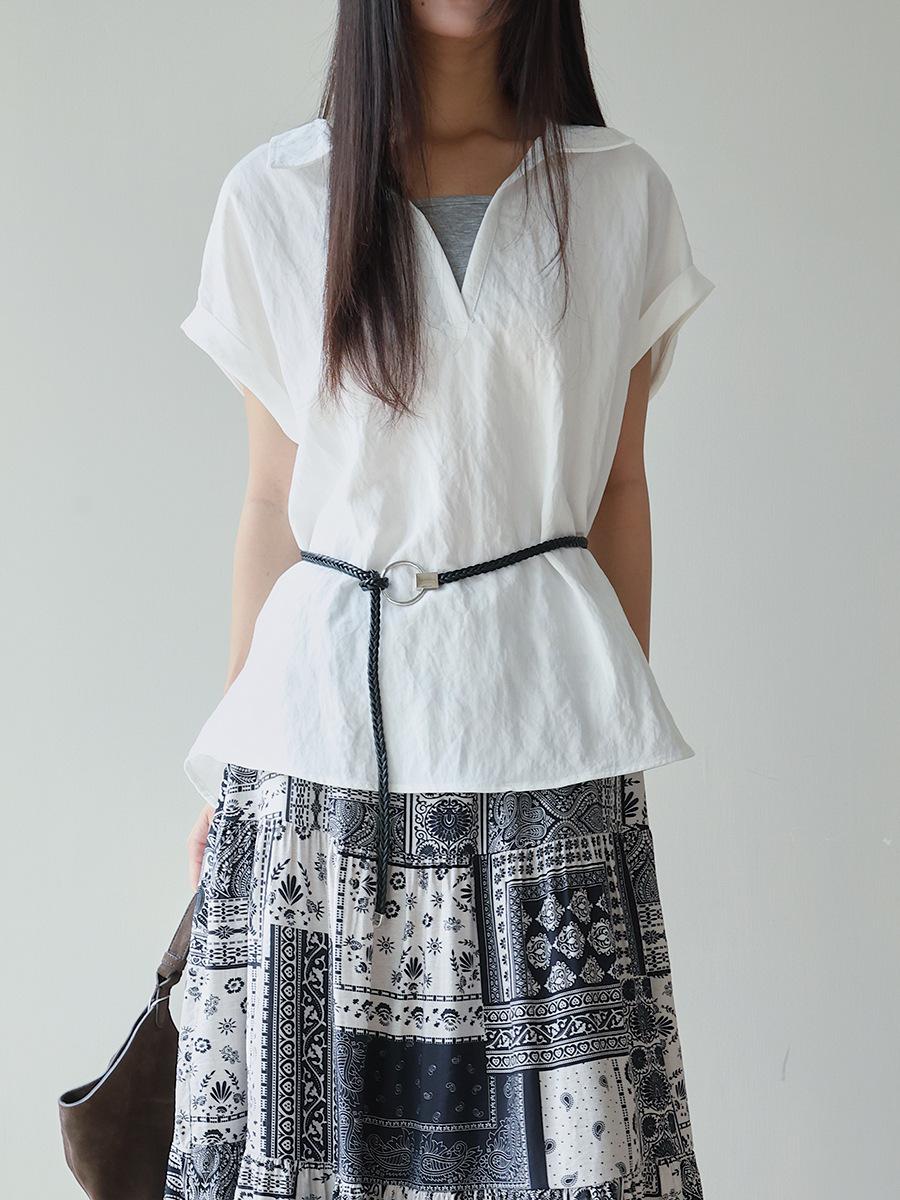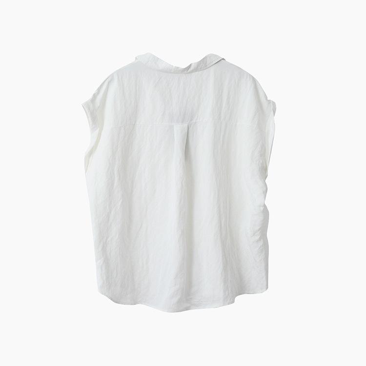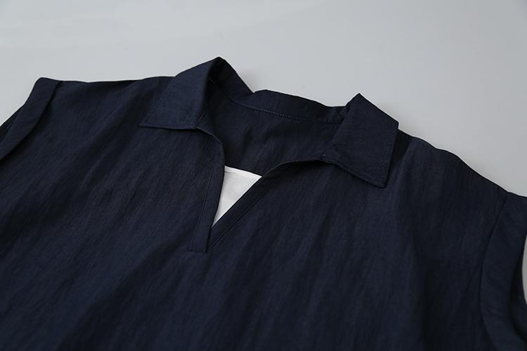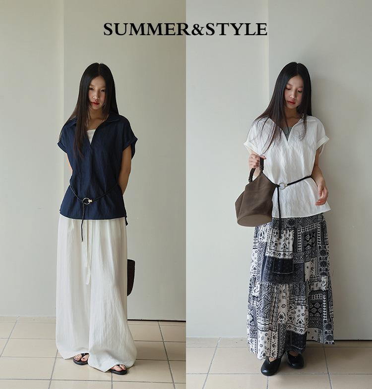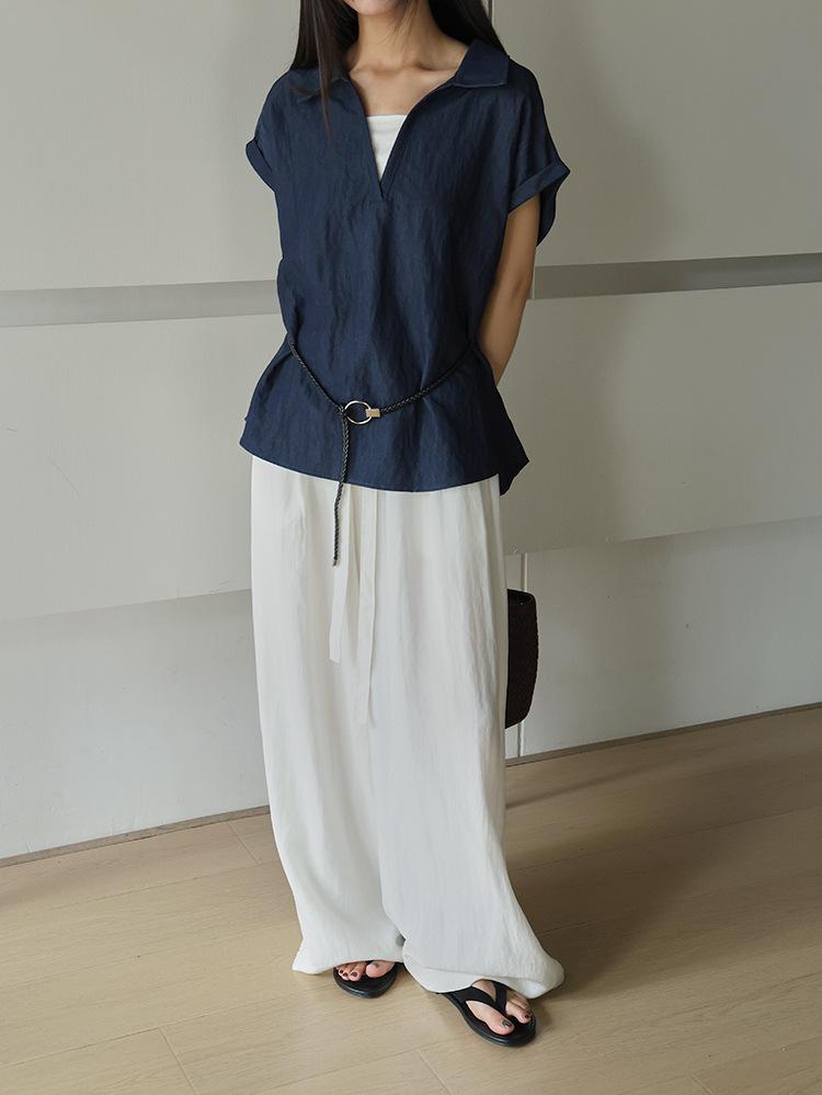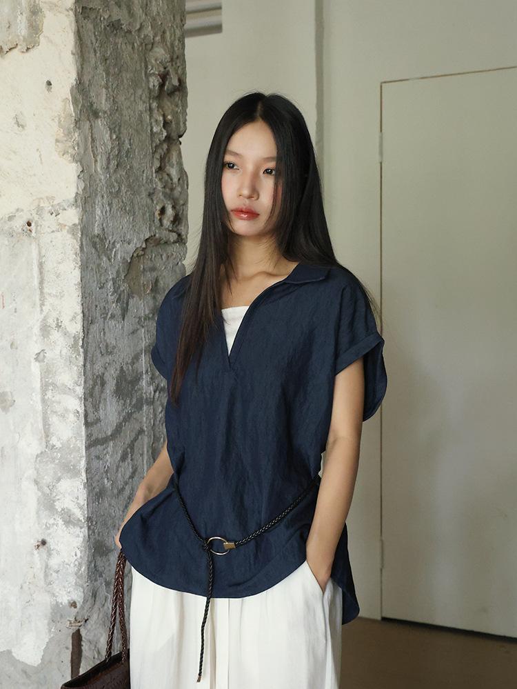 [Oufan] Camisa de Manga Corta con Cuello en V y Diseño de Falso Dos Piezas que Ciñe la Cintura para Mujer Verano Nueva Silueta Adelgazante Camisa Elegante sin Mangas 2995