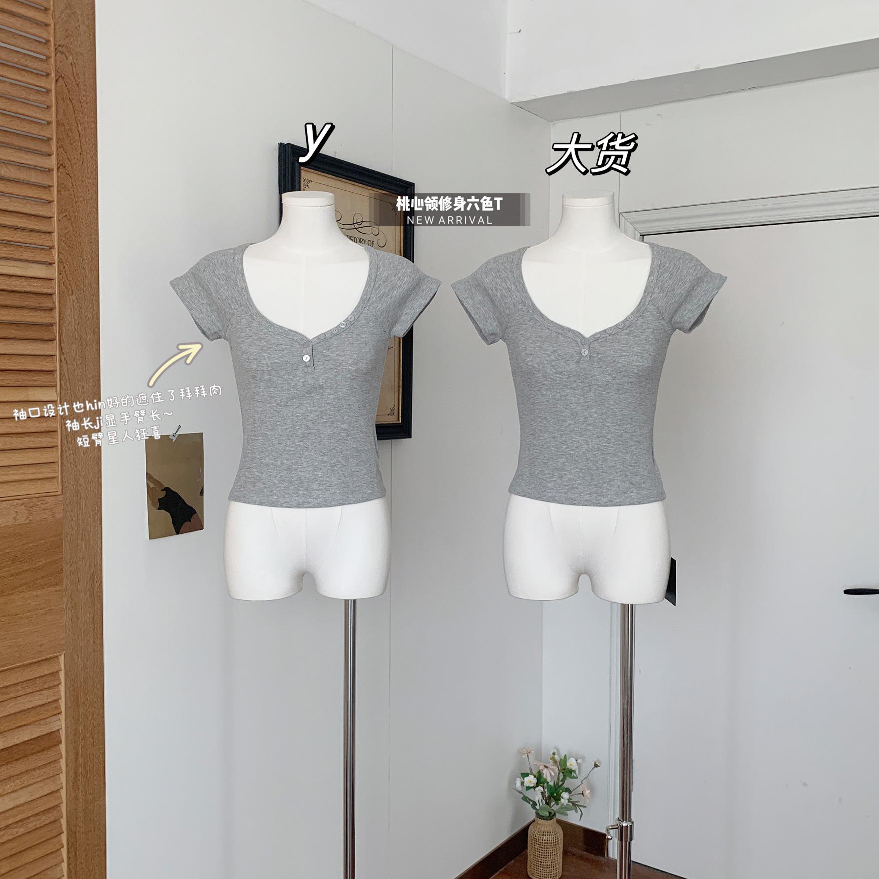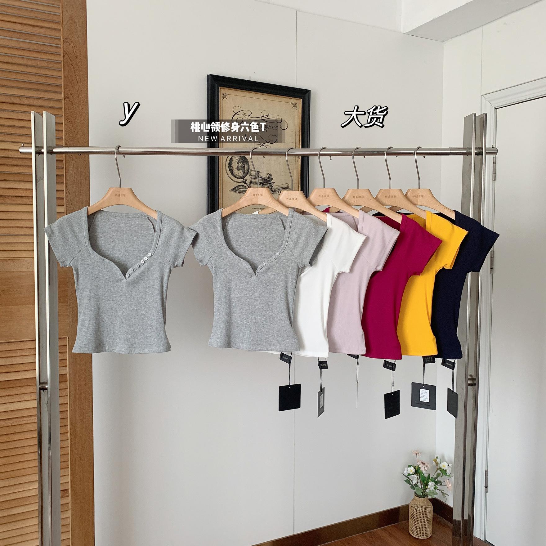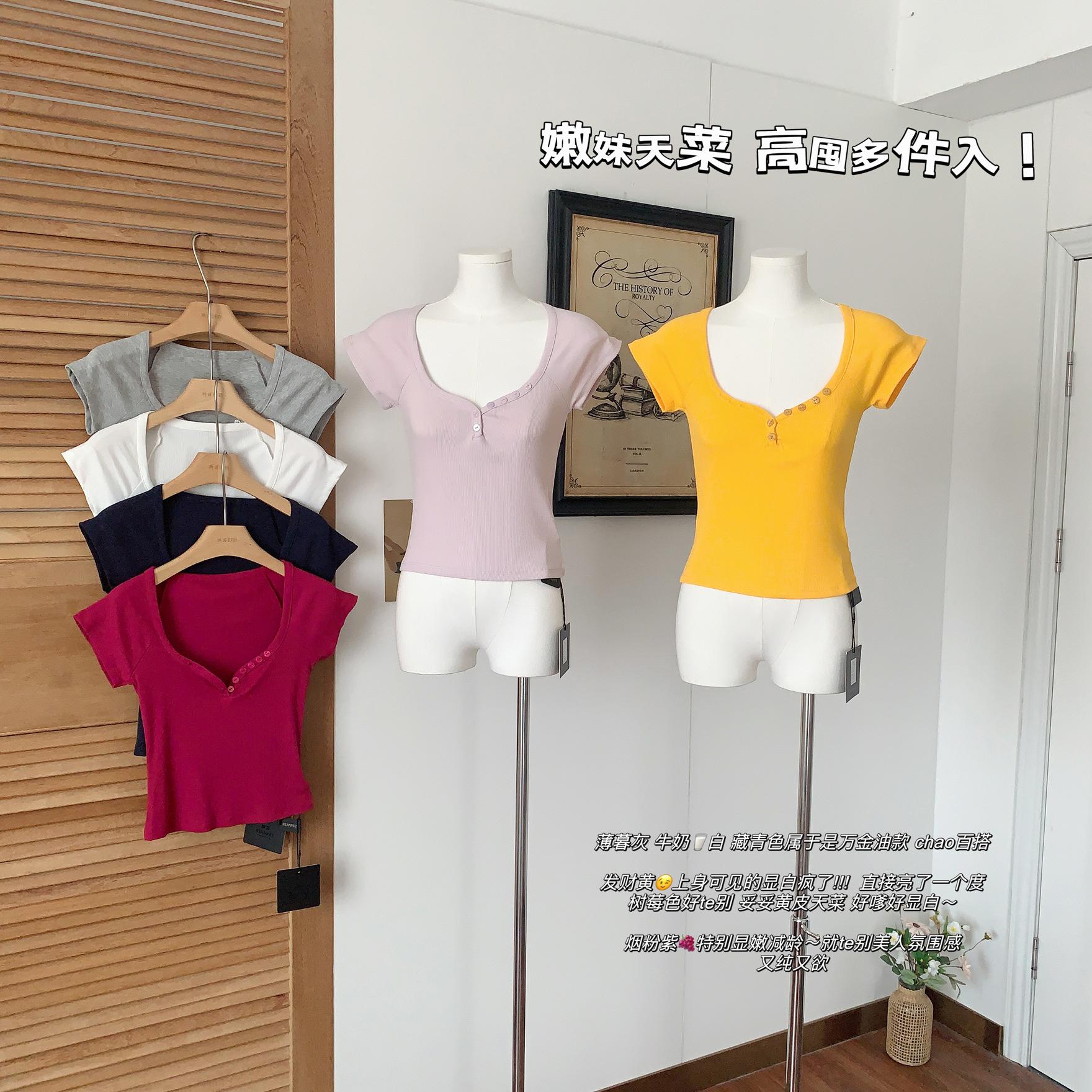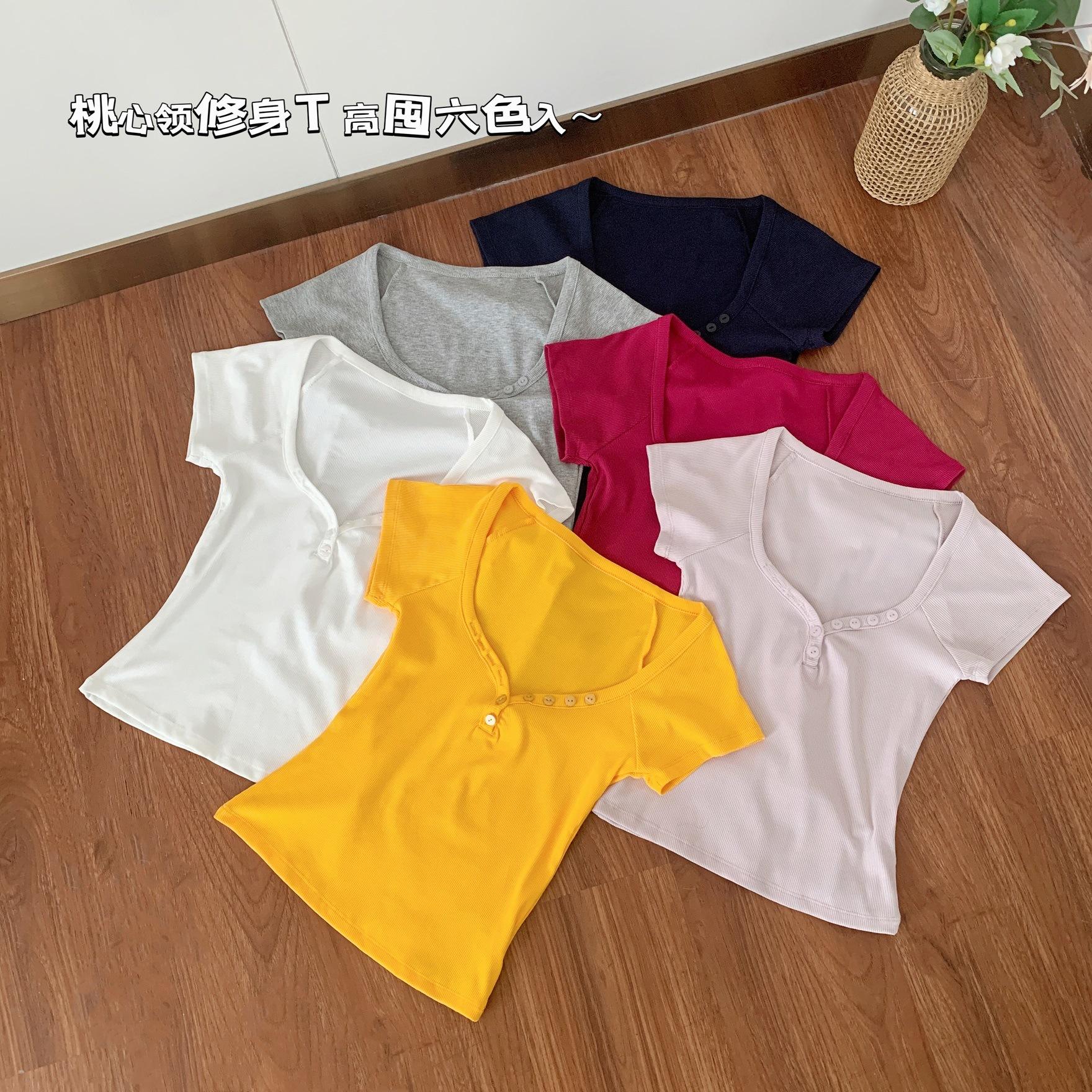 ¡Nen Mei Tian Cai Gao acumula muchas piezas de B! Camiseta de cuello melocotón de corte ajustado para mujer, top de manga corta para primavera y verano