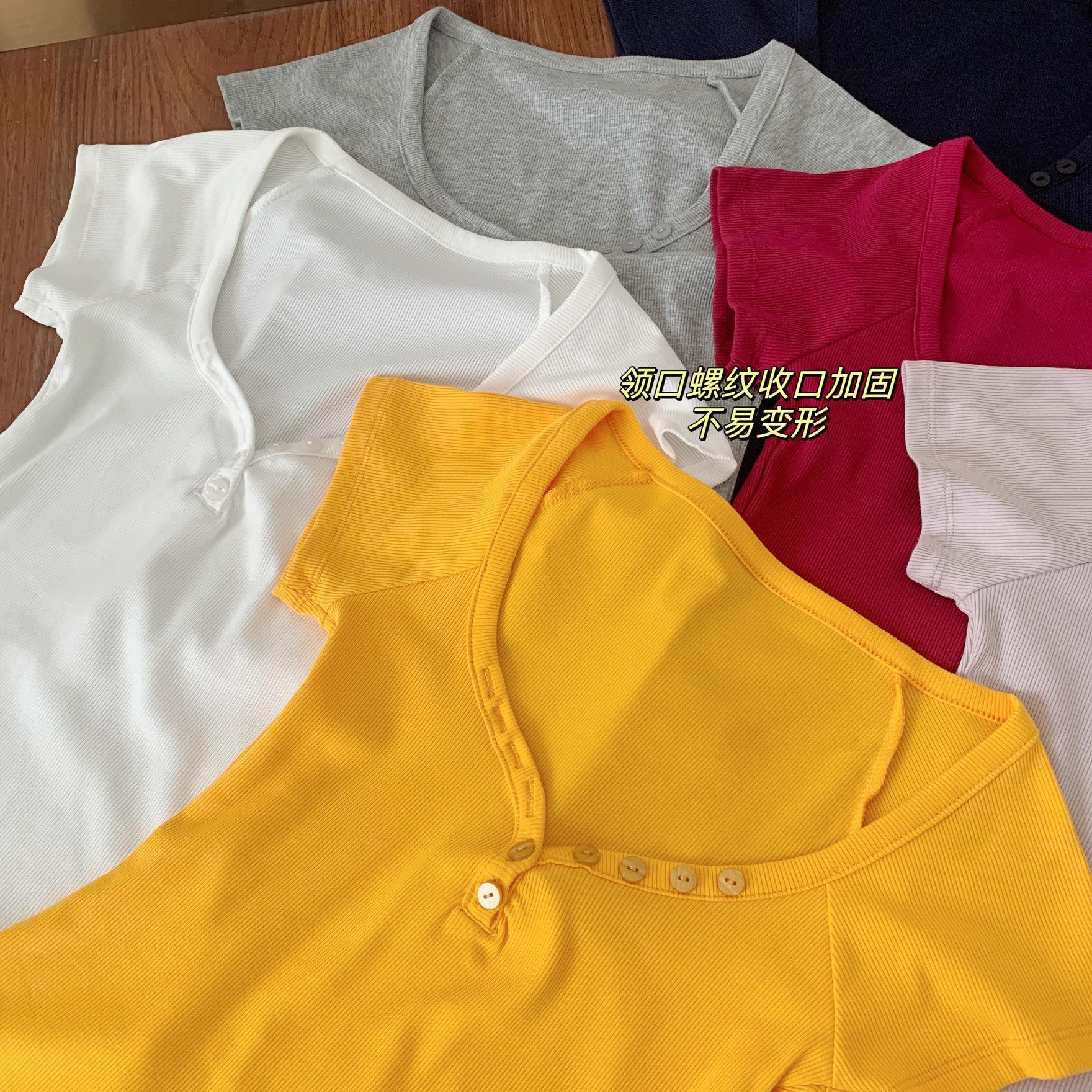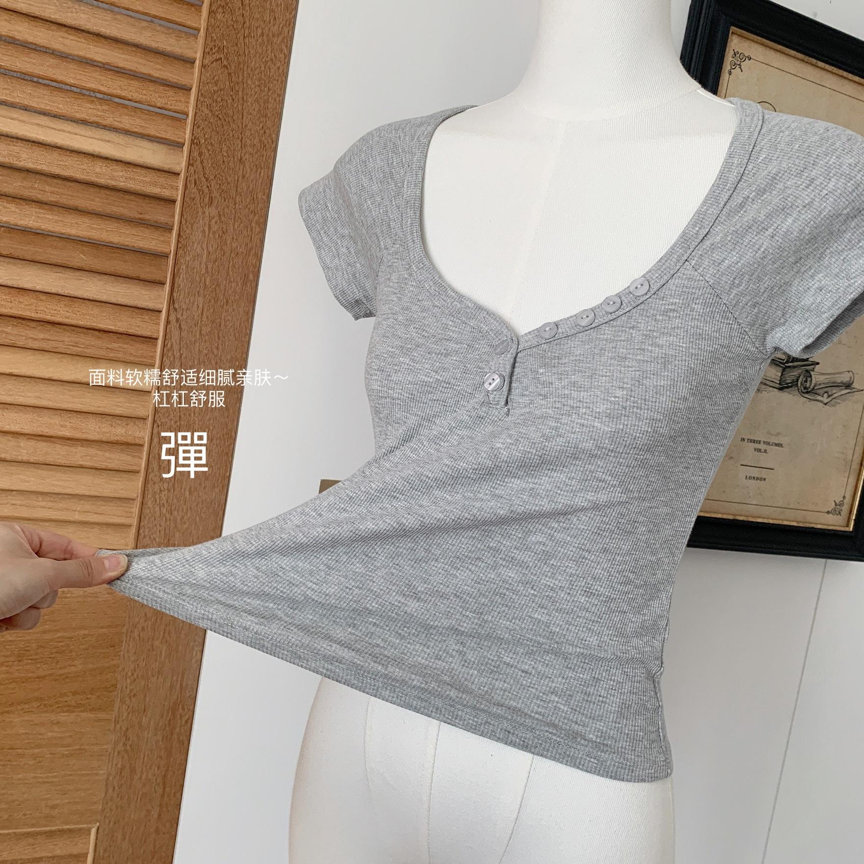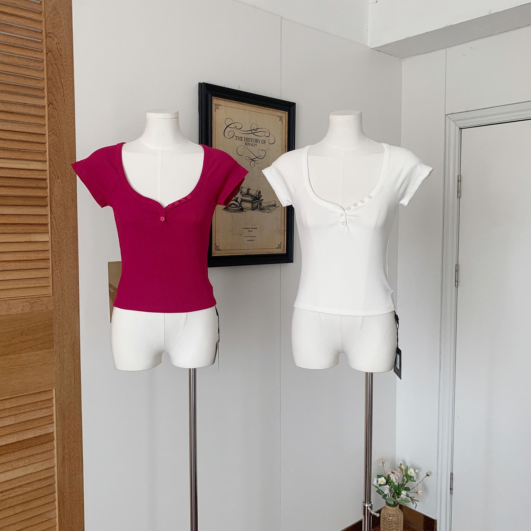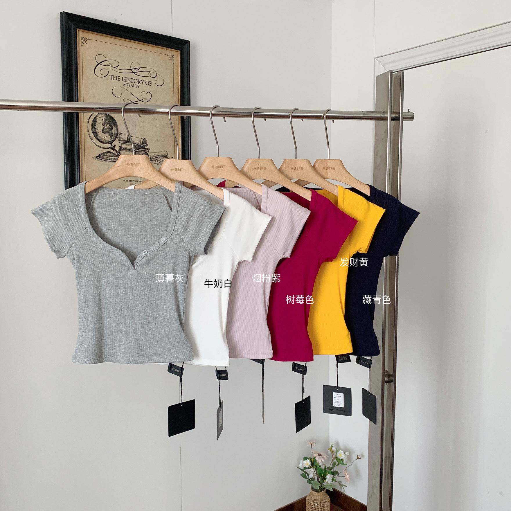 ¡Nen Mei Tian Cai Gao acumula muchas piezas de B! Camiseta de cuello melocotón de corte ajustado para mujer, top de manga corta para primavera y verano