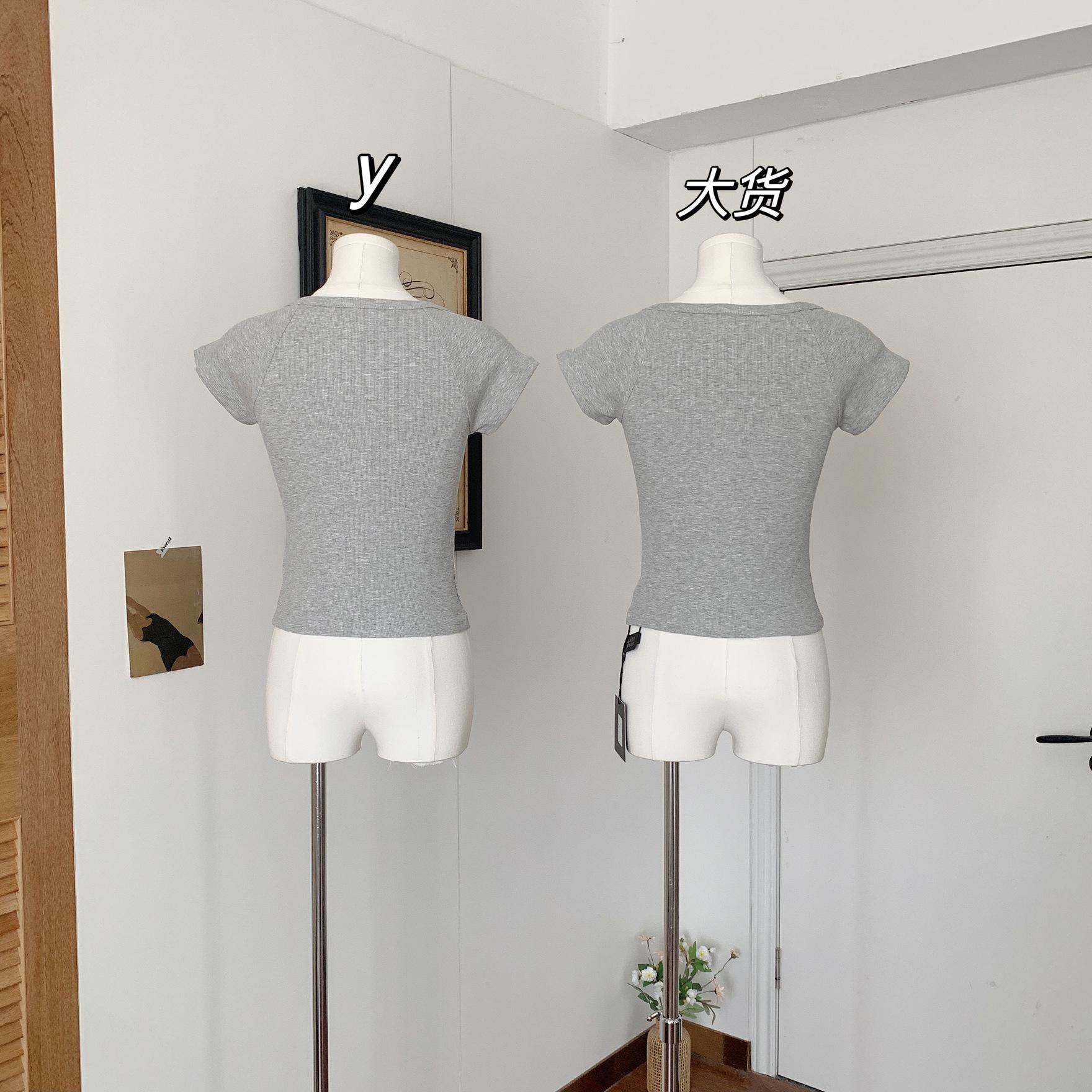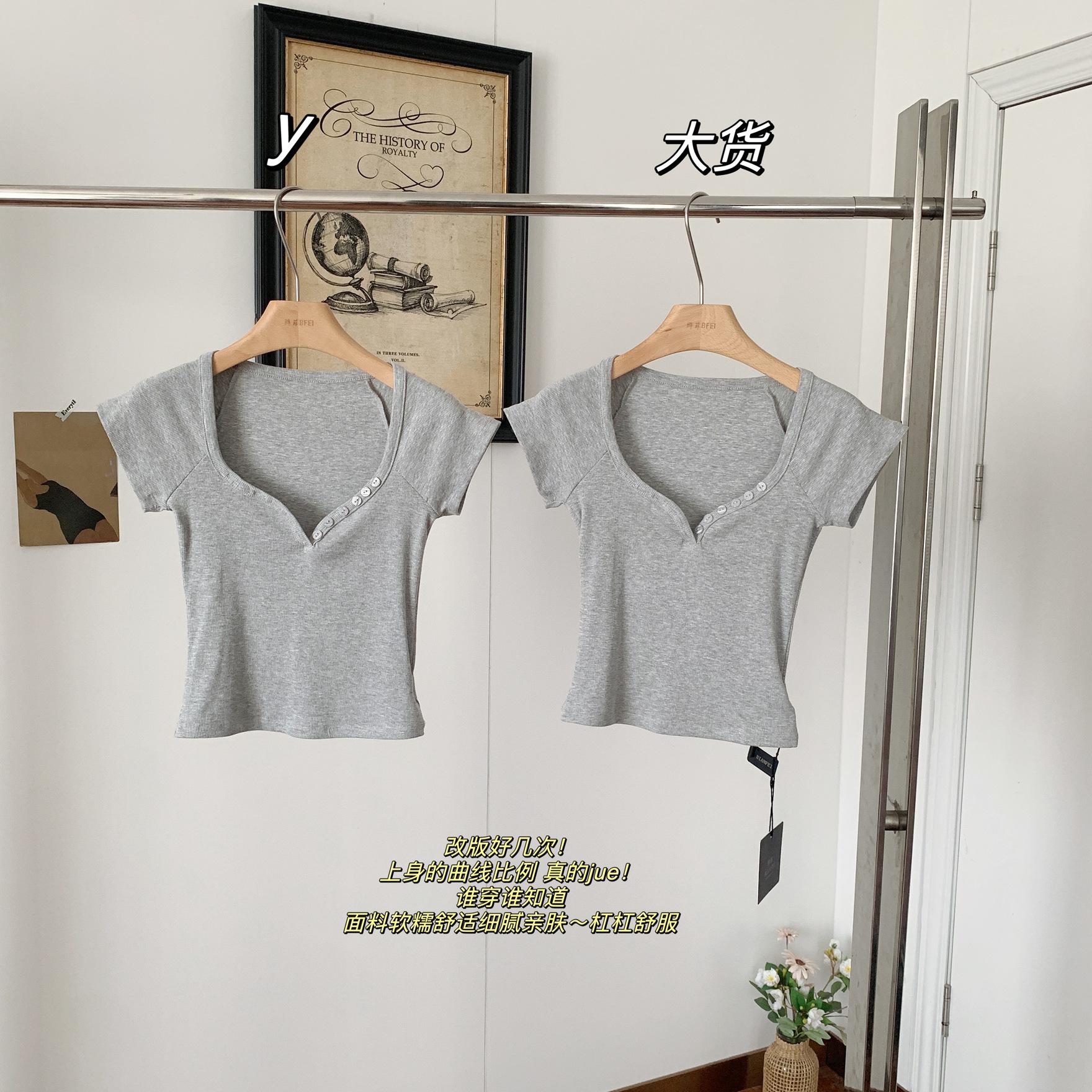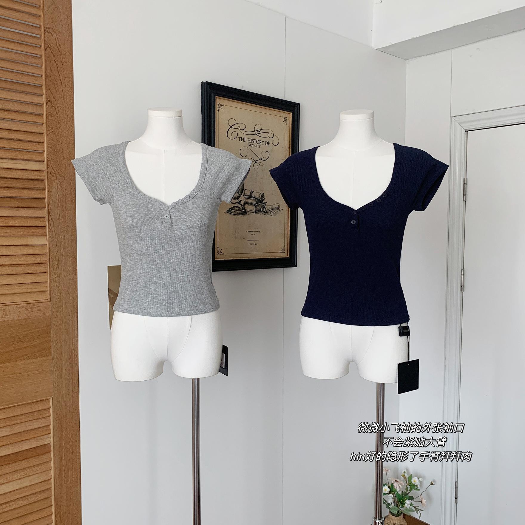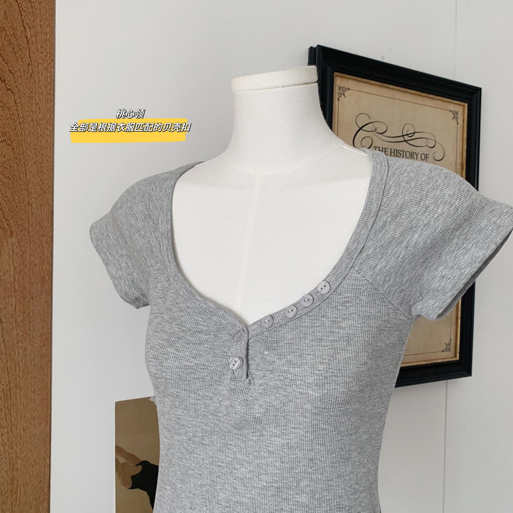 ¡Nen Mei Tian Cai Gao acumula muchas piezas de B! Camiseta de cuello melocotón de corte ajustado para mujer, top de manga corta para primavera y verano