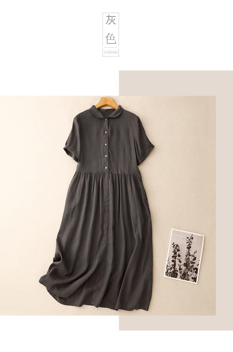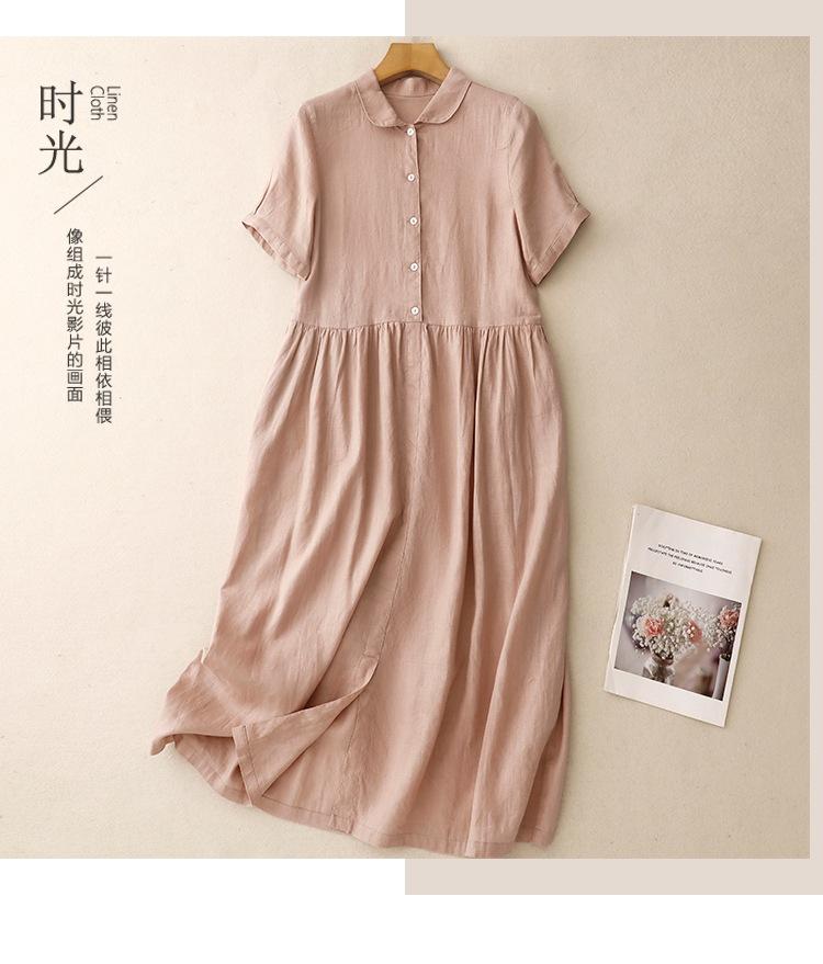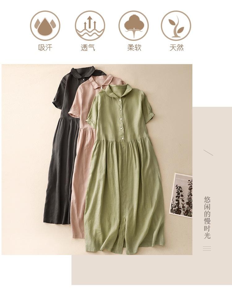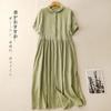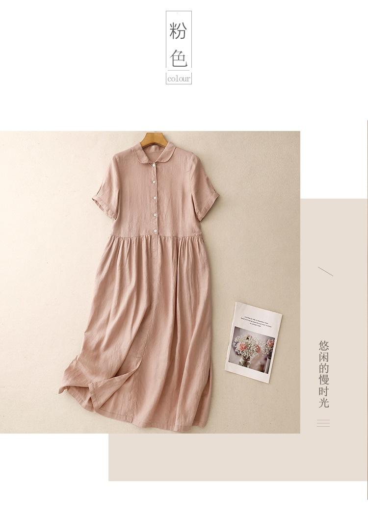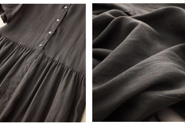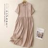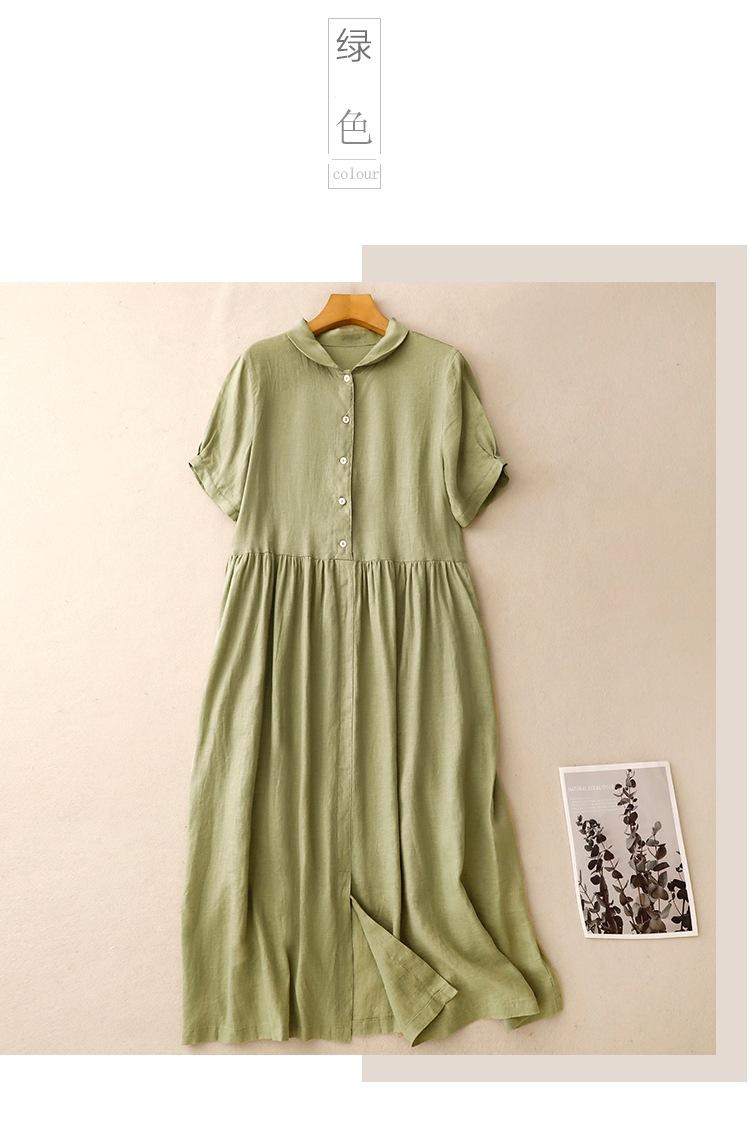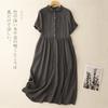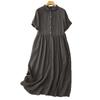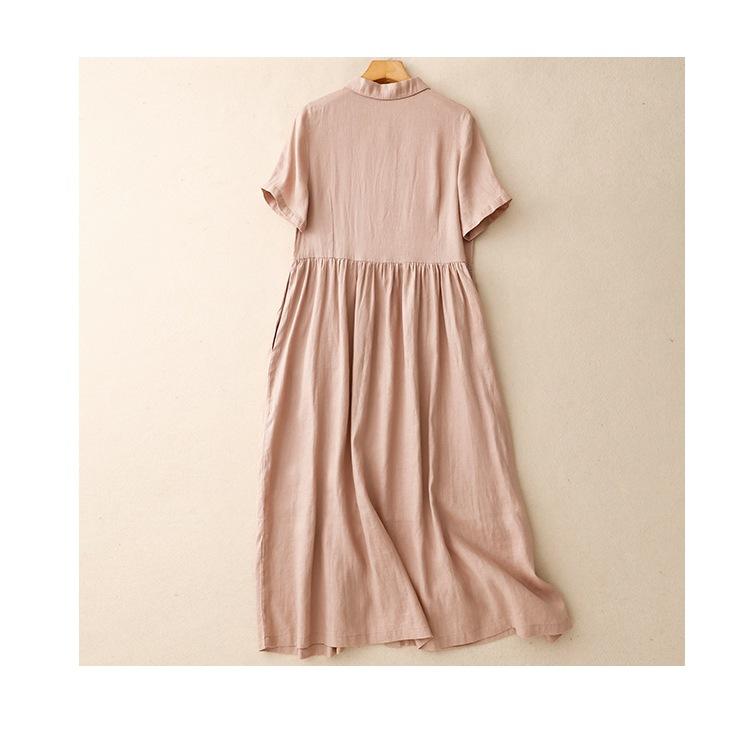 2025 Nuevo Vestido de Verano de Algodón y Lino de Manga Corta Vestido Camisero con Solapa Suelto Artístico Bajo Ancho Largo Medio