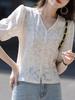 Cárdigan elegante de verano 2025 estilo francés con cuello en V y manga abullonada de goma. Camisa jacquard de moda elegante. Top para mujer