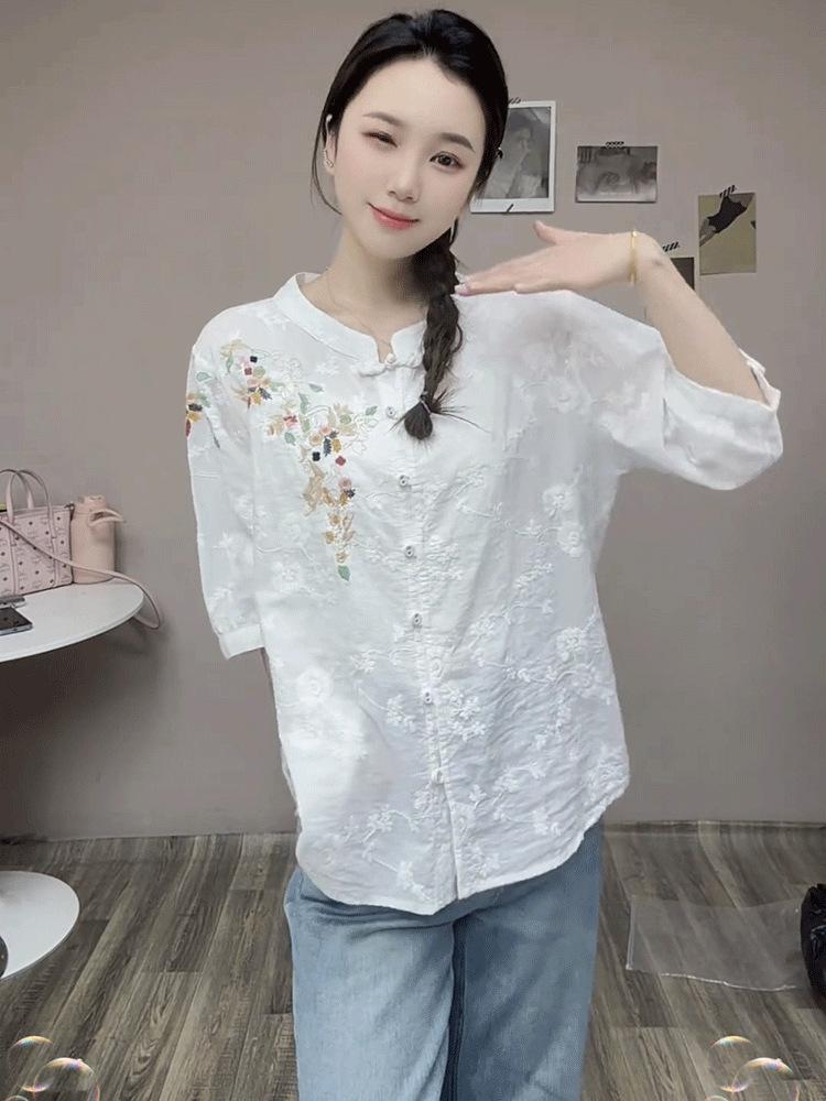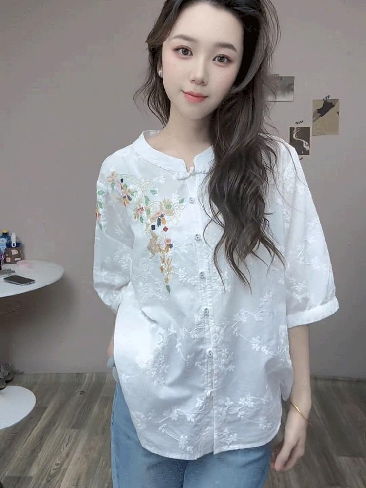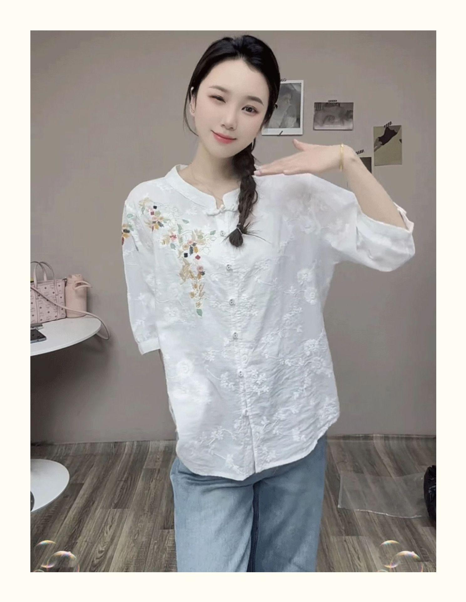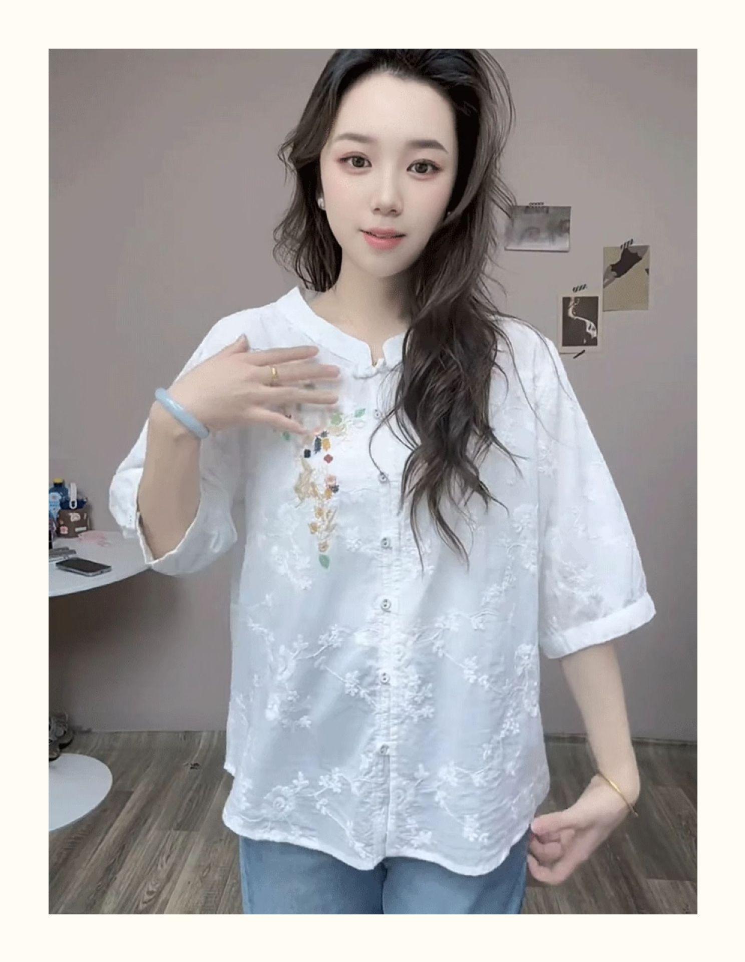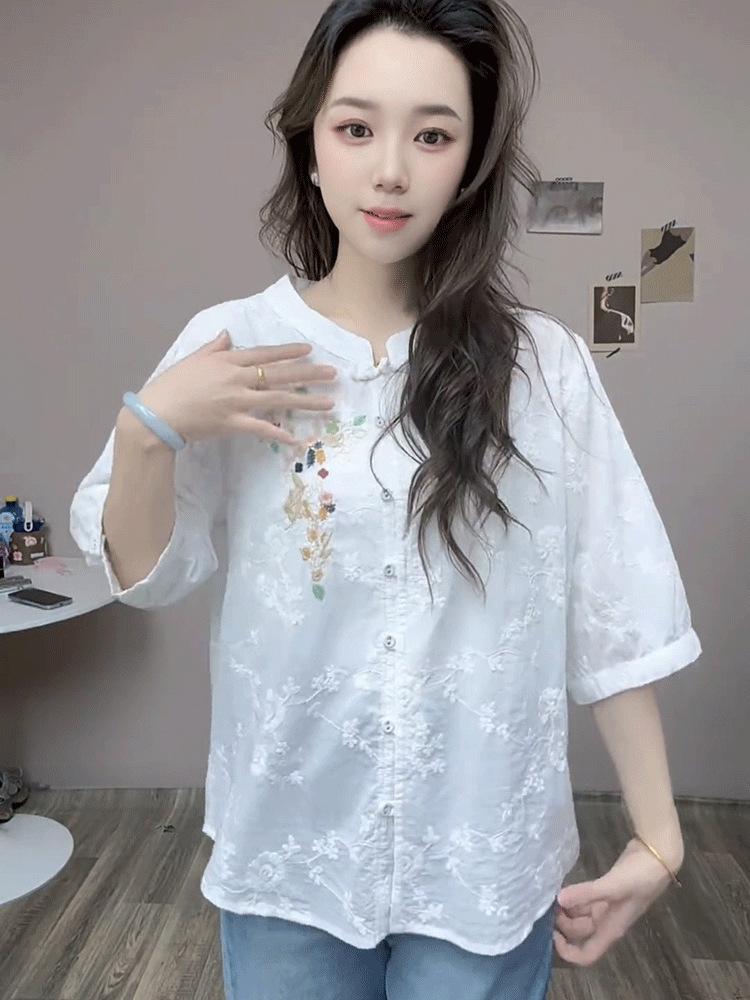 Verano 2025 Nuevo Nuevo Estilo Chino Estilo Nacional Botón Vintage Color Fresco Pequeño Camisa Bordada de Cuello Redondo Top Combinable