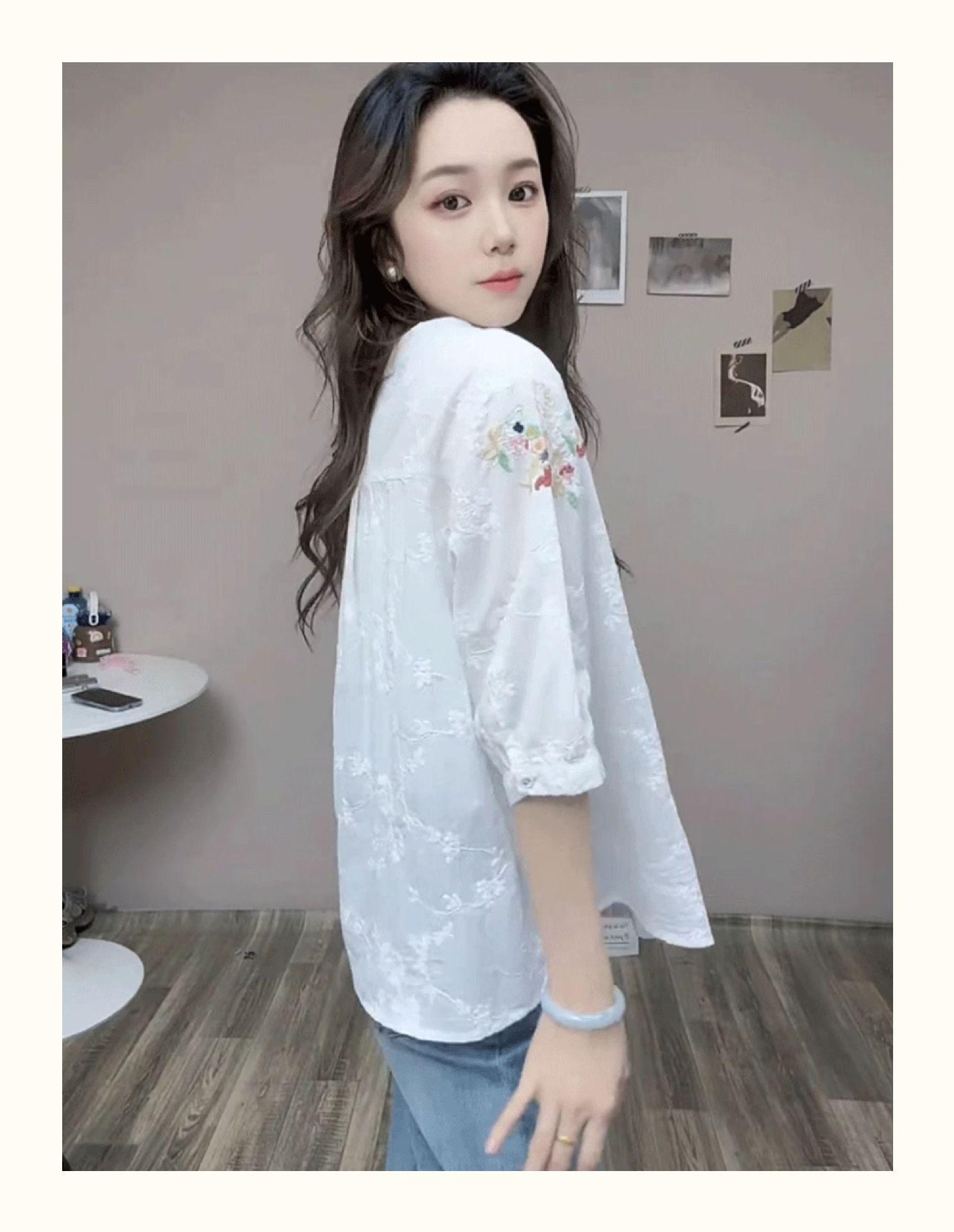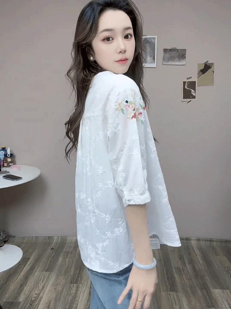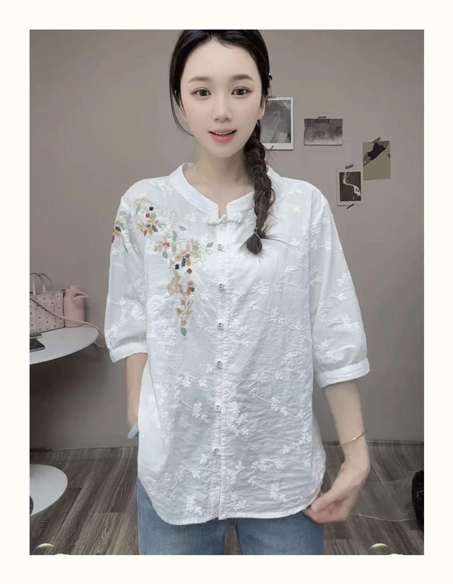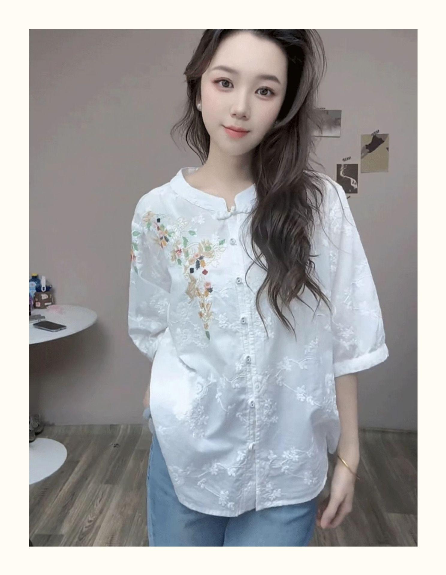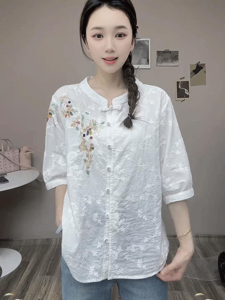 Verano 2025 Nuevo Nuevo Estilo Chino Estilo Nacional Botón Vintage Color Fresco Pequeño Camisa Bordada de Cuello Redondo Top Combinable