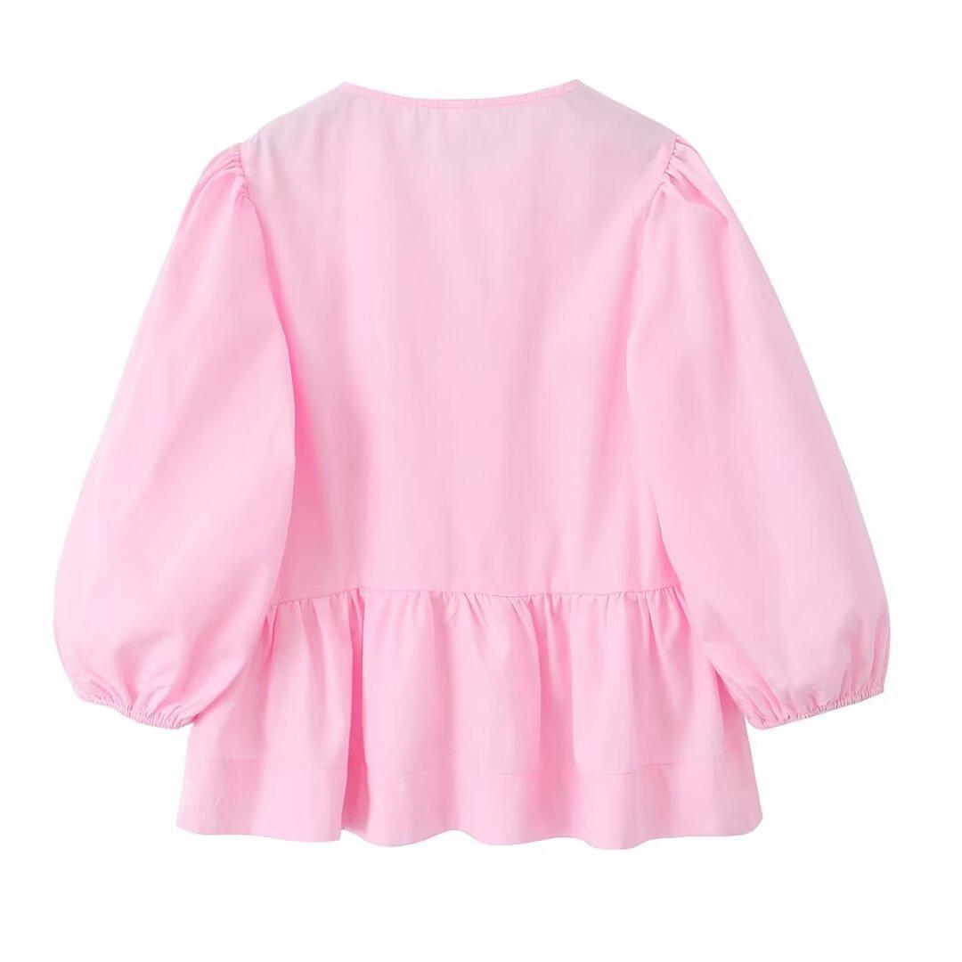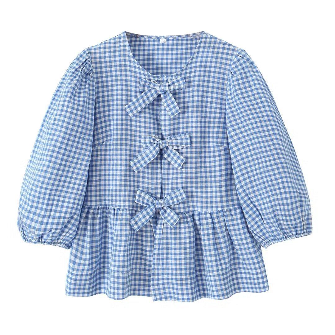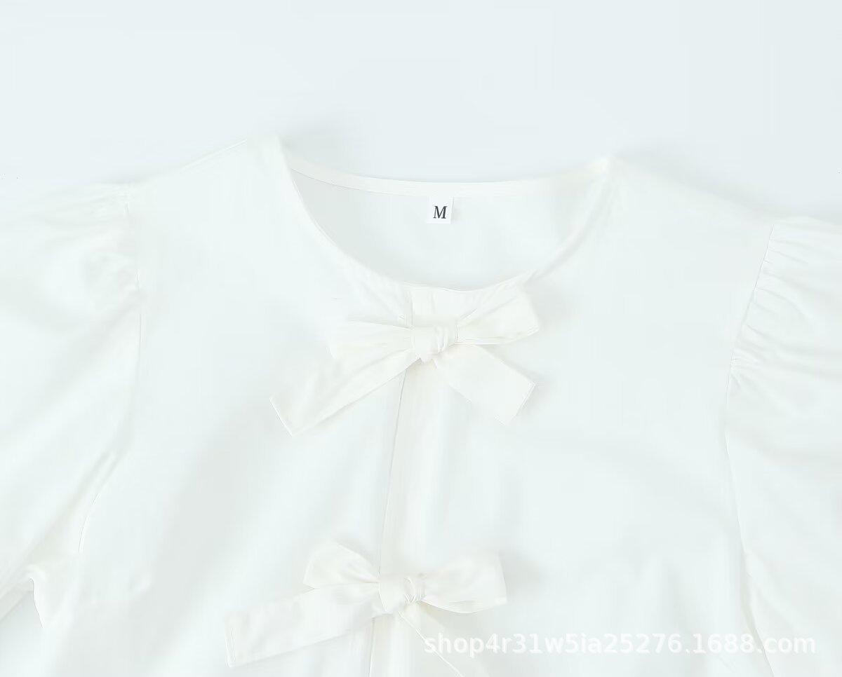 Estilo Europeo y Americano 2024 Verano Nueva Moda Versátil Color Sólido Lazo Manga Larga Cuello Redondo Camisa