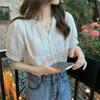 Compra Verano 2025 Nuevo Cuello en V Encaje Manga Abullonada Camisa Blanca Diseño Nicho Madurez Ligera Camisa de Manga Corta Top para Mujer al por mayor en Joom.pro