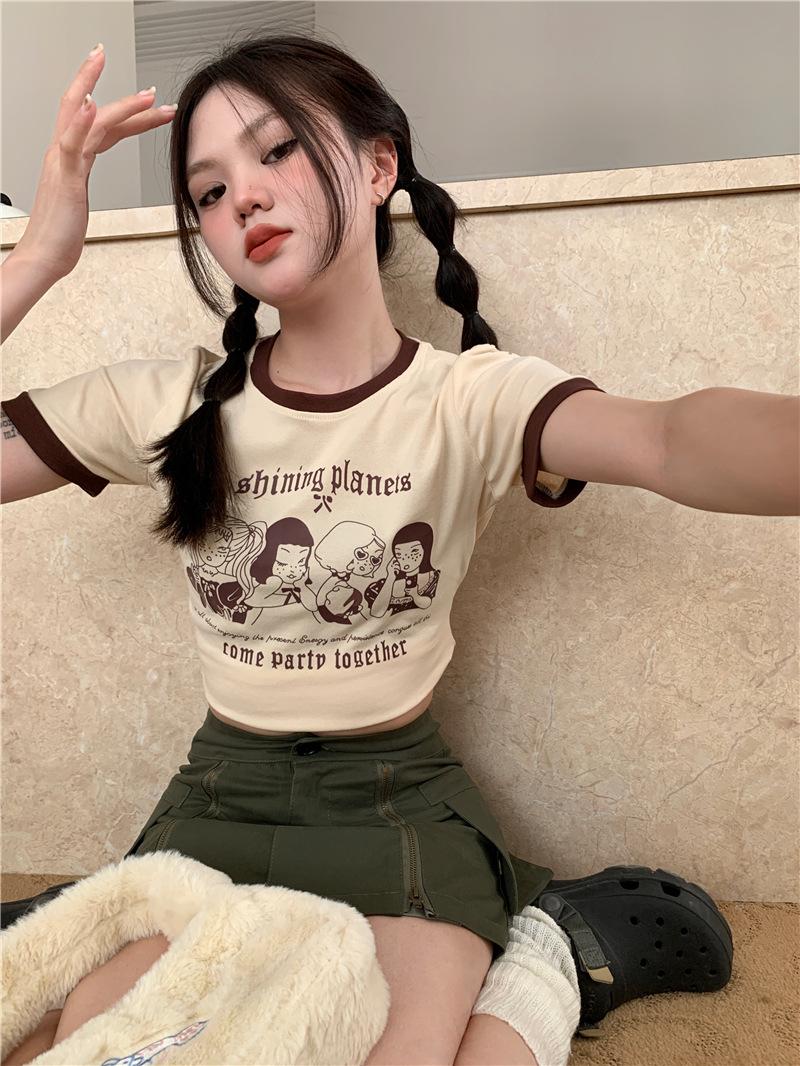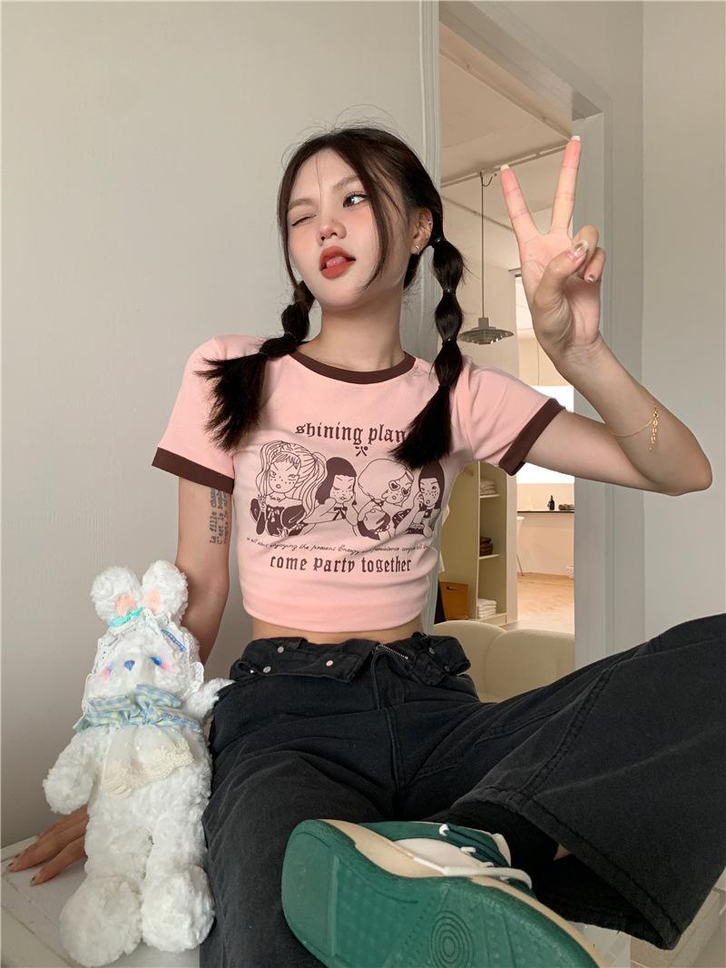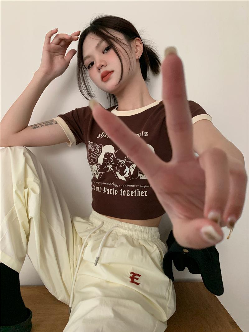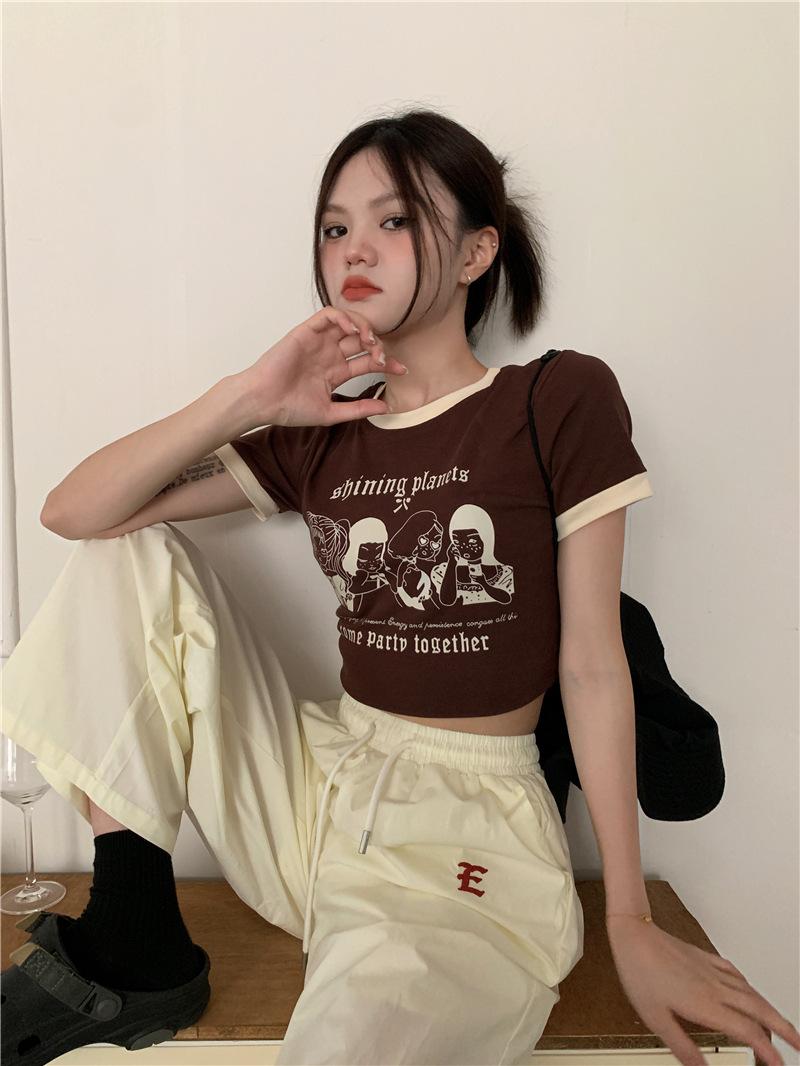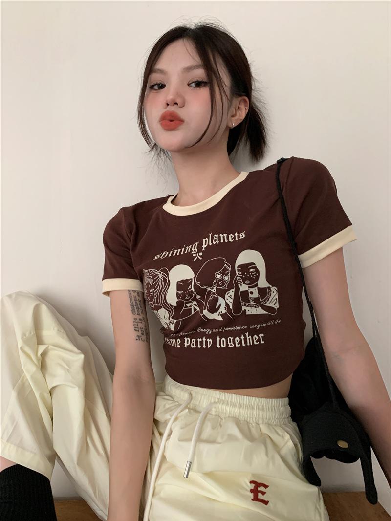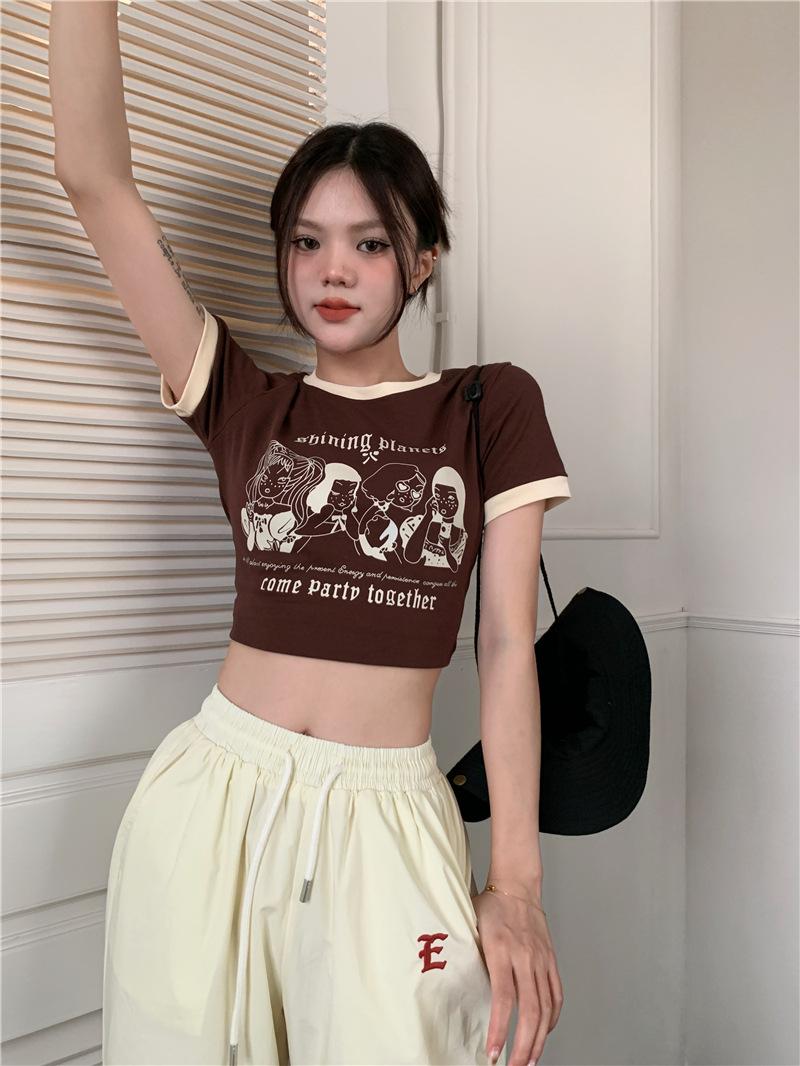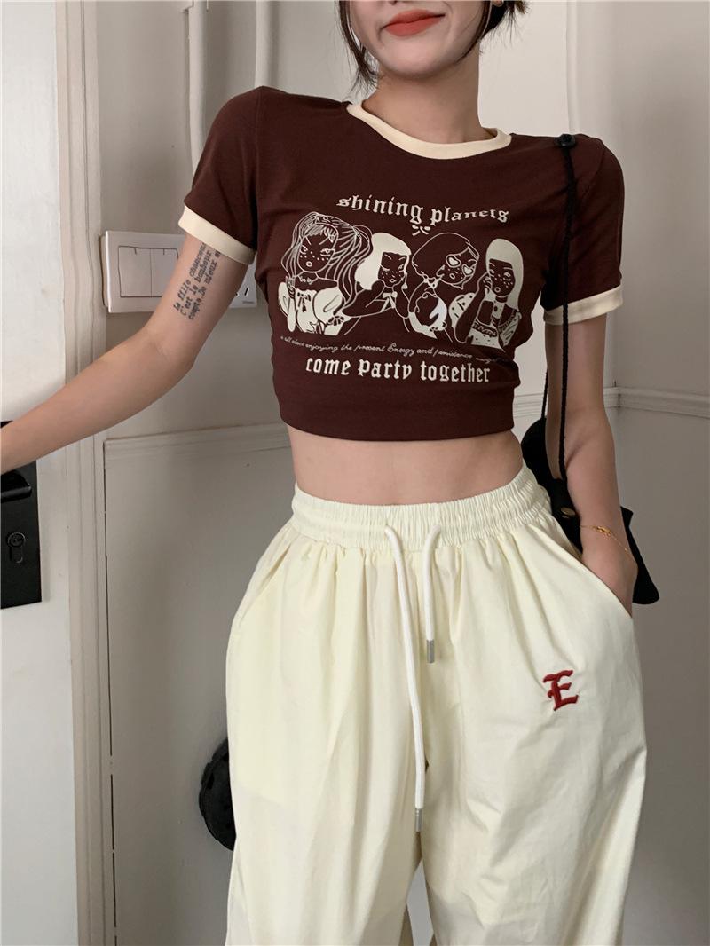 Camiseta con hombros rectos y estampado retro americano para mujer con colores contrastantes, cuello redondo, cintura alta, ombligo expuesto, chica sexy, top ajustado de manga corta para verano