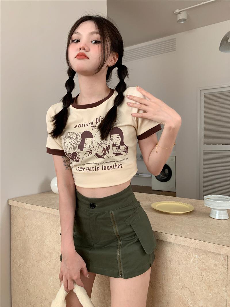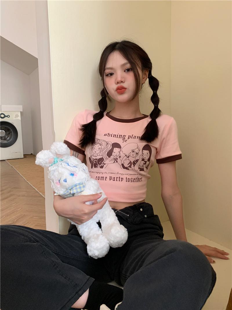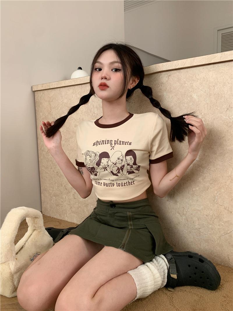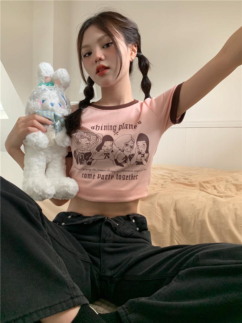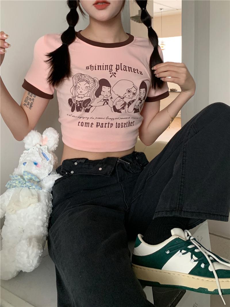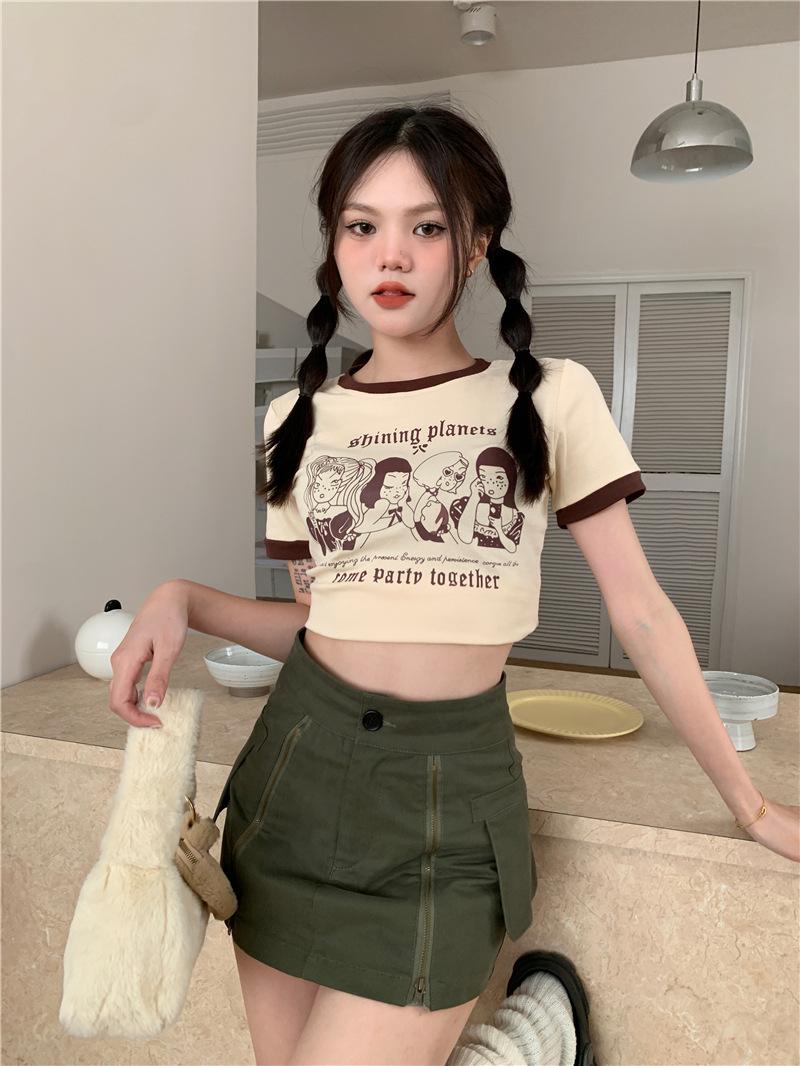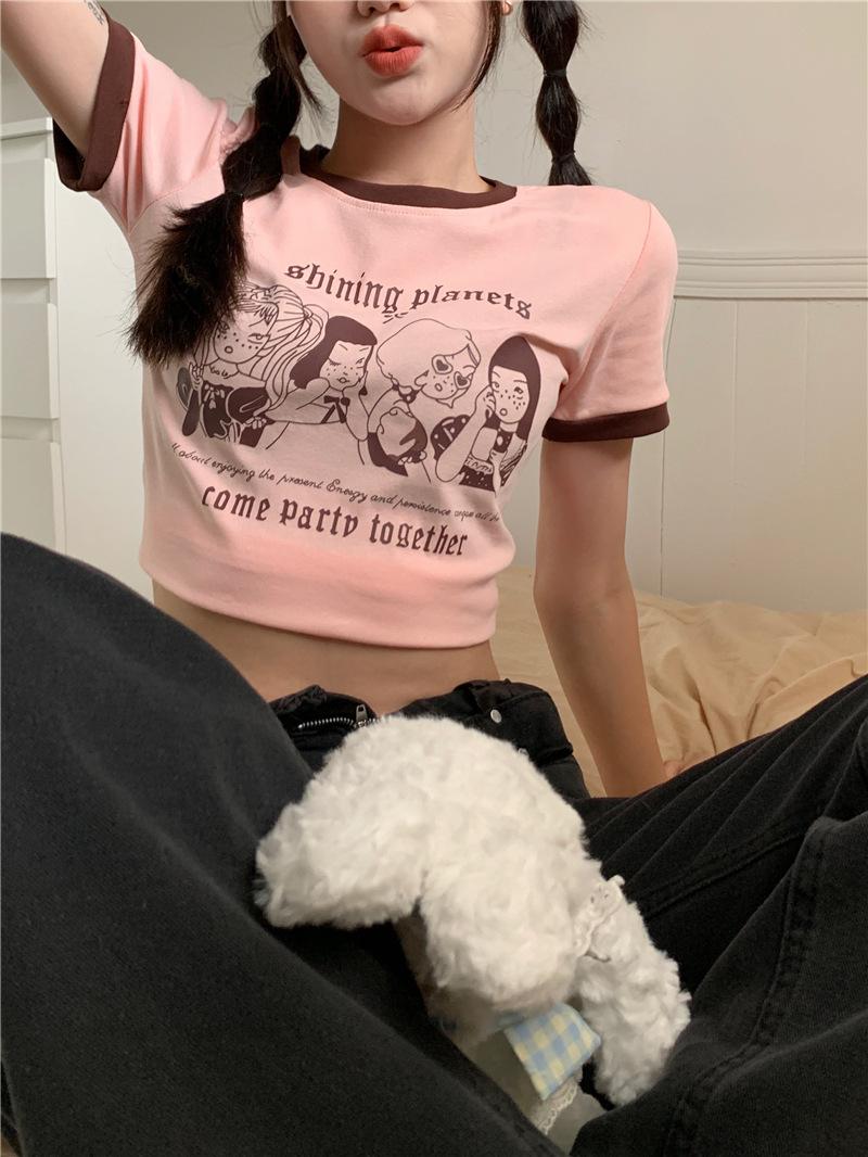 Camiseta con hombros rectos y estampado retro americano para mujer con colores contrastantes, cuello redondo, cintura alta, ombligo expuesto, chica sexy, top ajustado de manga corta para verano